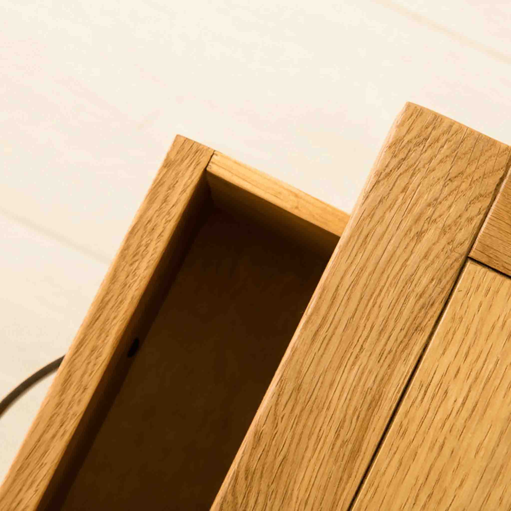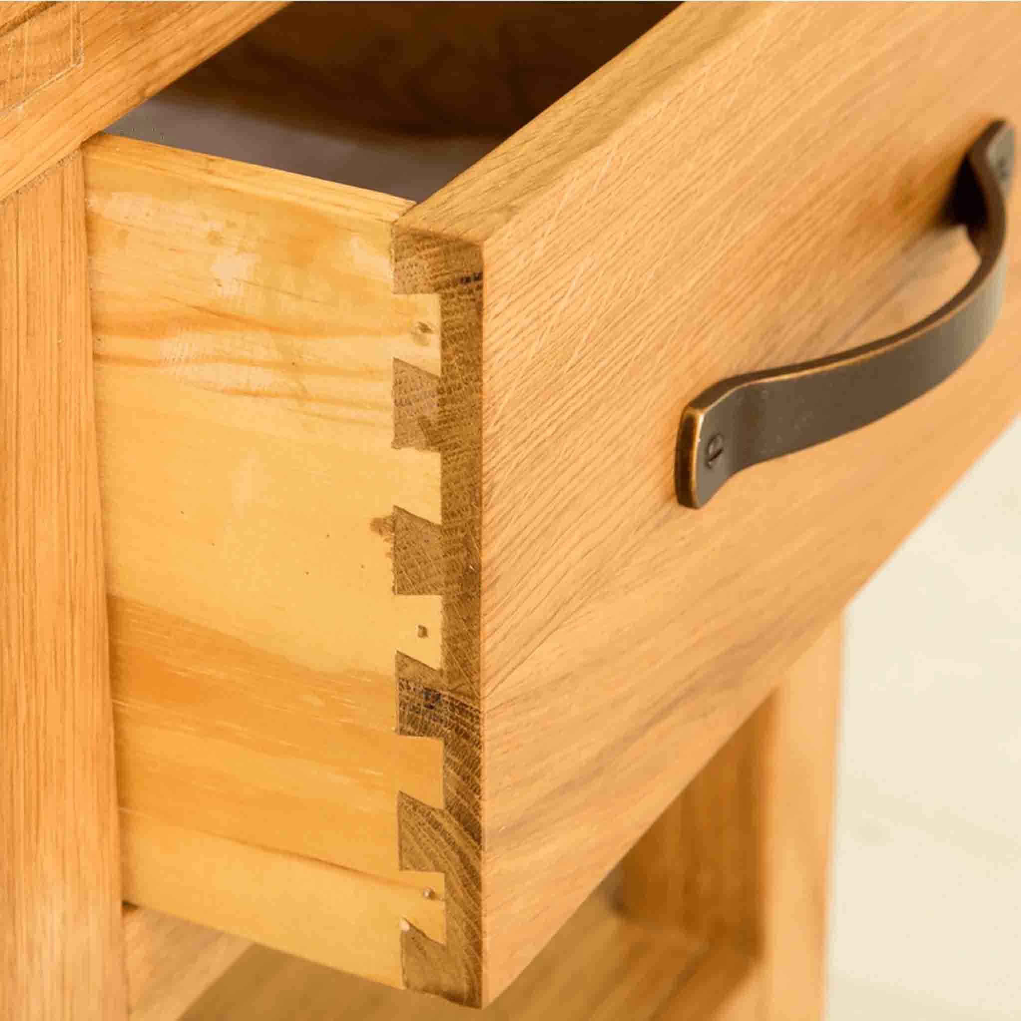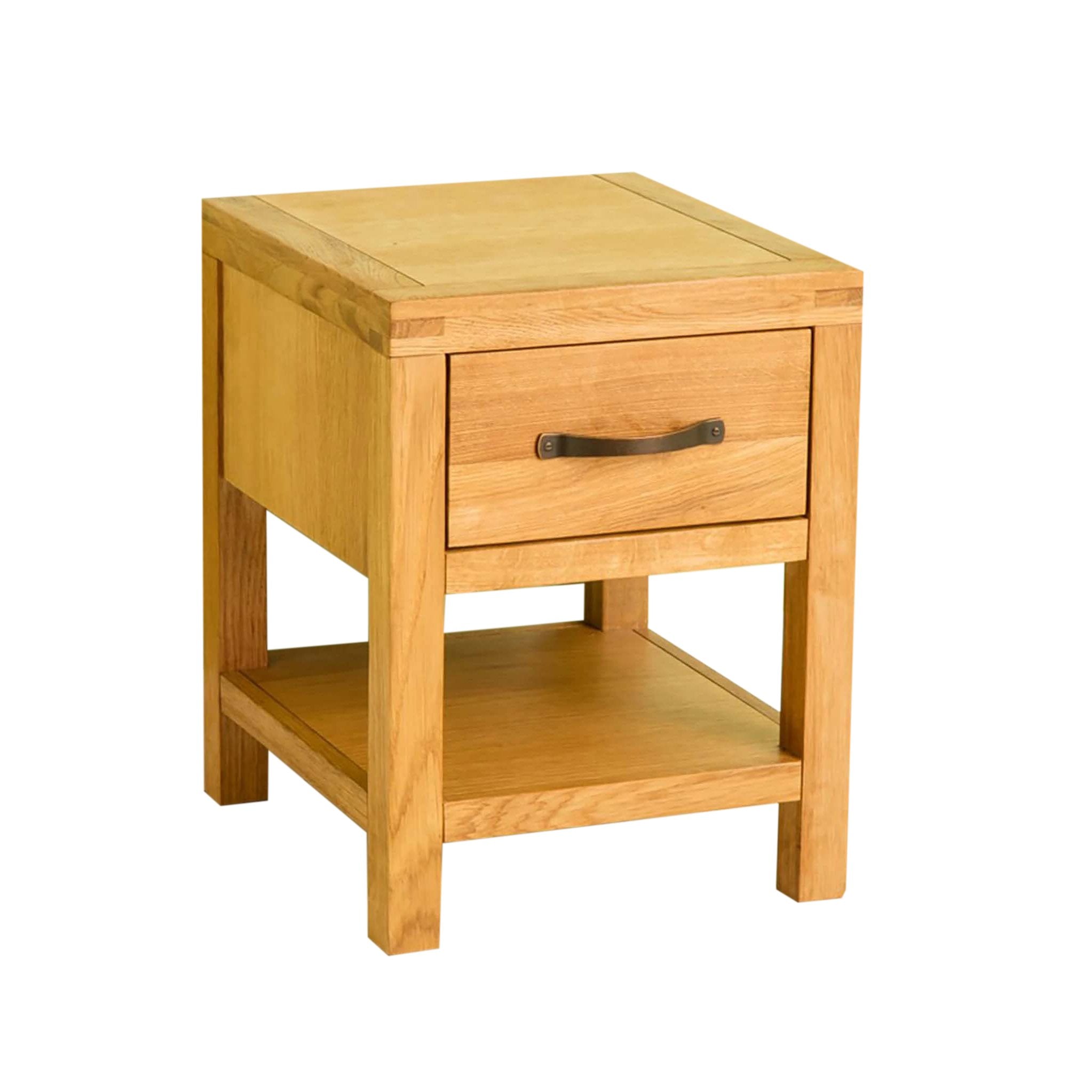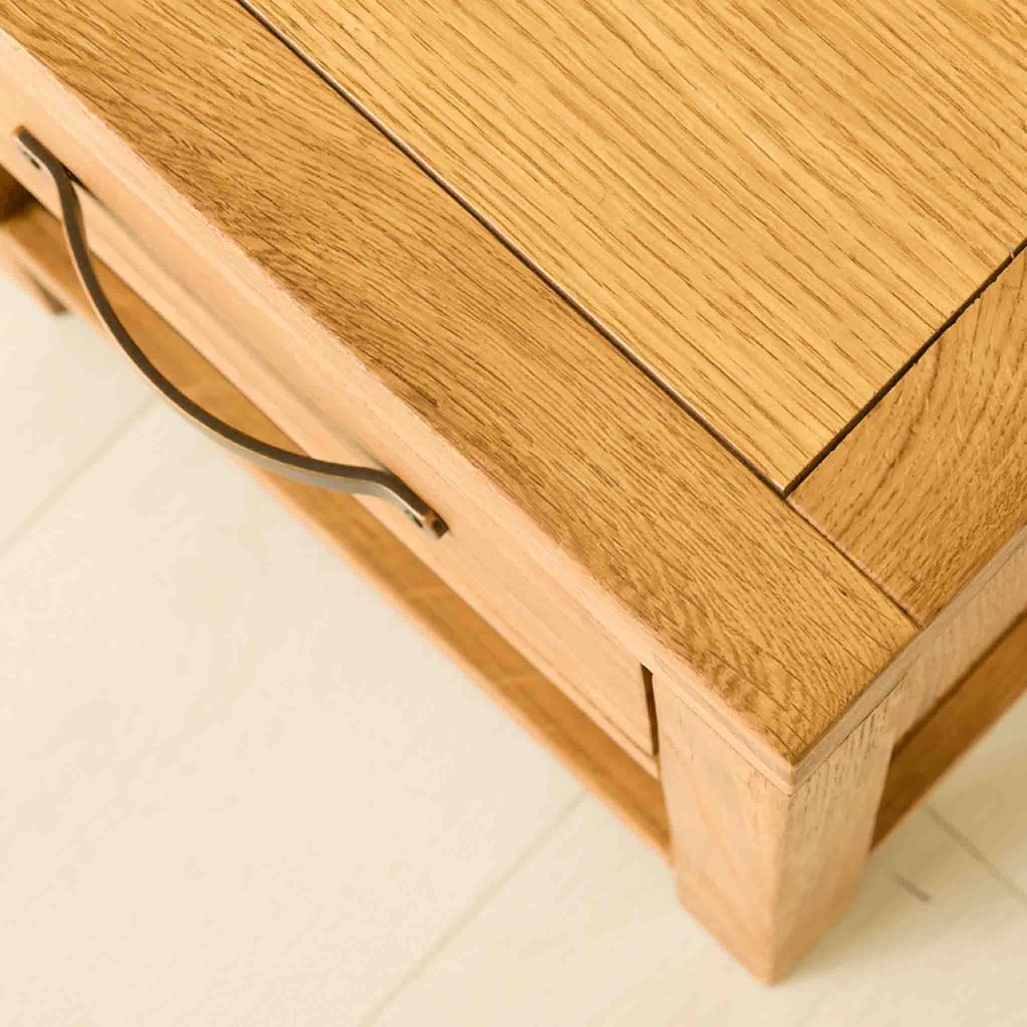 The Abbey Waxed Oak range offers this stunning one drawer lamp table. Crafted with quality oak and solid pine for internals it's designed to add a contemporary edge to your living area whilst providing a certain warmth with the medium waxed finish. The design features tough dovetail joints for the drawers, clean angled edges and brushed metal handles add to the contemporary design.