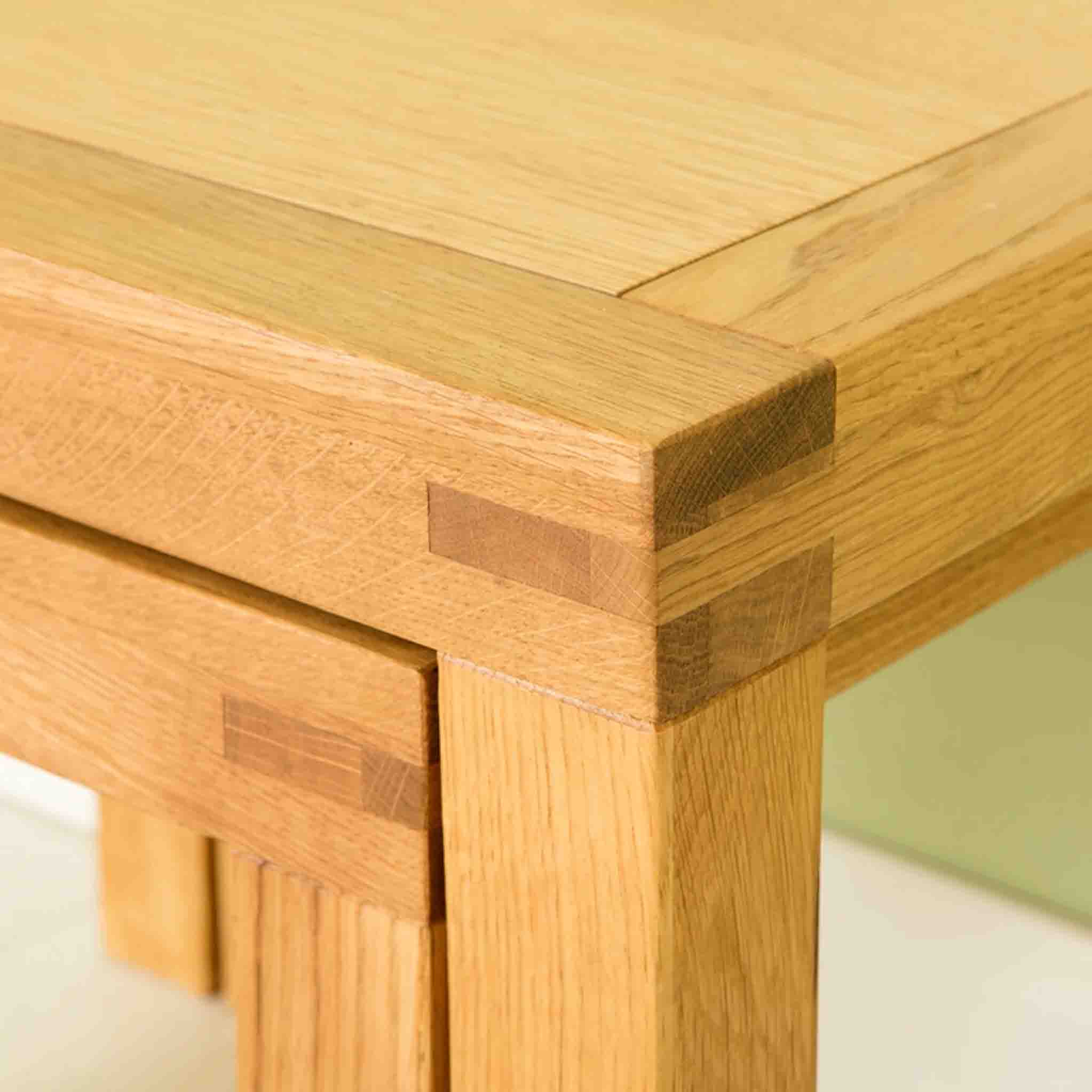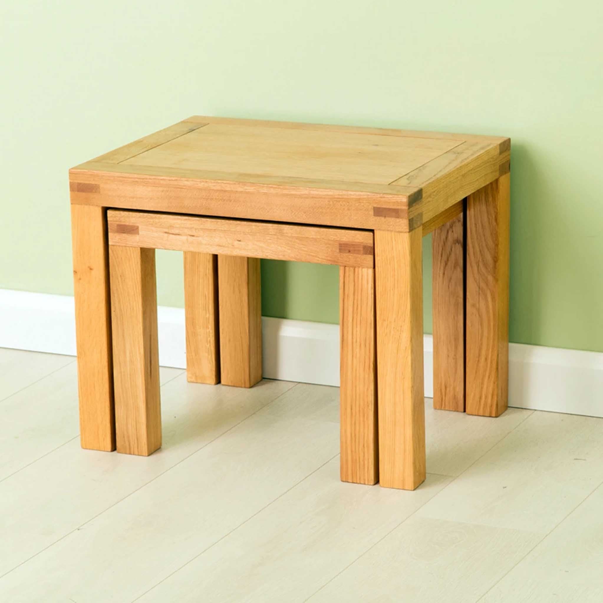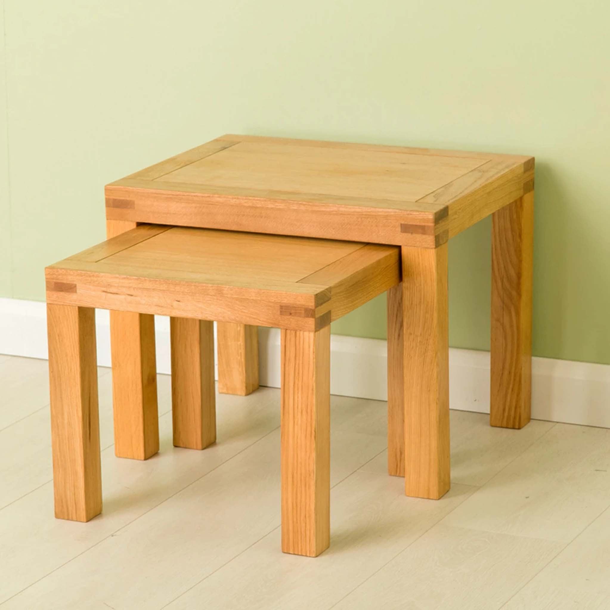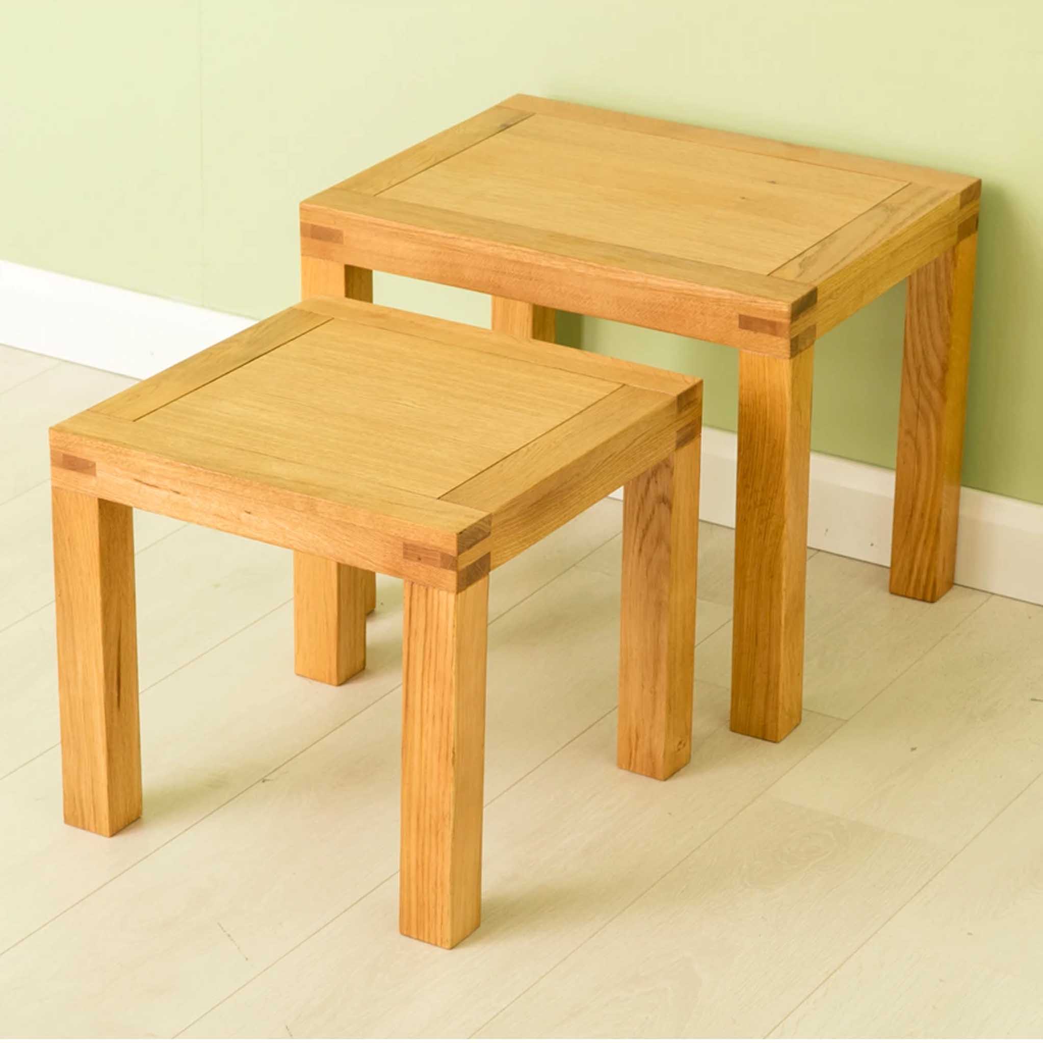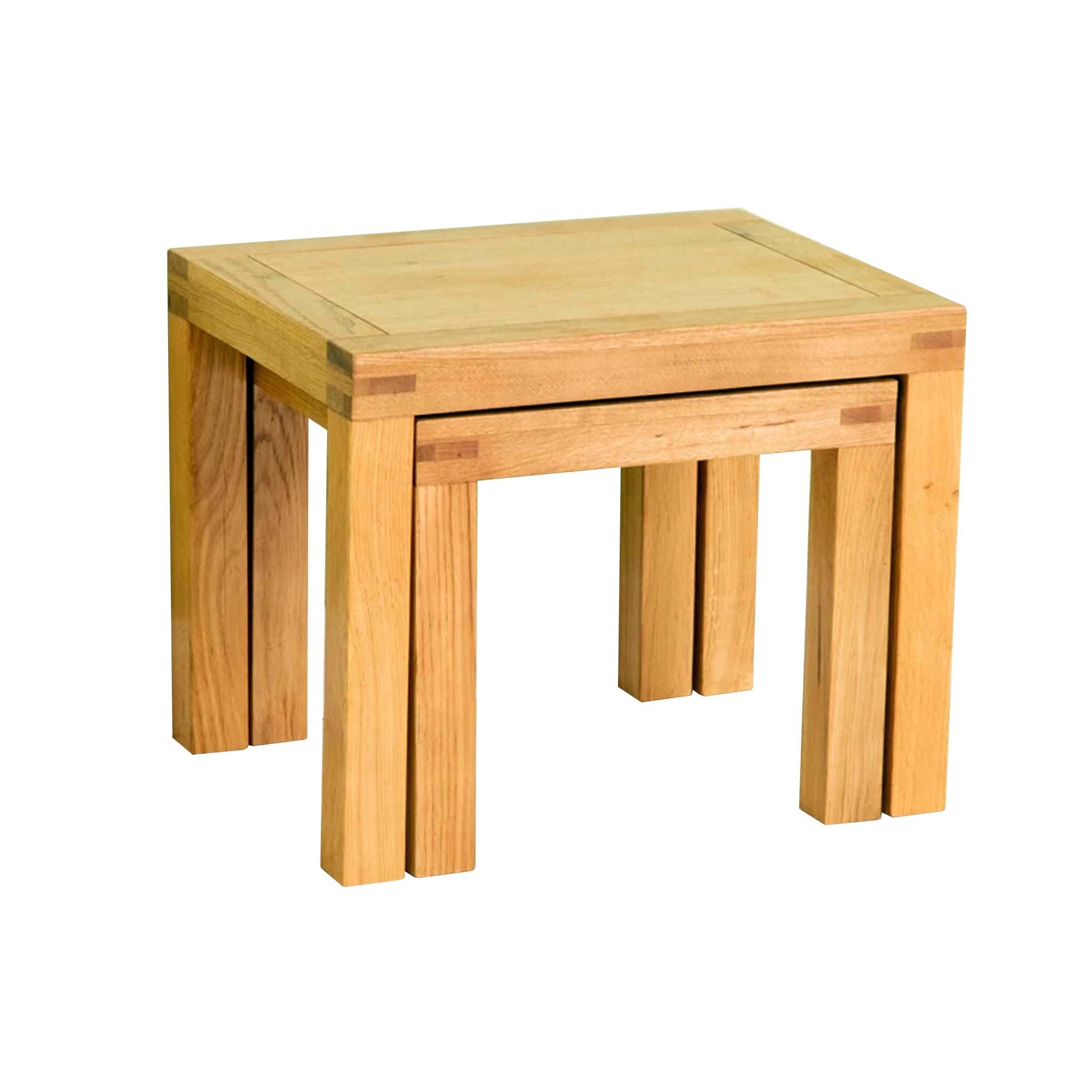 The Abbey Waxed oak range offers this beautiful nest of two tables. Built by hand from quality oak and real oak veneers its designed to add a contemporary edge to your lounge area whilst providing a warm depth of colour with the medium waxed finish.