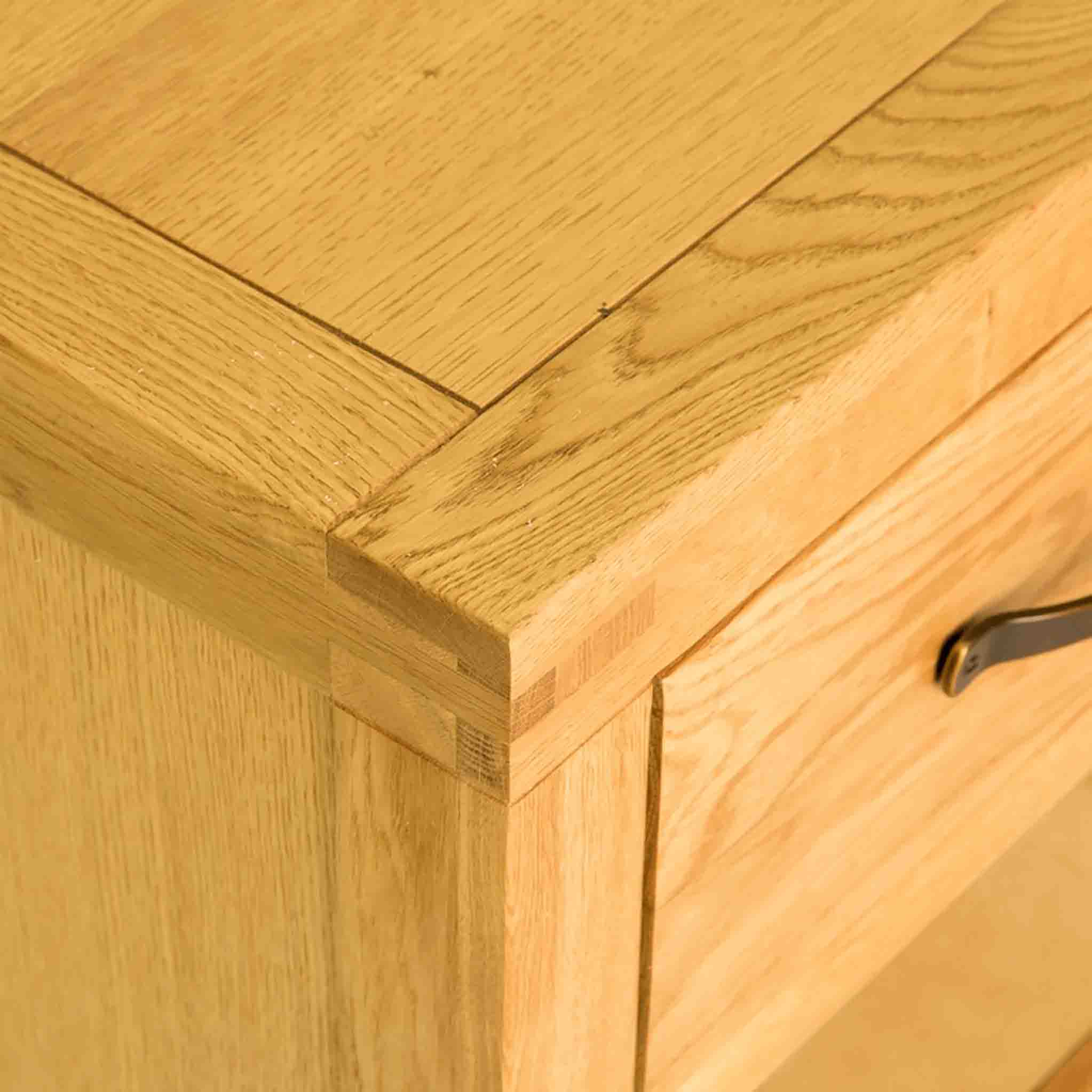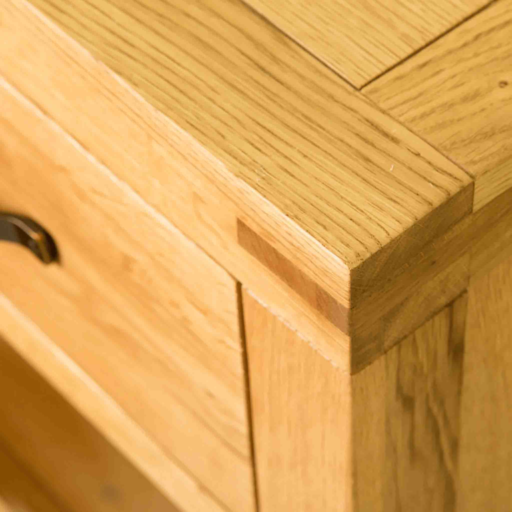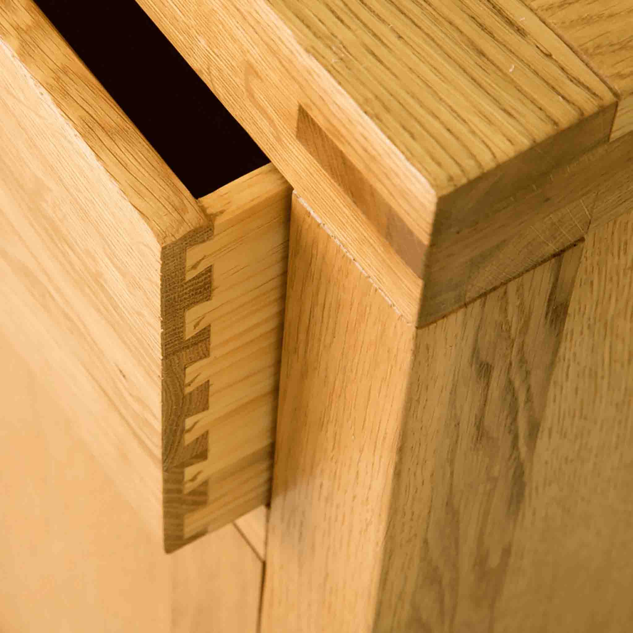 - Constructed from solid wood and real oak, it features beautiful exposed tenon joints on the top and dovetail joints on the drawers.