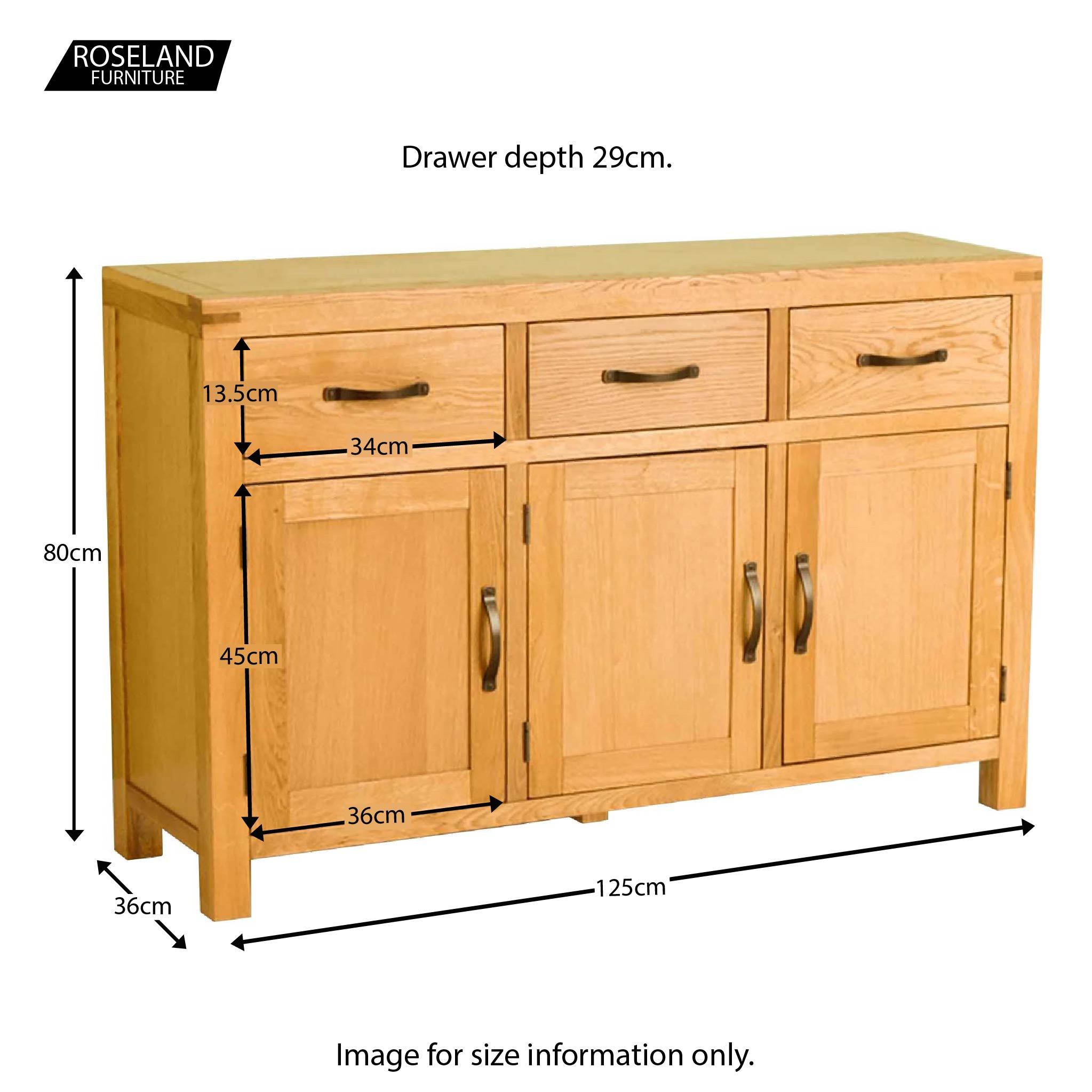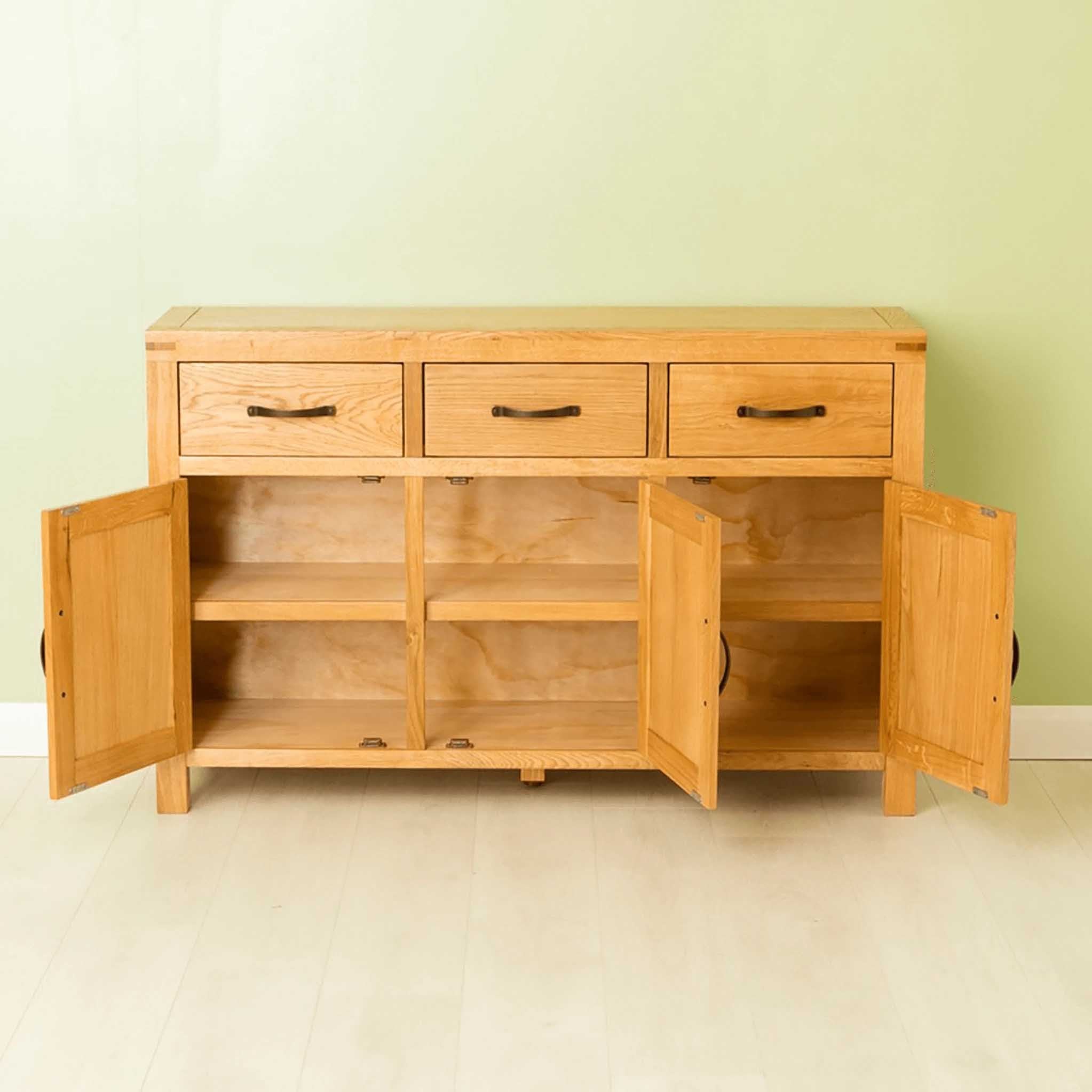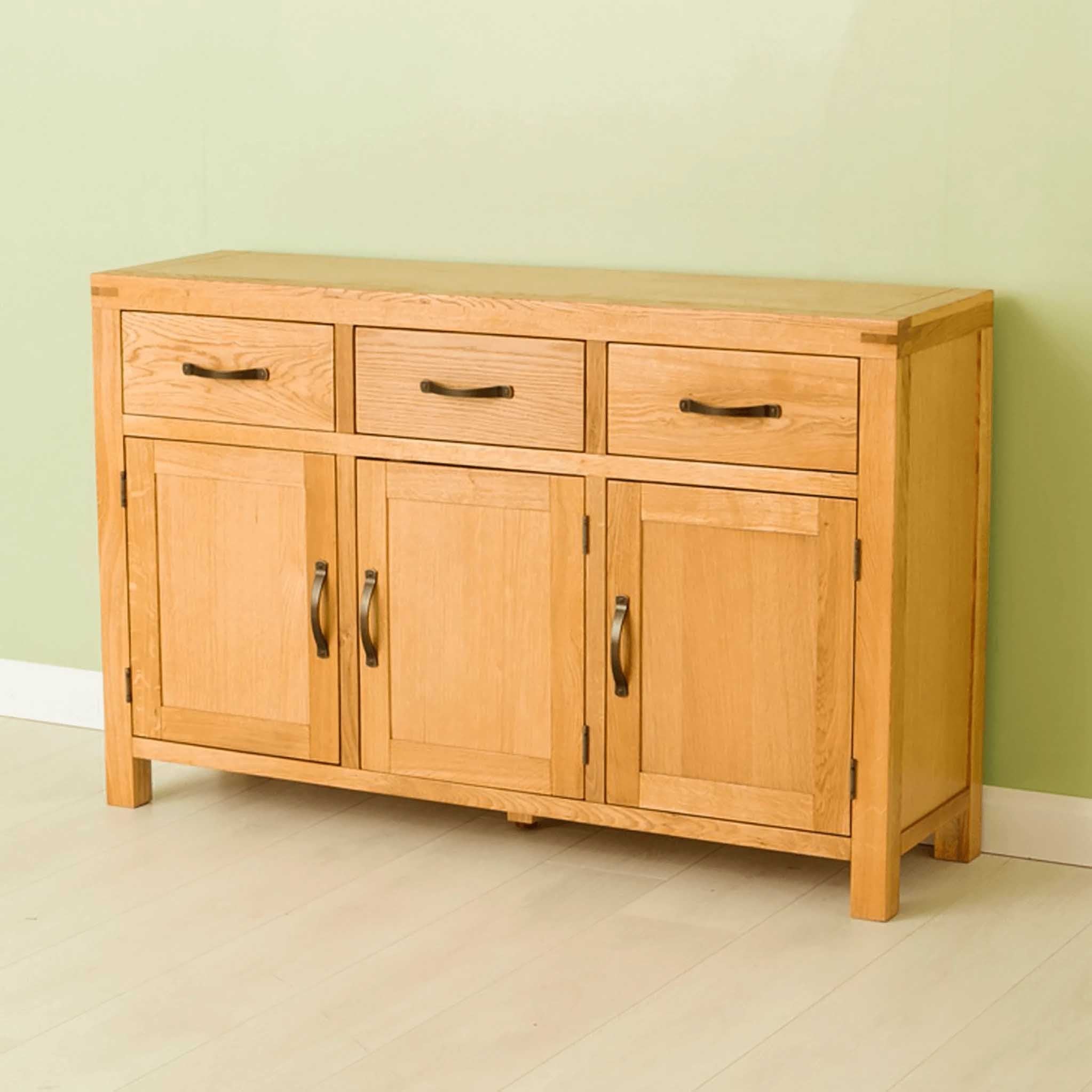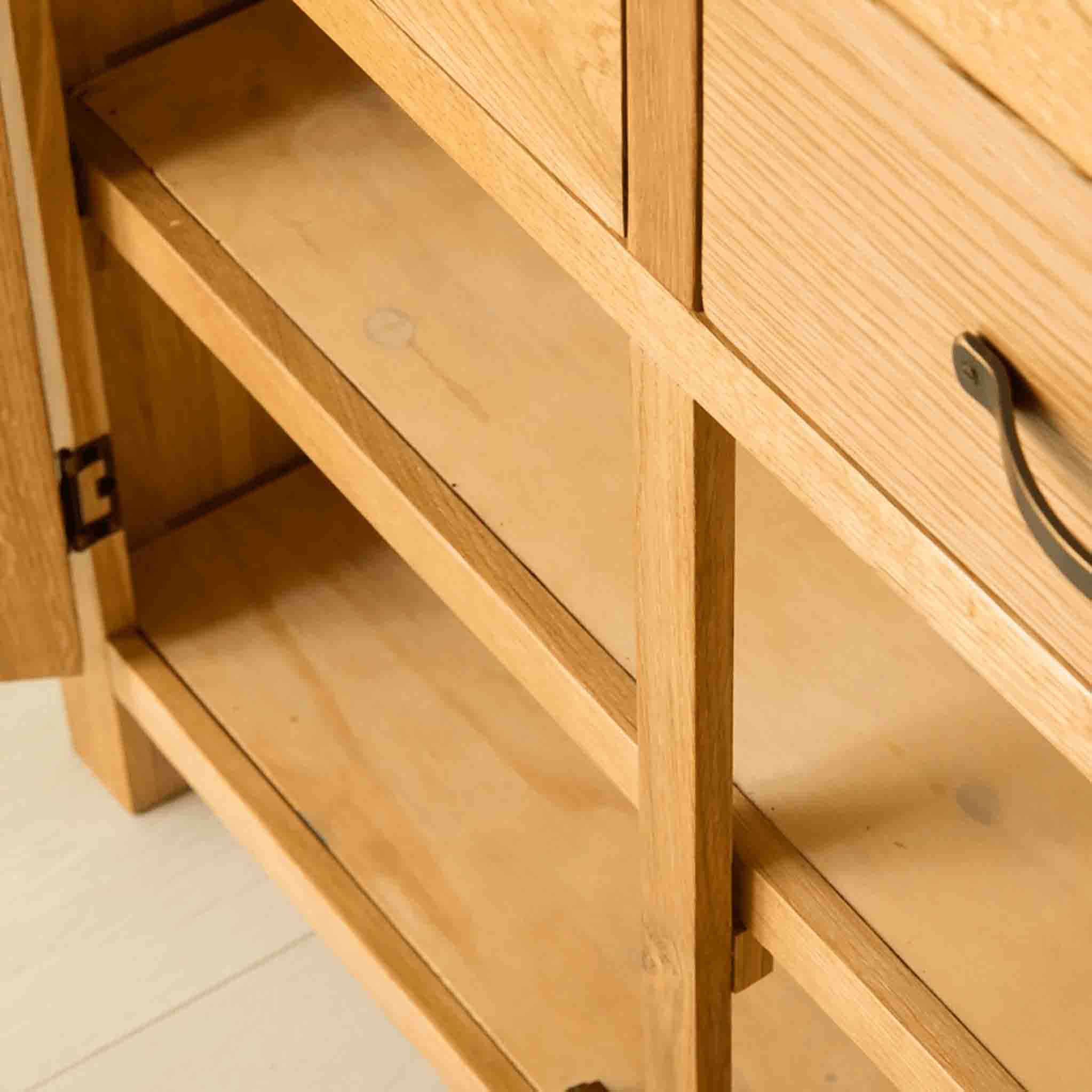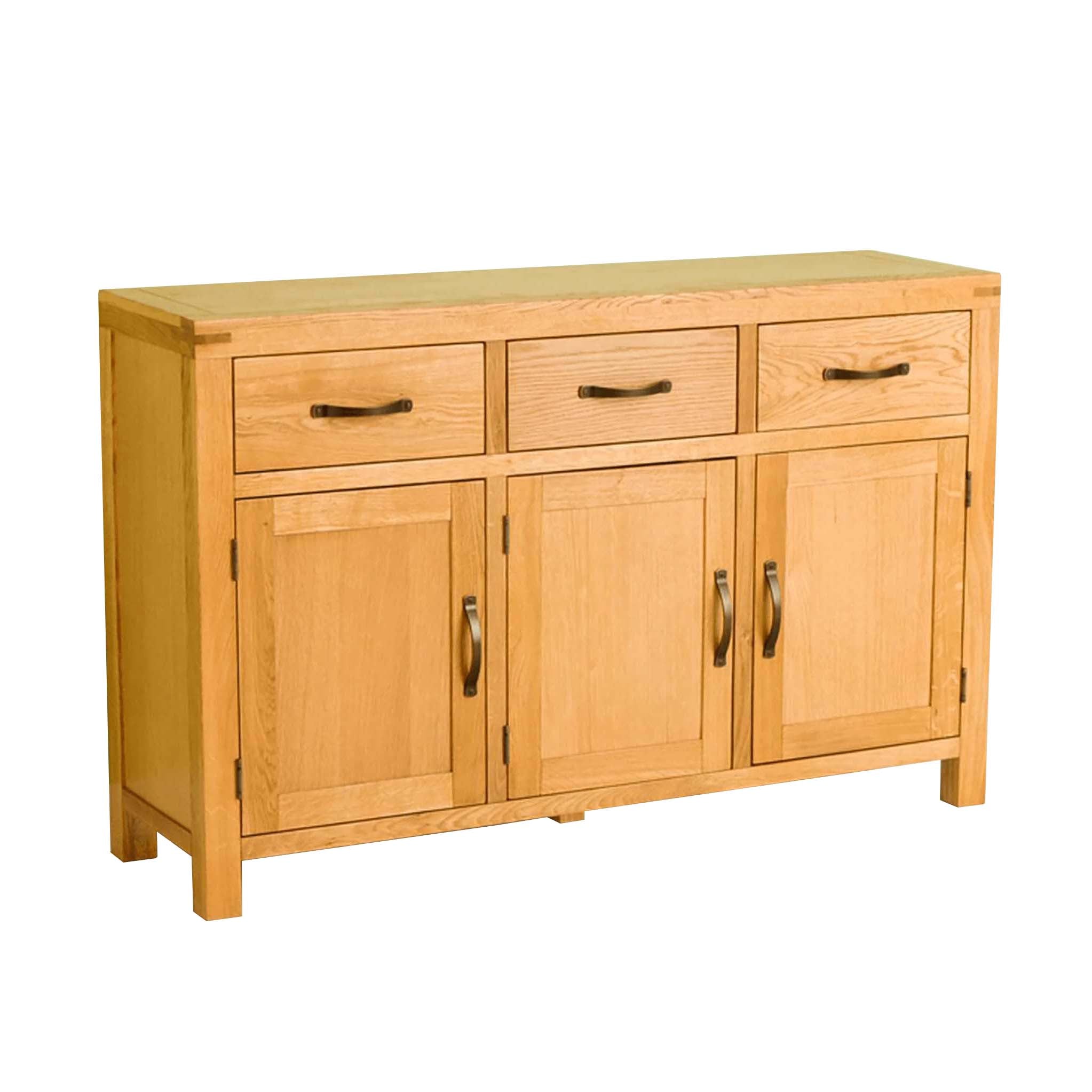 The Abbey Waxed oak range offers this stunning three drawer three door sideboard. Constructed in quality oak and featuring pine for the internal sections. This stylish sideboard radiates a warm oak colour which will brighten up any area its placed in around your home. The modern finish with the exposed tenon joints provide the perfect cross of traditional and modern styles.