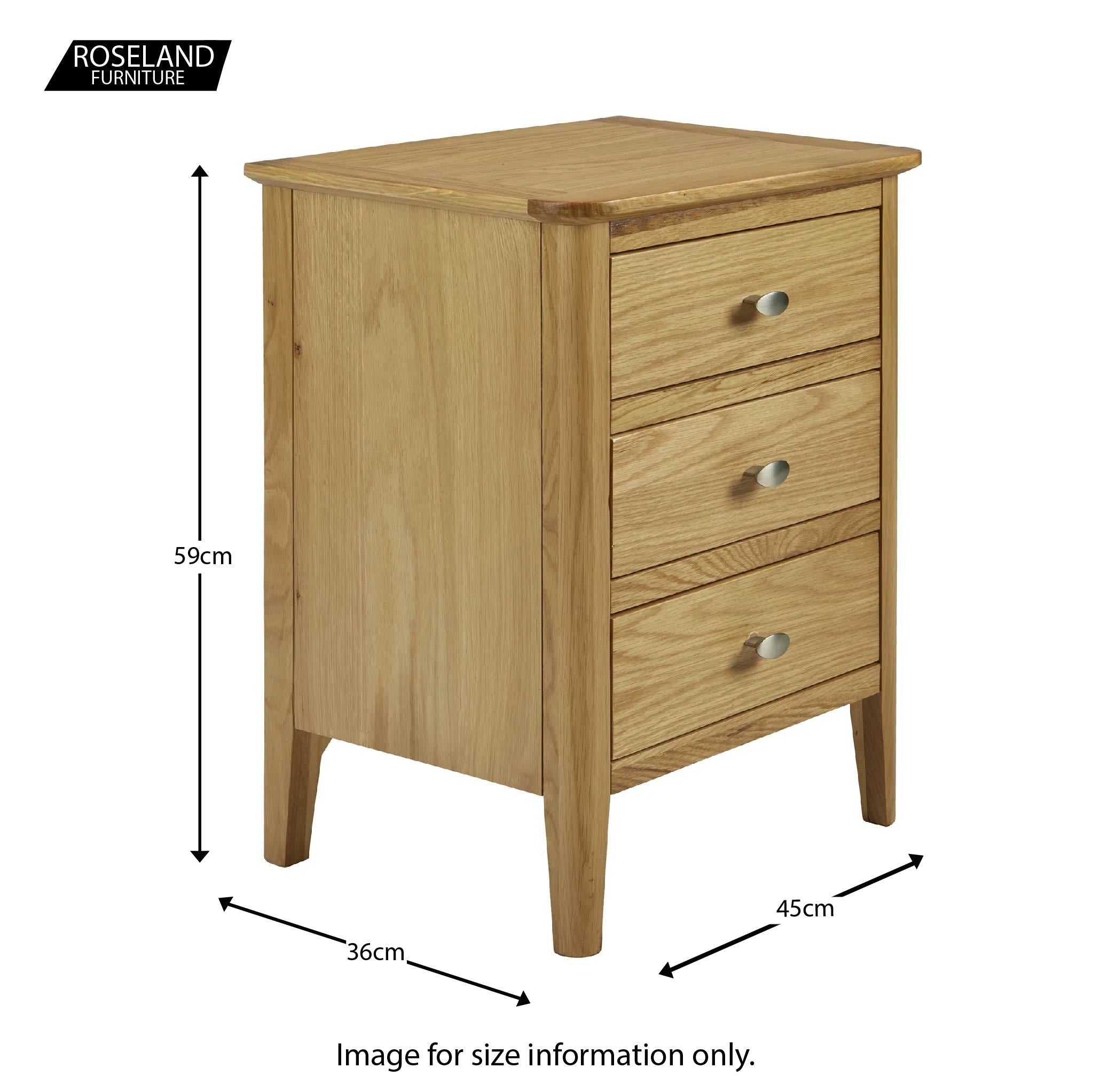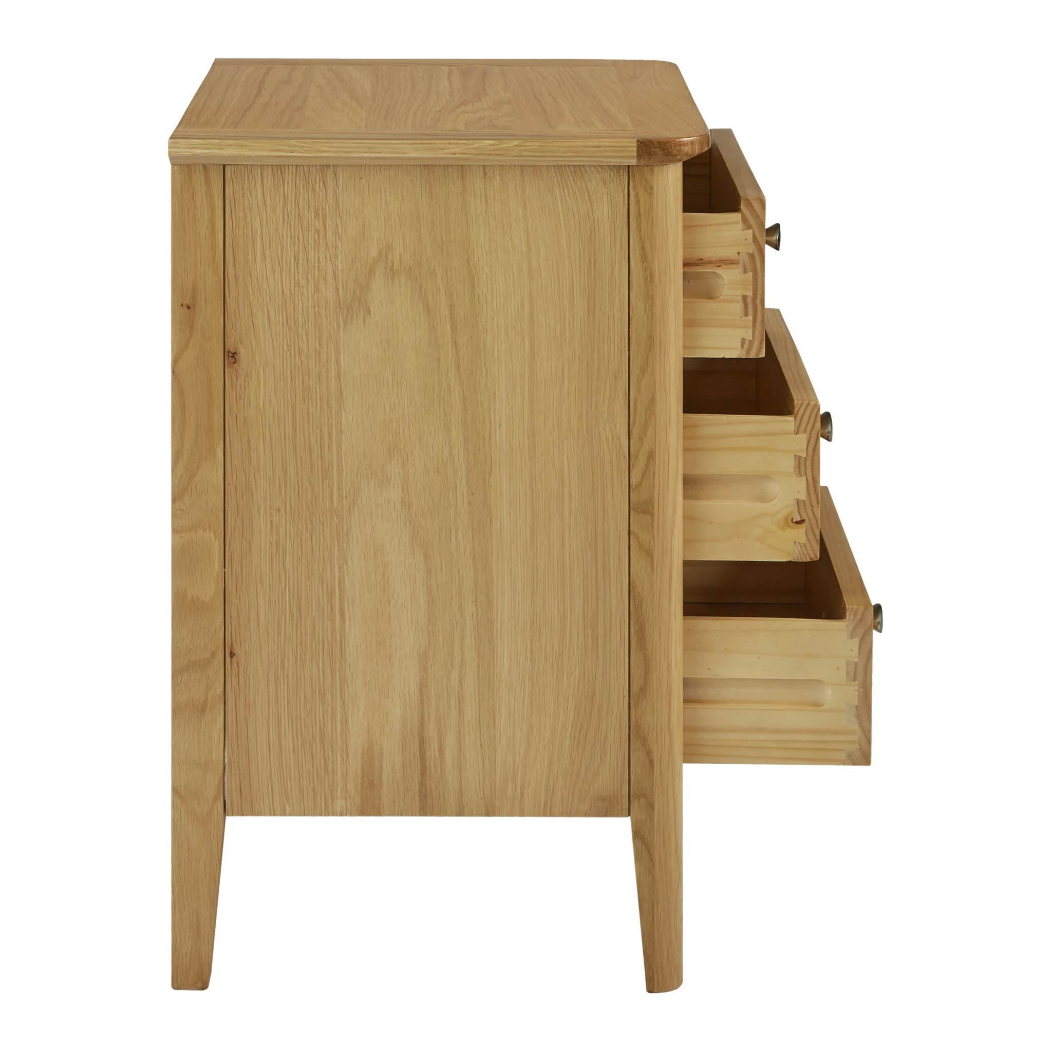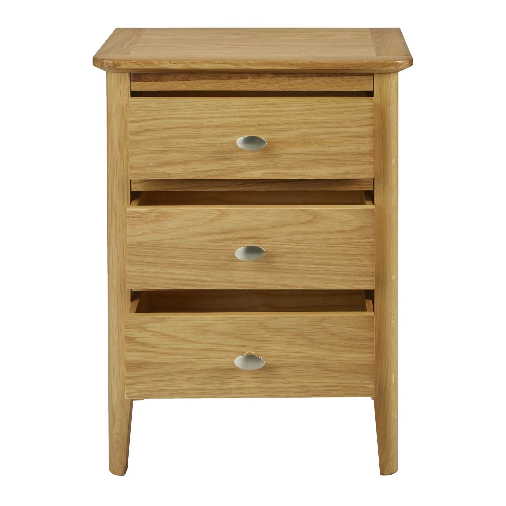 This three drawer bedside cabinet is an attractive addition to any room. The drawers are spacious and have dovetail joints with solid metal handles. Quality you just don't expect at this price; the light oak with clear lacquer finish is easy to maintain and works well with items from many of the other ranges.