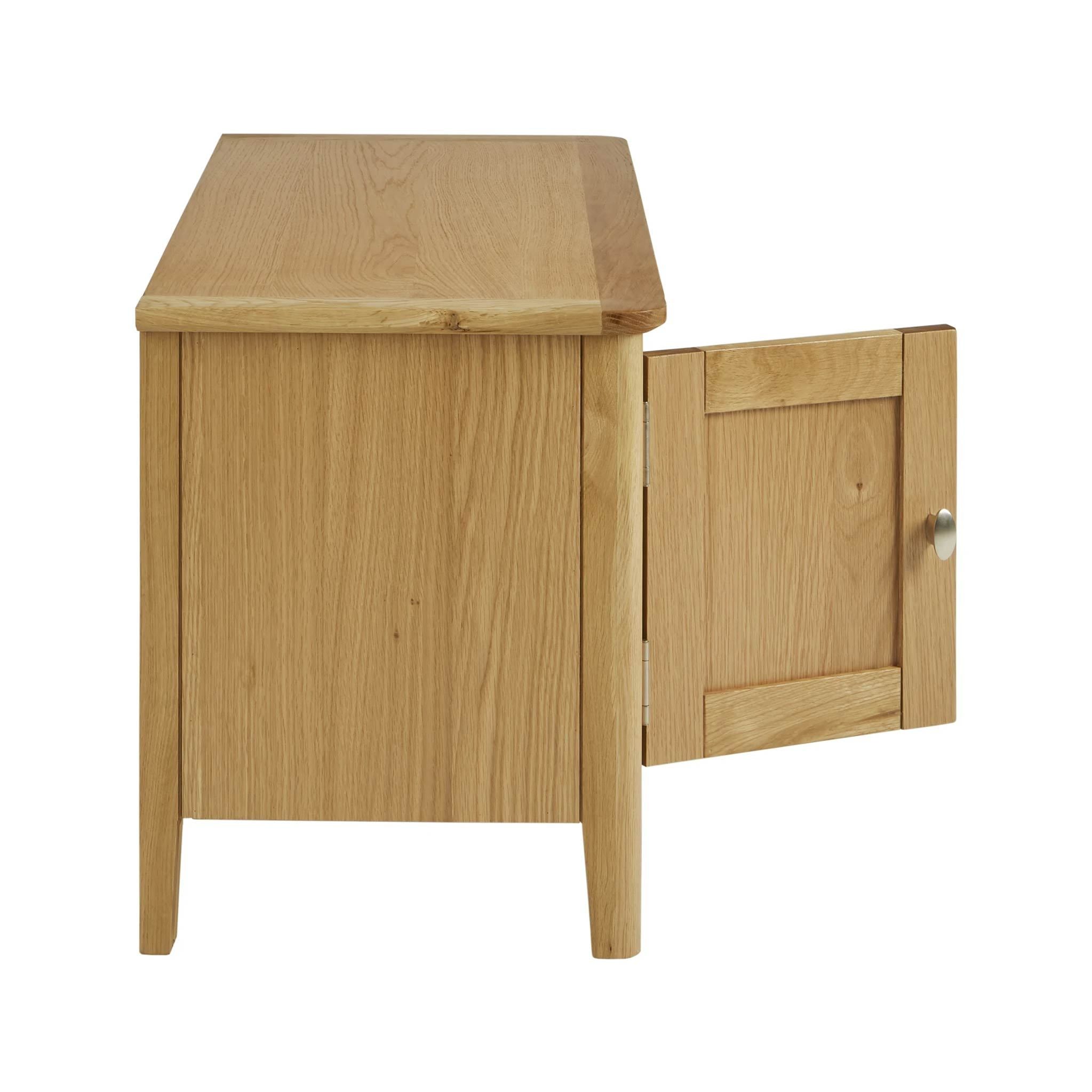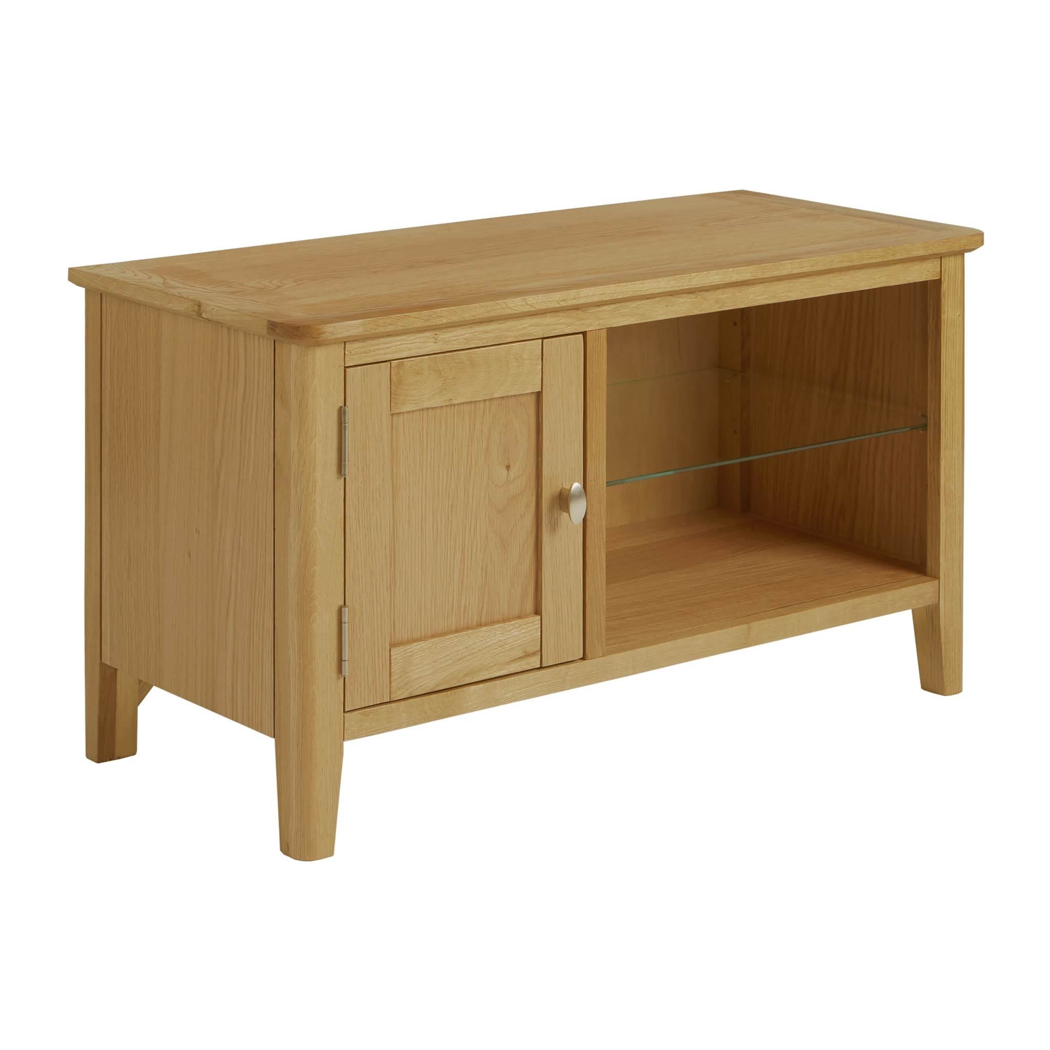 This Small TV stand features a large cupboard providing ample space to store DVDs, CDs and other accessories. Built from oak and carefully selected oak veneer with pine for its internal sections this TV stand allows for a large TV. There is a cable hole in the back to ensure your wires are neatly tucked away. Its light oak colour carries a contemporary style which is becoming increasingly popular.