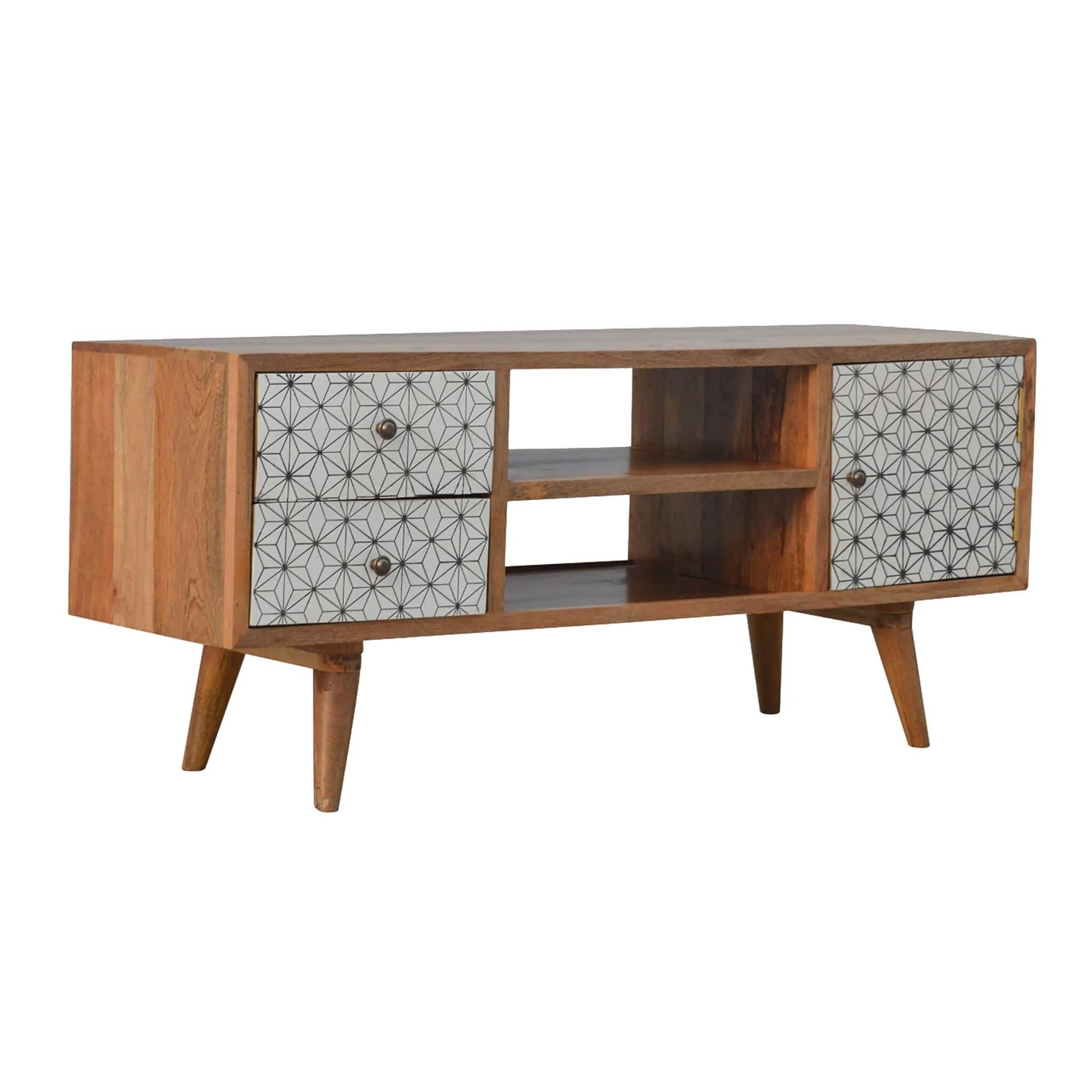 This 2 drawer media unit has been constructed from 100% solid mango wood with finish that would allow it to blend with oak items. The main feature of this piece are the screen printed drawer fronts and cabinet door which each have a beautiful black and white geometric design giving the piece extra dimension and character. Useful storage is provided with the open slots and drawers that can be used to store any remotes , films or extra cables. It also features 4 Nordic style legs and ample space on top for TV’s up to 44’’.