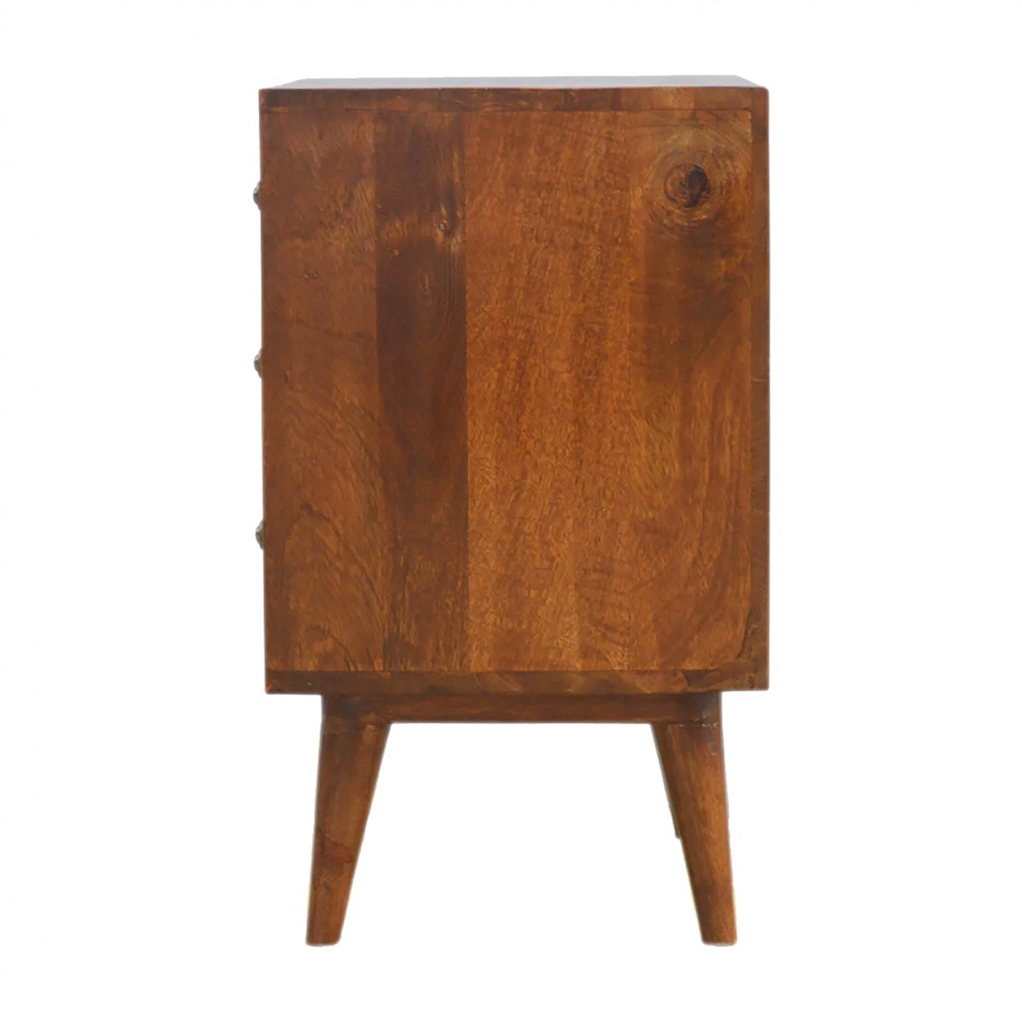 This bedside is endlessly versatile and will prove handy all over your home. It has been constructed from 100% solid mango wood in a beautiful chestnut finish. The main feature of this design are the brass inlay drawer fronts which have a very unique zig-zag pattern, complimenting the darker wood finish nicely. Some other features are the 4 Nordic style legs and 3 spacious drawers for storing away any bits and pieces before bedtime. The perfect addition to any home.