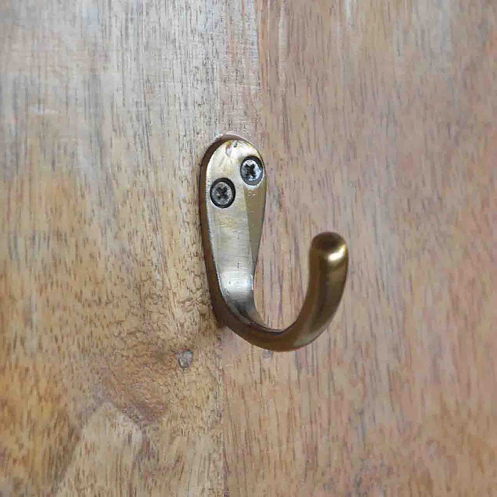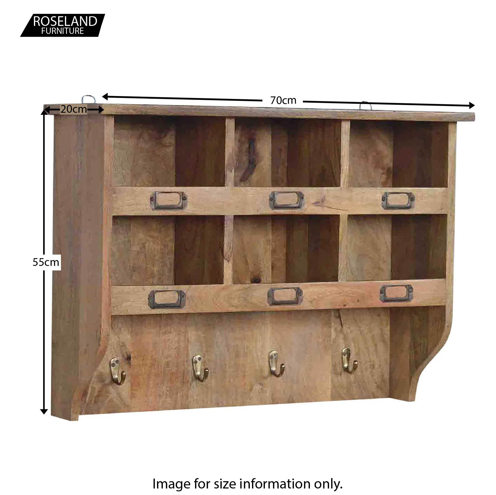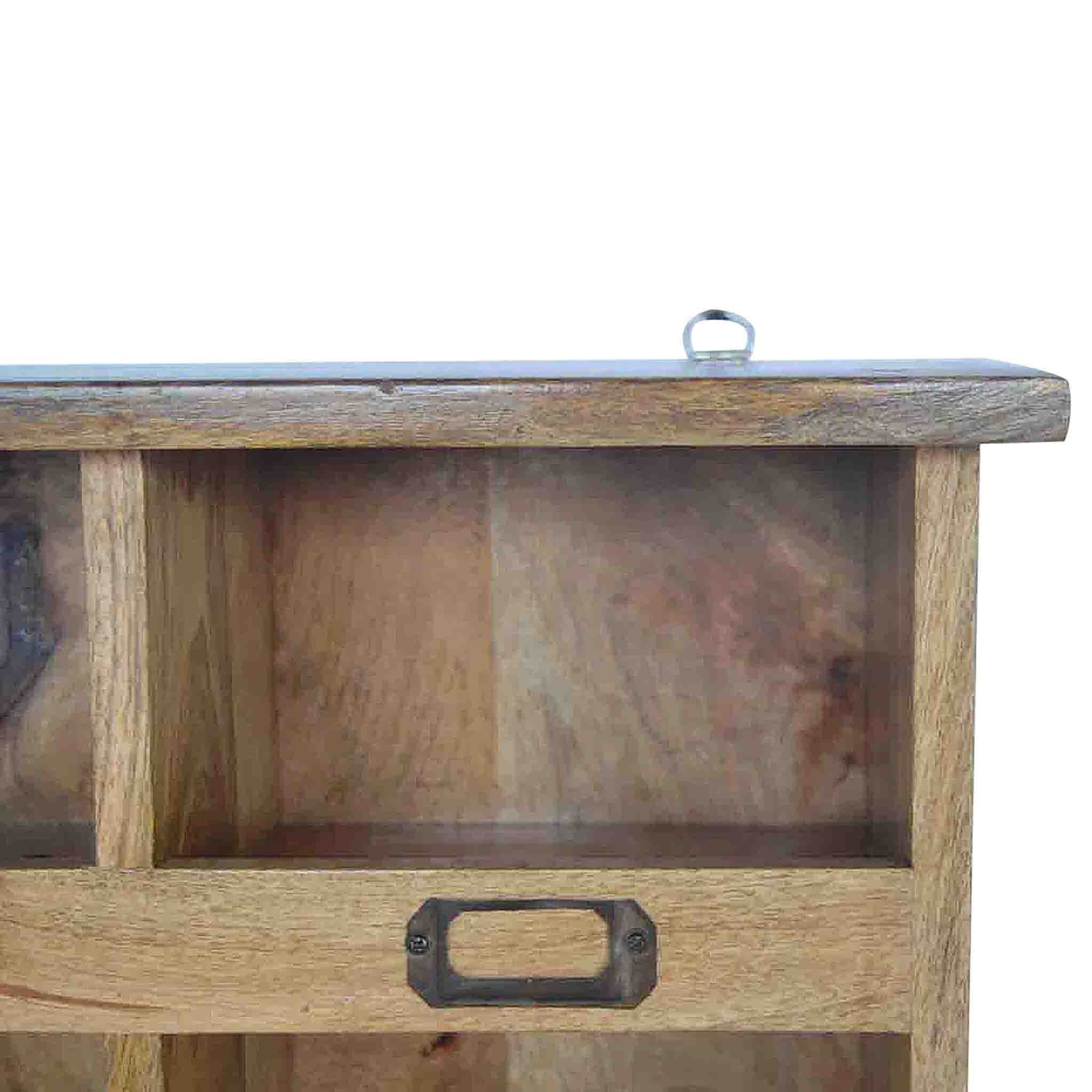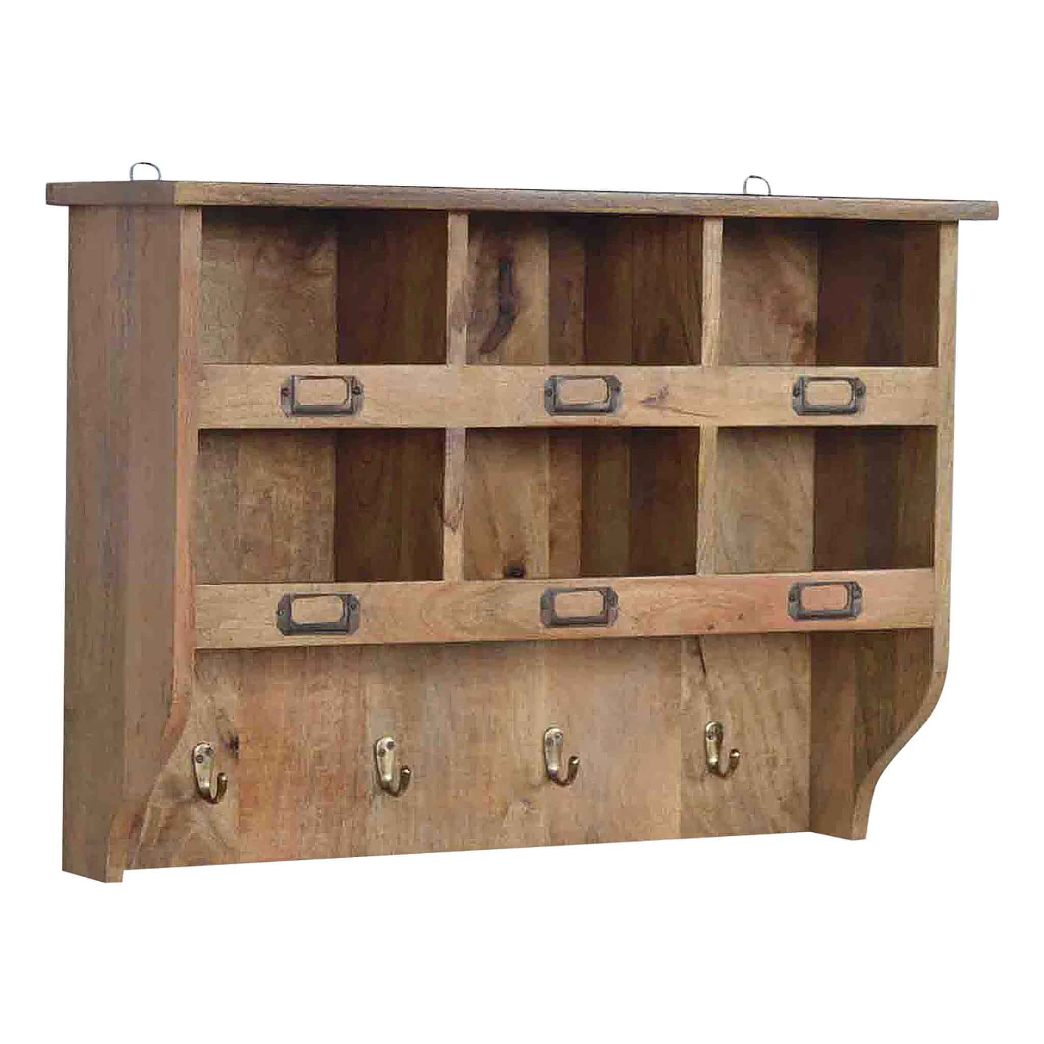 The Hook and Hide Wall Shelf Storage Unit doesn't require any floor space and can be hung above a console or bench using subtle eye hooks. Made from 100% solid mango wood with antique brass handles and with oak-ish finish the unit offers four hand forged antiqued brass hooks and 6 label inserts.