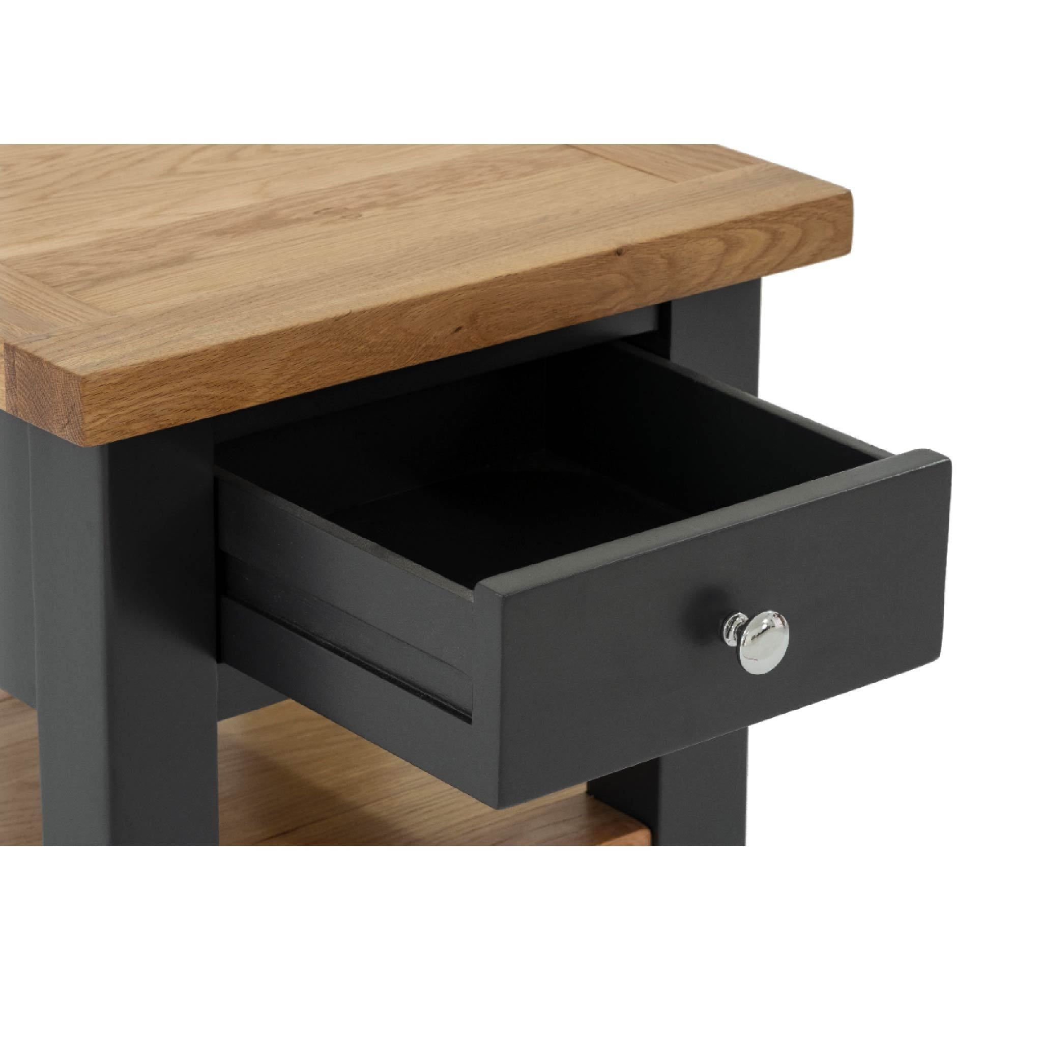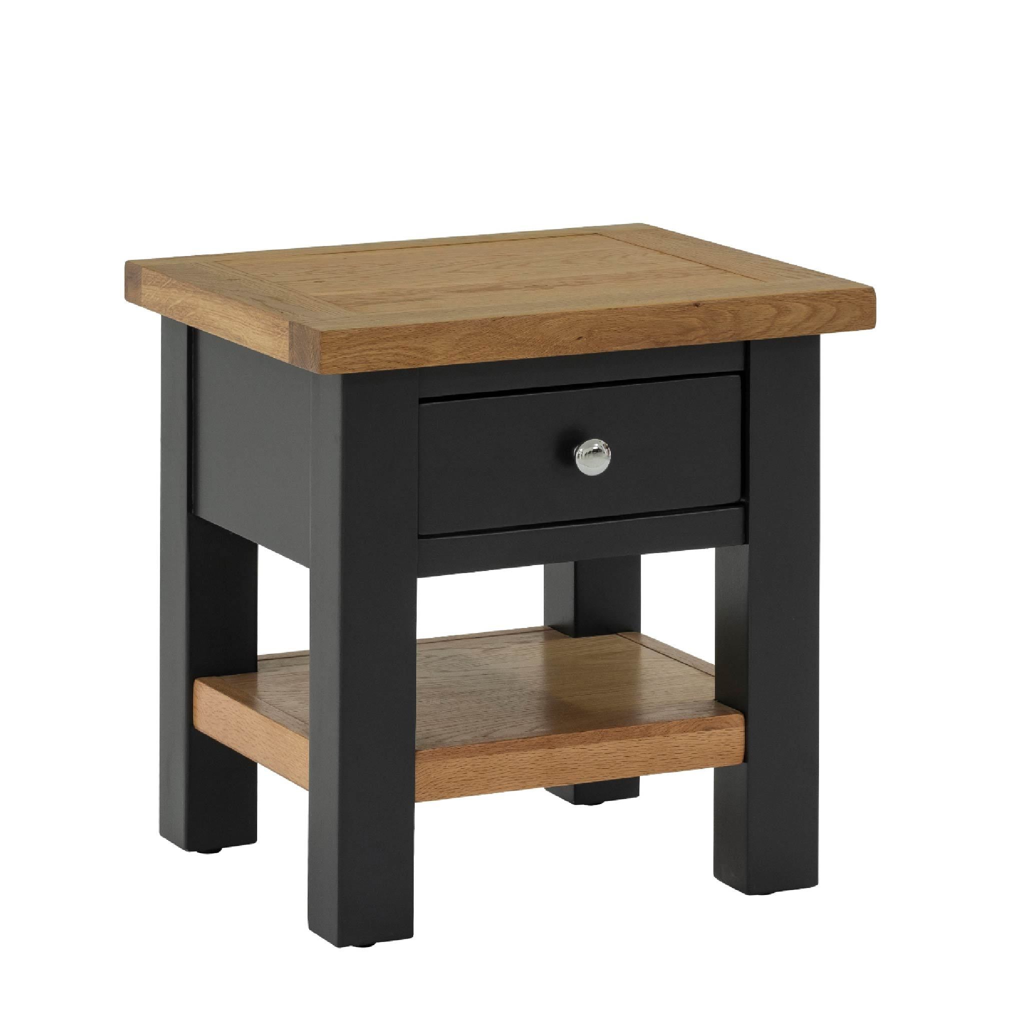 This lamp or side table with drawer is the perfect finishing touch to the living room. Finished in a beautiful, rich black paint with a contrasting oak top, it will add some real character to the room.