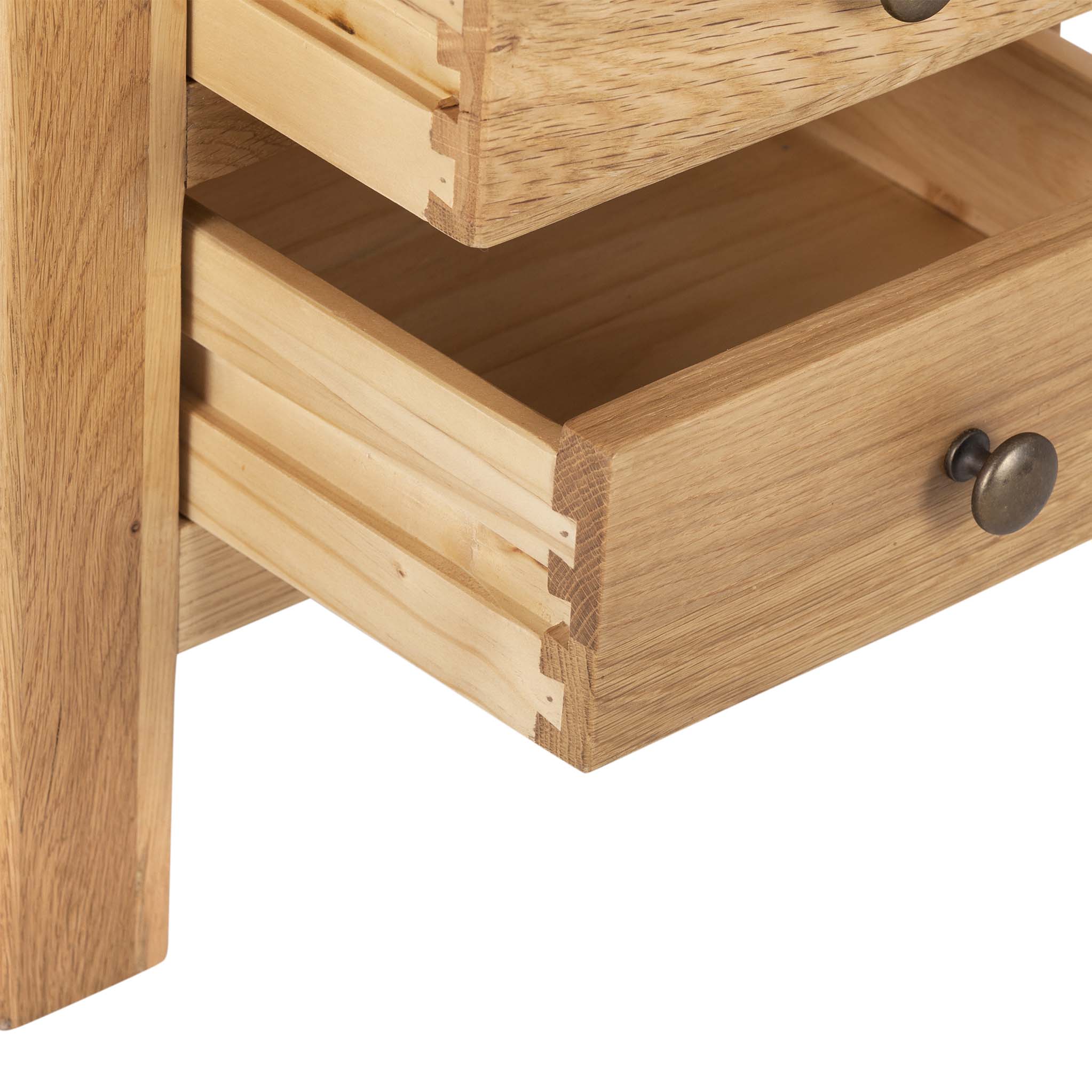The Charlestown Oak collection is ideal for those smaller spaces but will work well in any size room. Expertly constructed from solid oak and solid wood this range features golden-oak tops, wooden drawer runners and brass coloured metal round handles.