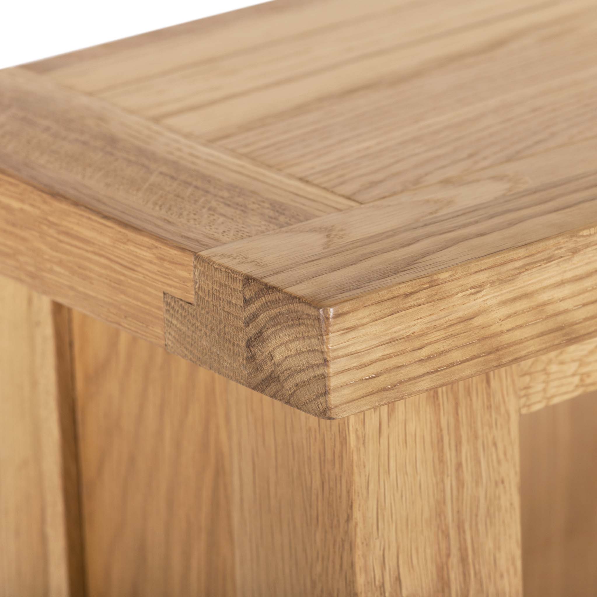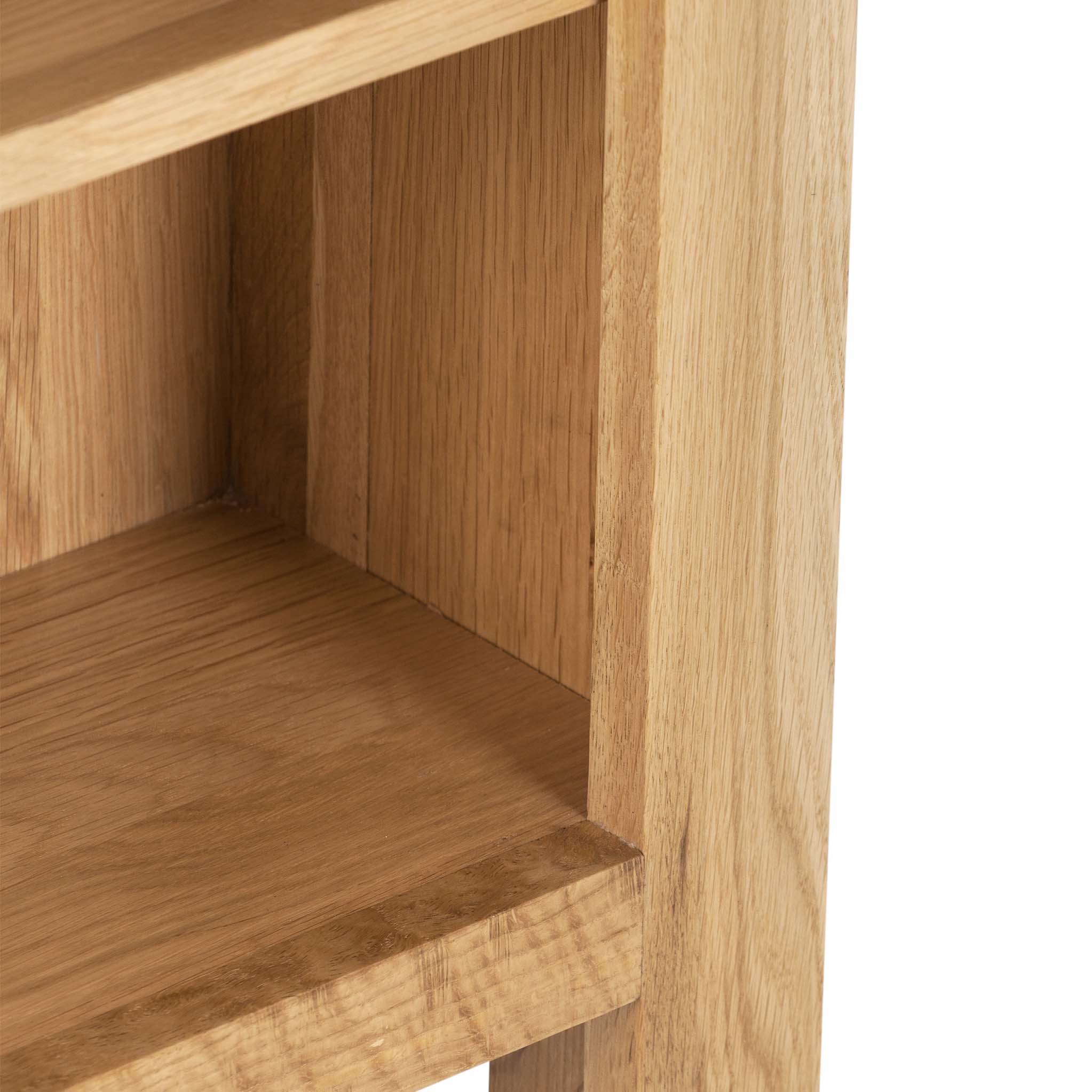 This low three shelf bookcase is perfect for rooms where space is short. It's constructed from solid wood and oak and finished with a light satin lacquer for durability.