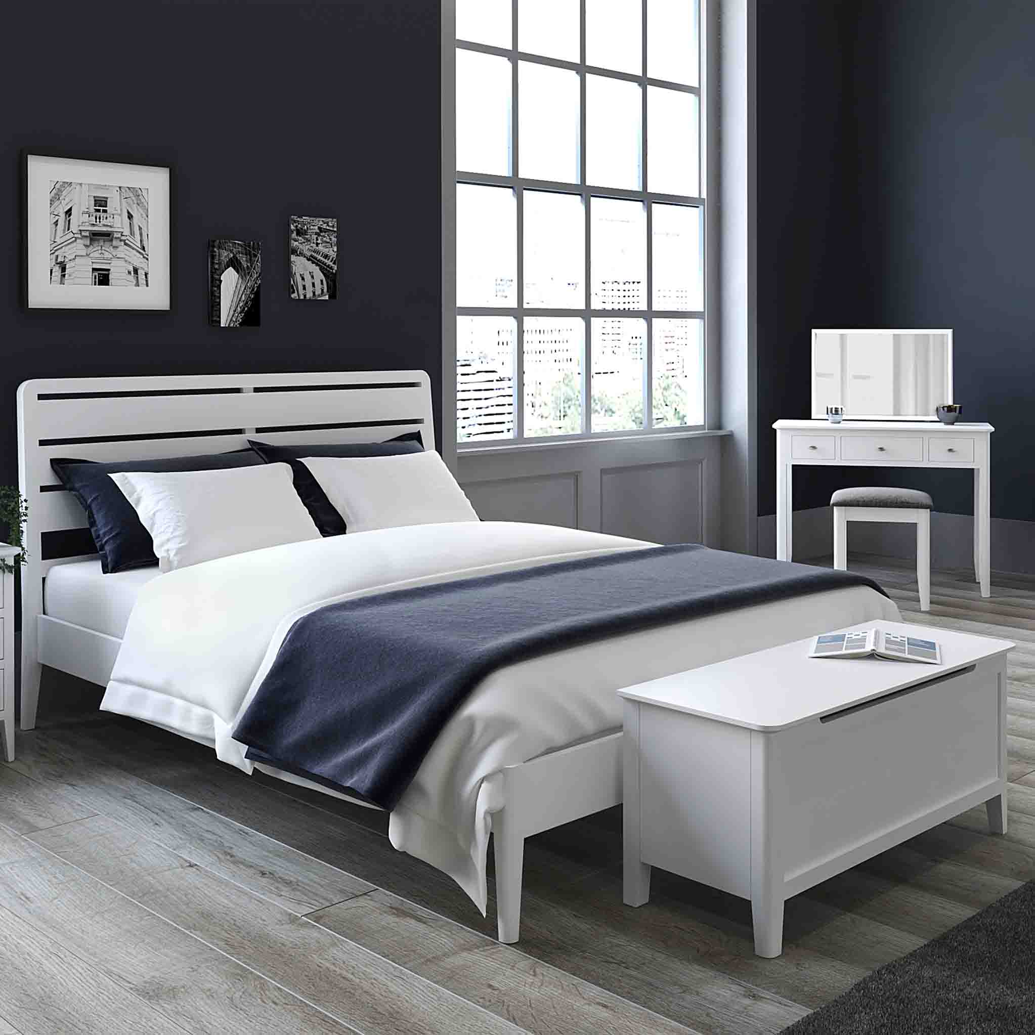 The largest of the Chester White beds available in the Chester White bedroom furniture range, with a bright white painted and lightly lacquered finish and simple lines, this would be great to combine this bed with a Chester wardrobe and chest of drawers to create a classic bedroom set. This size frame takes a standard 5' mattress.