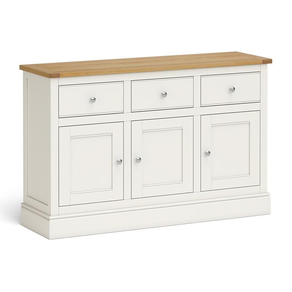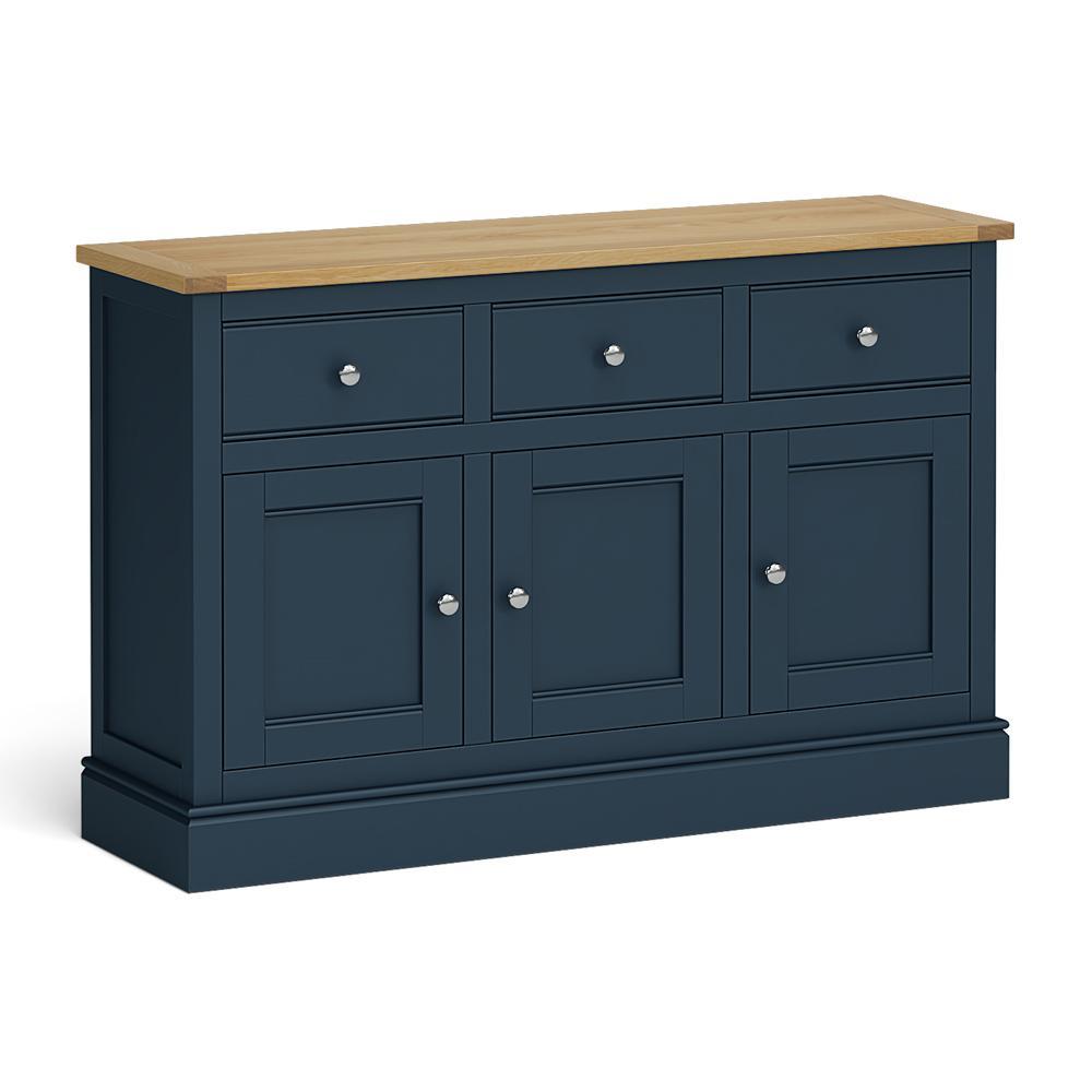 One of three sideboards in the Chichester range, this is the middle-sized of the three. With three spacious drawers giving plenty of storage space whether it's in the hallway, dining room or living room. The three-door cupboard has a fixed internal shelf that runs across the whole unit leaving plenty of space for crockery, DVD's or anything else you can think of.