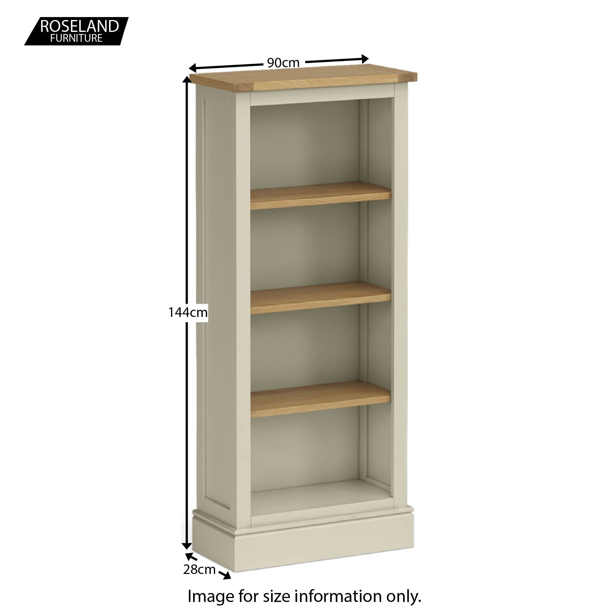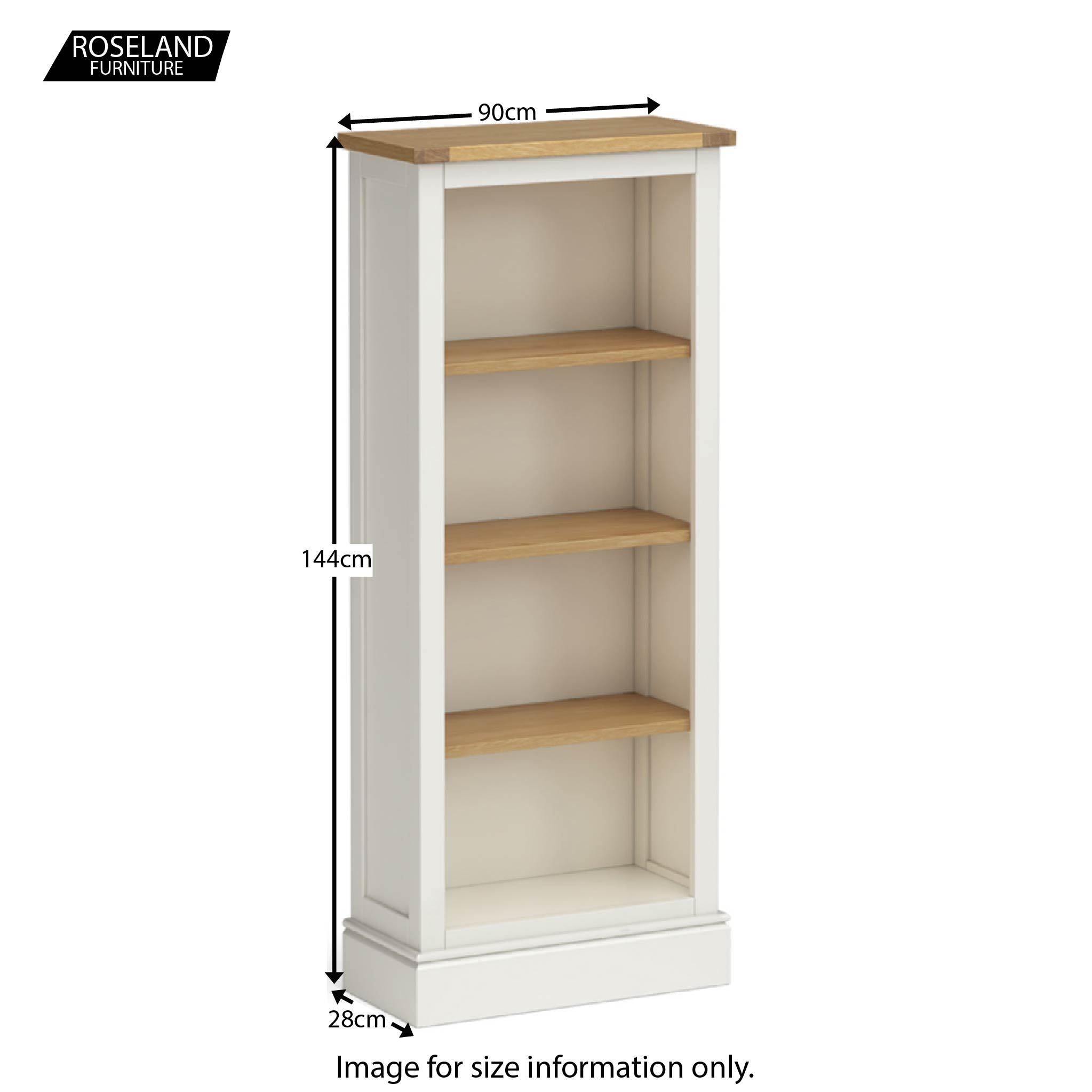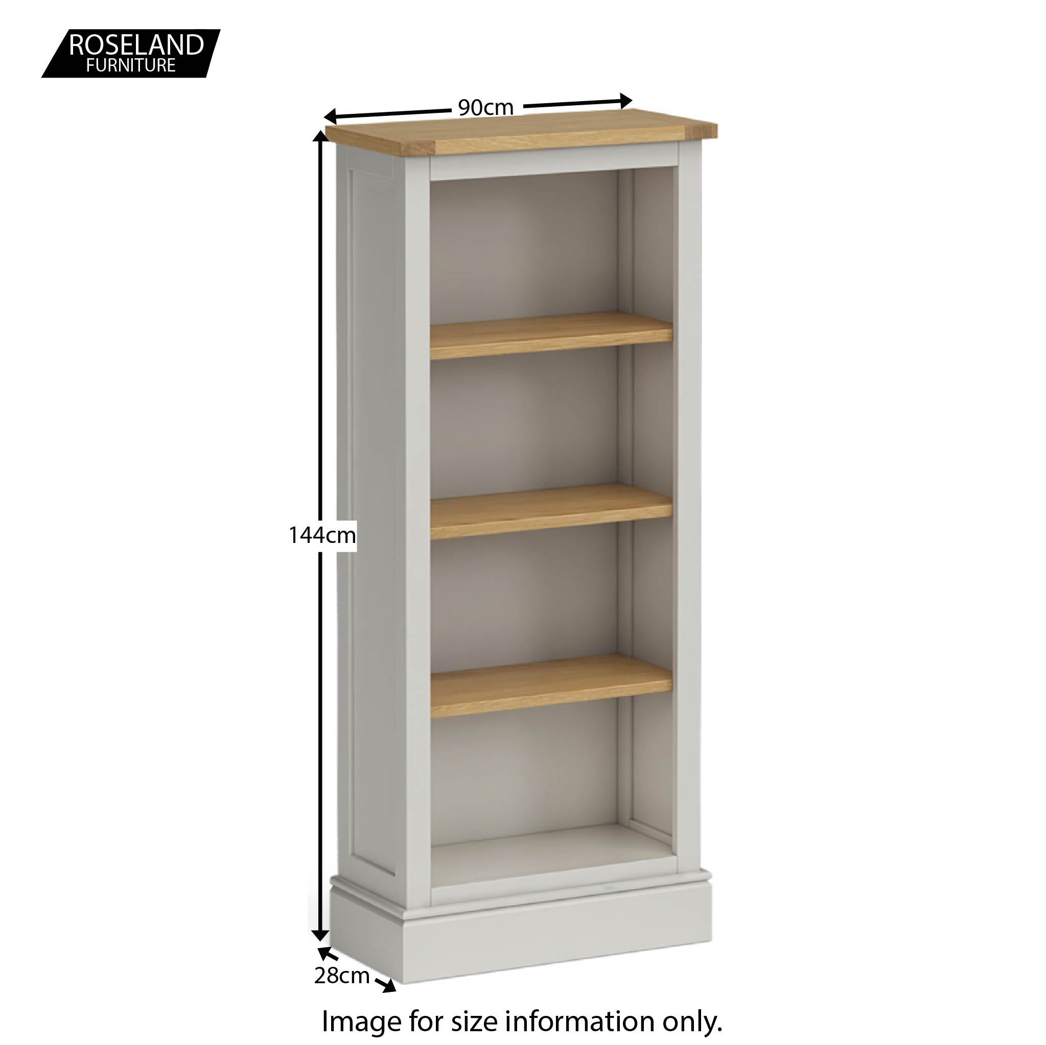 One of three bookcases in the Chichester range. If you've got a small space and aren't sure what to put in it, the Chichester Slim Bookcase might hold the answer! It's the perfect combination of storage and display space in a compact design. The four contrasting oak finished shelves are suitable for paperbacks, small hardbacks, photos or ornaments and the flat top is a great place for a lamp.