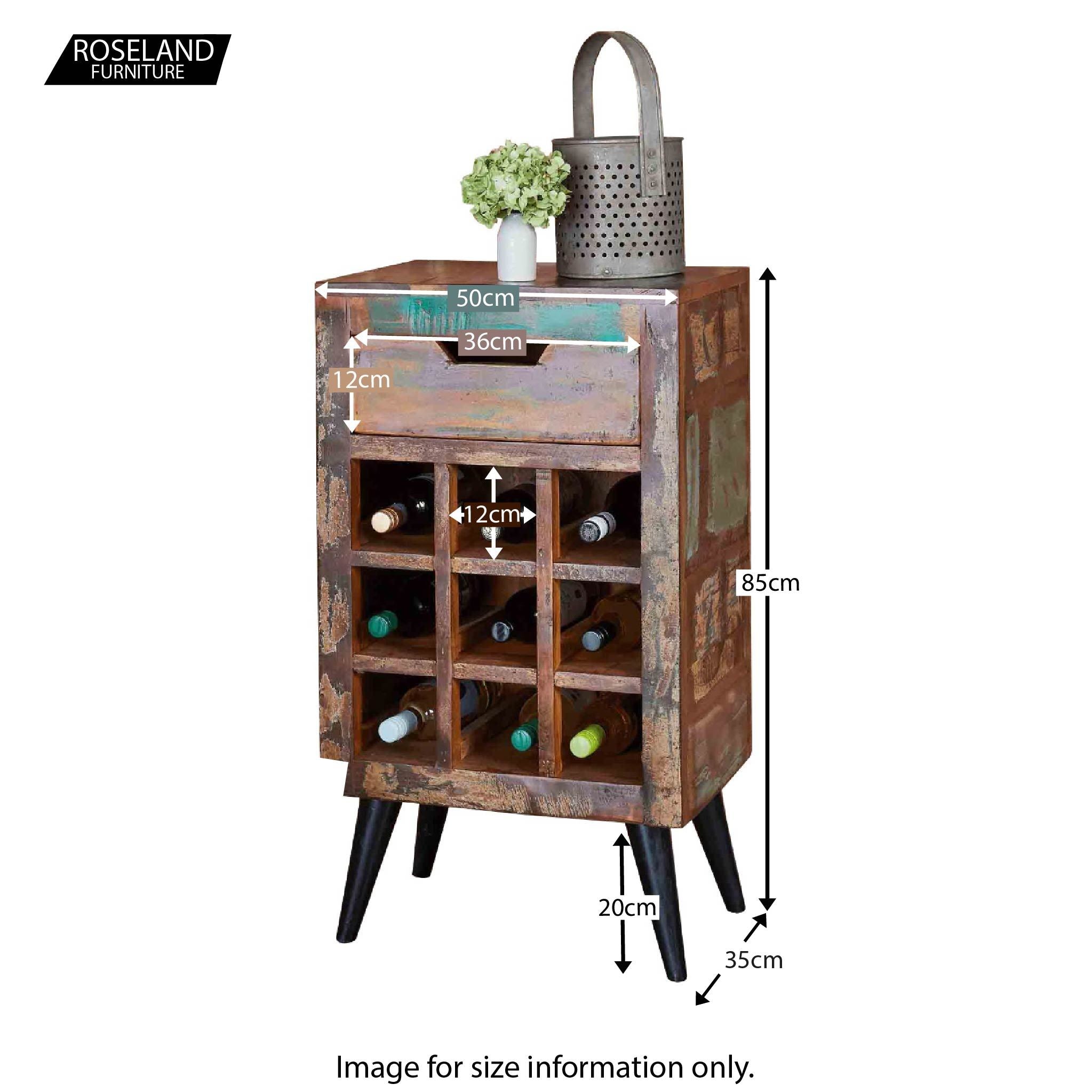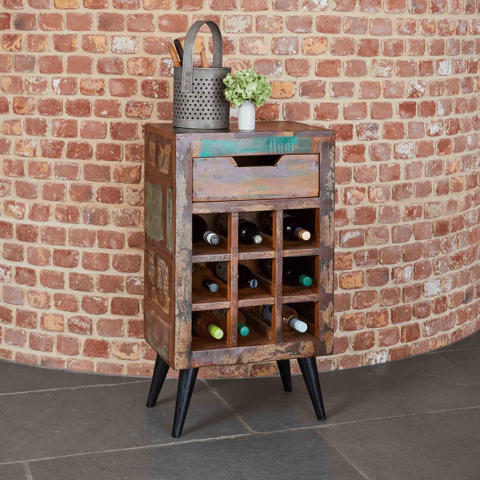 This stunning wine rack will hold 9 of your favourite bottles as well as a large draw for addition storage.Crafted from reclaimed wood salvaged from places such as Gujarat, Maharashtra and Rajasthan Southern India, this range will bring a sense of coastal living to your interior.
