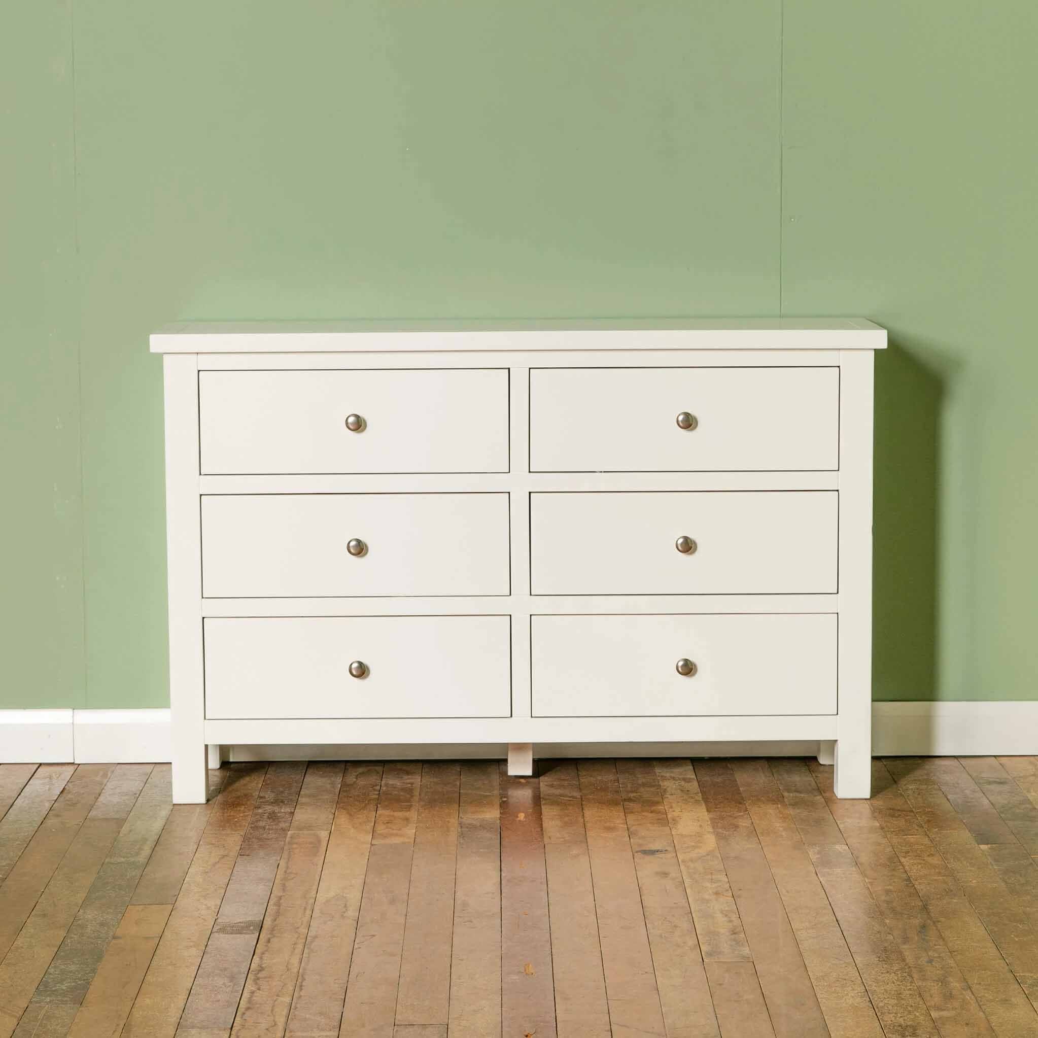 The Cornish White 6 Drawer Chest is the largest chest in this range. Whilst it's lower in height than the 2 over 3 chest of drawers it's wider and the 6 large drawers provide plenty of practical storage. Its top clean looking surface is fantastic for picture frames, flowers, or even a bedroom mirror.