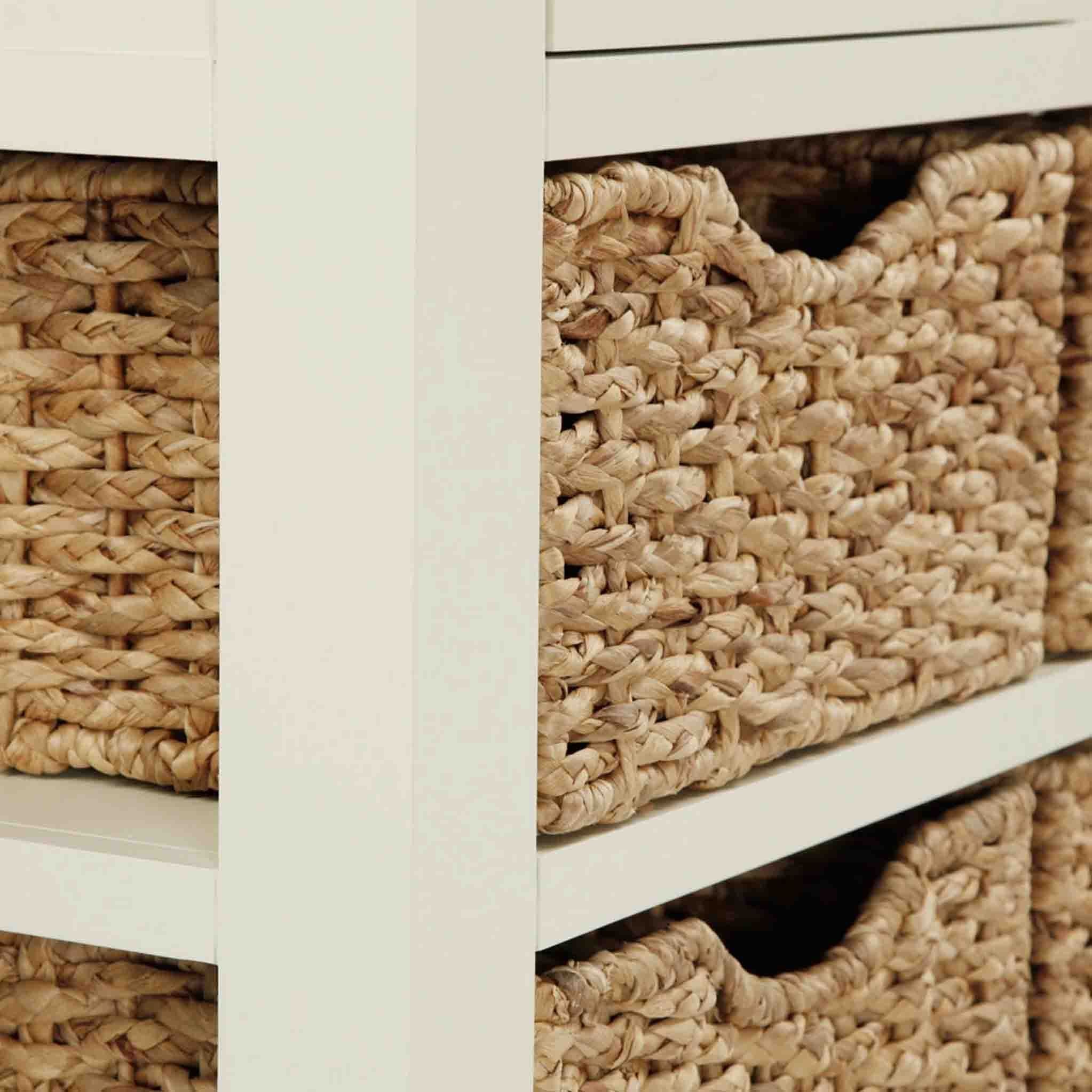- Features 2 storage drawers and 4 woven baskets.
