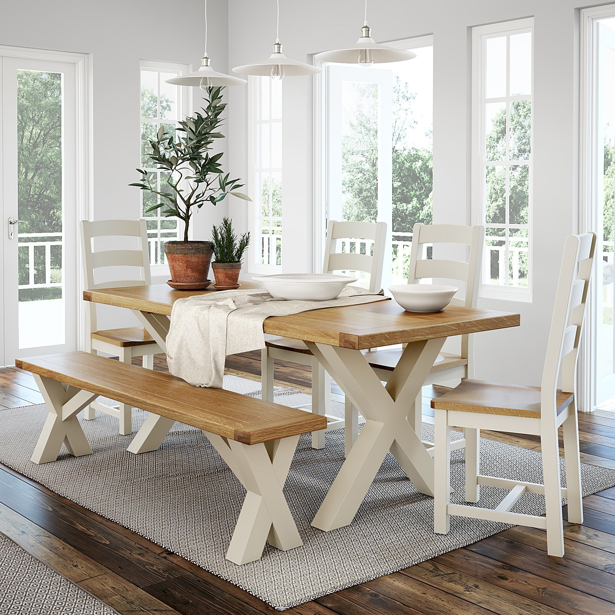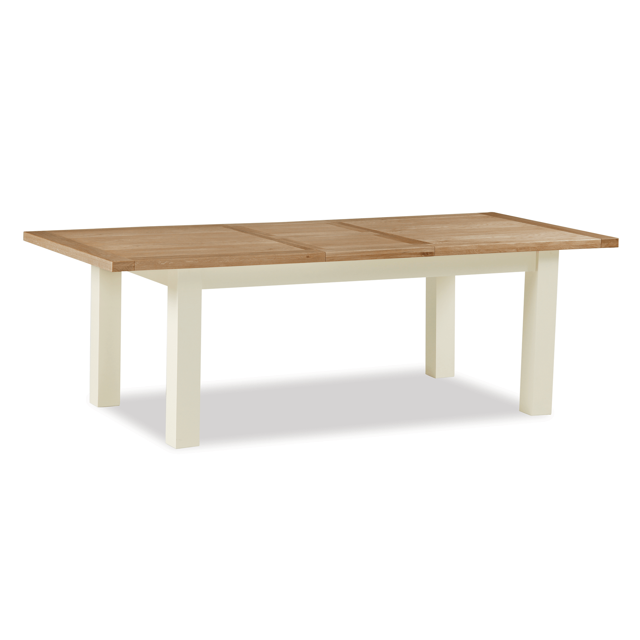 The smaller of the two extending tables form the Daymer Cream range, this one starts at a width of 120cm and extends to 165cm allowing plenty of seating space and giving you the flexibility of having the table open or closed. The surface is built from solid oak/oak veneer and has a beautifully oiled finish, giving the wood a natural sheen. This is available with matching Slatted Chairs.