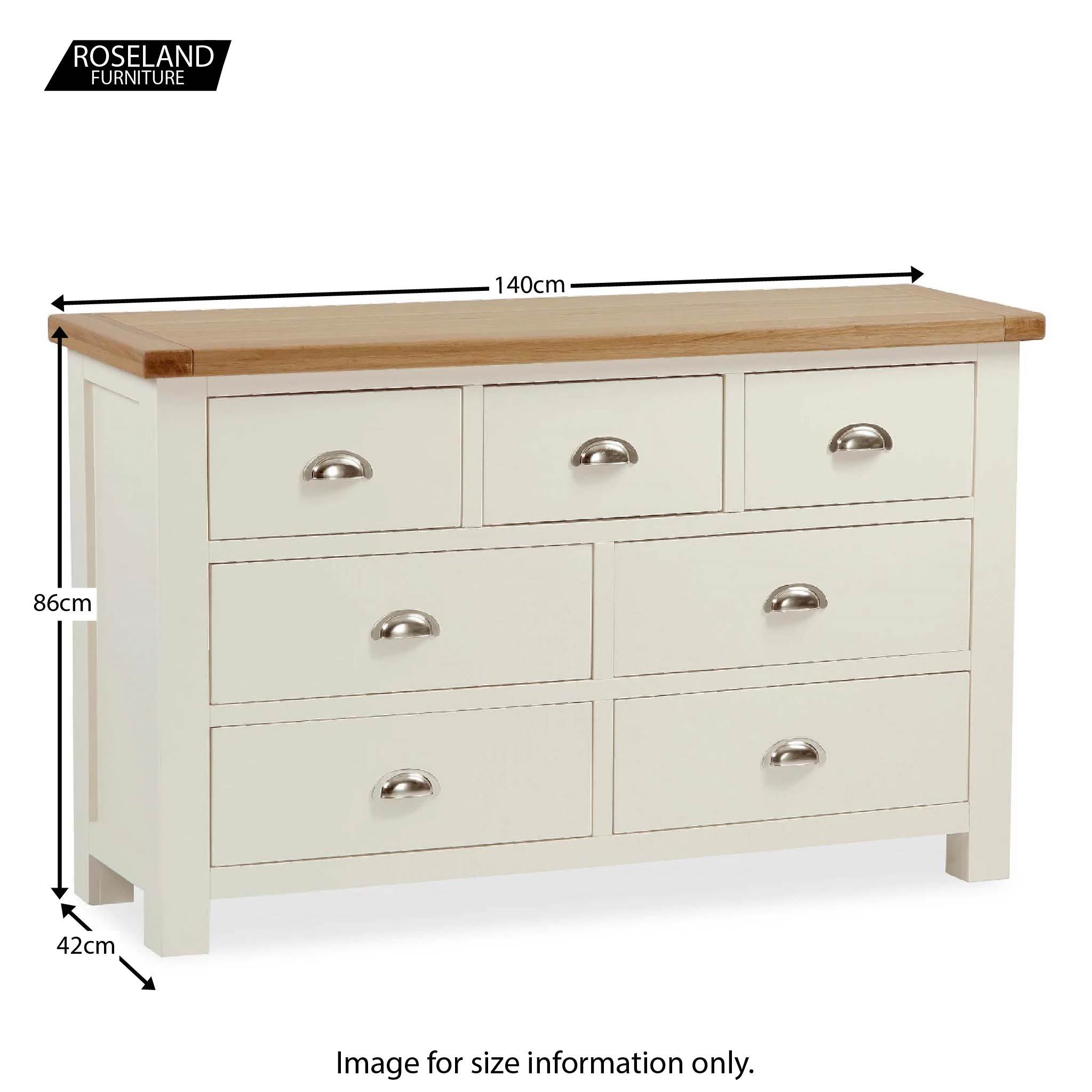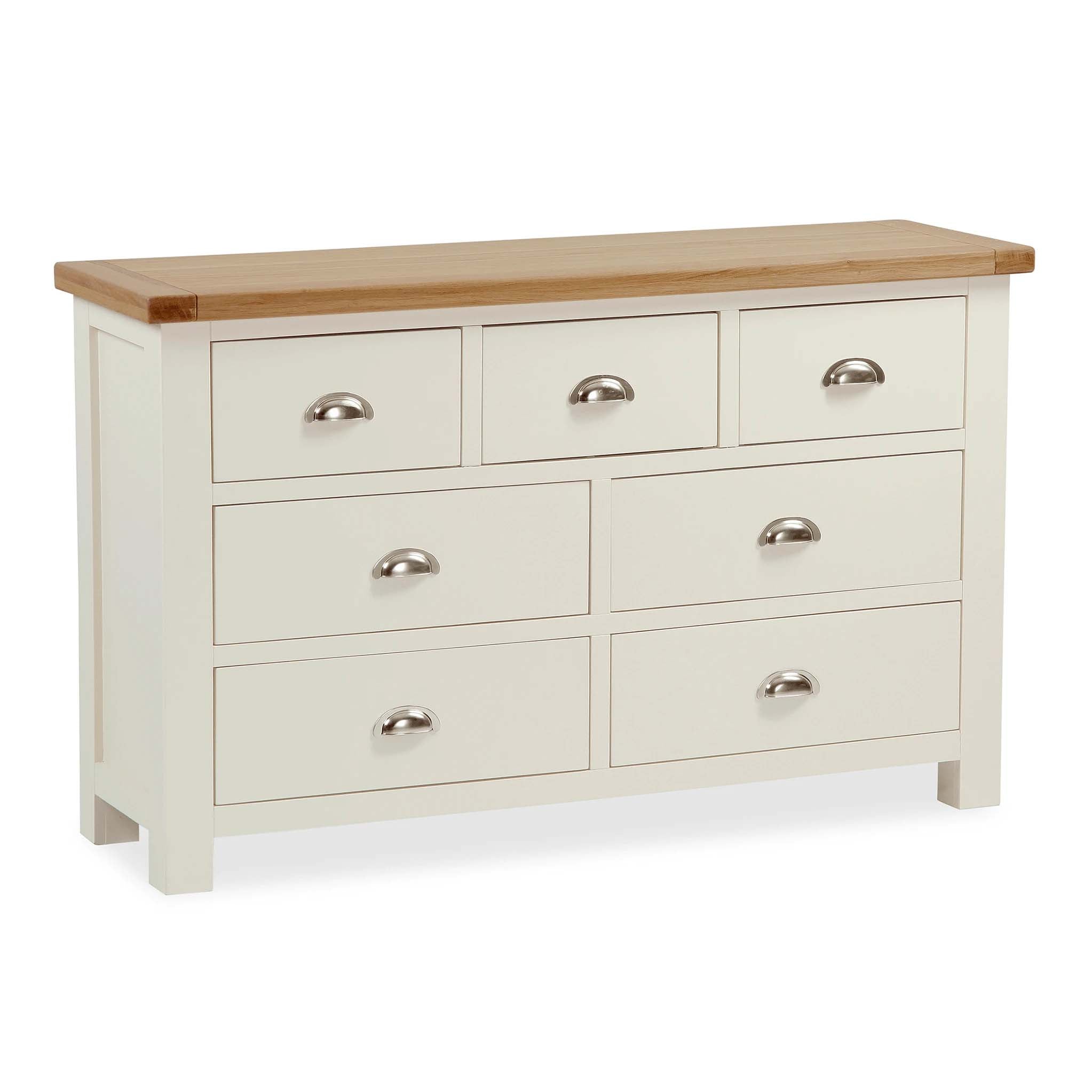 The Daymer Cream large chest of drawers is a beautiful piece, designed to bring a contemporary painted style to your bedroom/living space. Featuring 7 (3 small and 4 large) spacious drawers the design is practical as well as elegant. The painted finish is an off white buttermilk colour which can really brighten your room whilst the metal handle adds that modern touch.