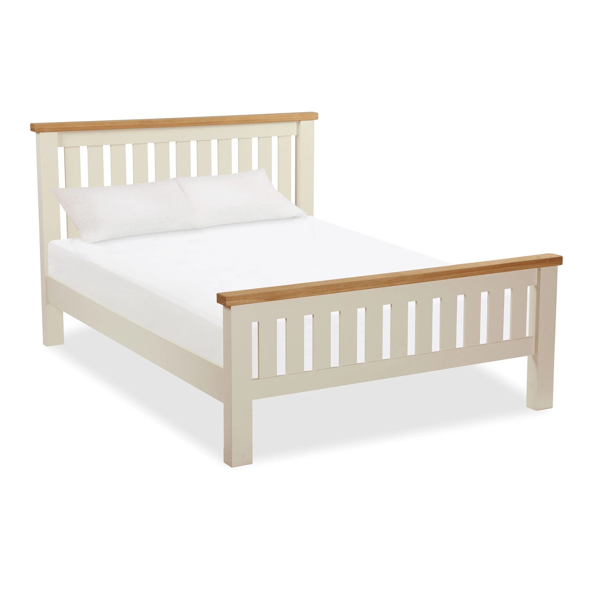 The smaller of the two double-sized beds in the Daymer Cream range of bedroom furniture. This wooden bed frame takes a standard 4 ft 6-inch mattress and combines a cream finish with contrasting oak tops. Create your ideal bedroom, and combine this bed-frame with a chest and wardrobe from the Daymer Cream range.