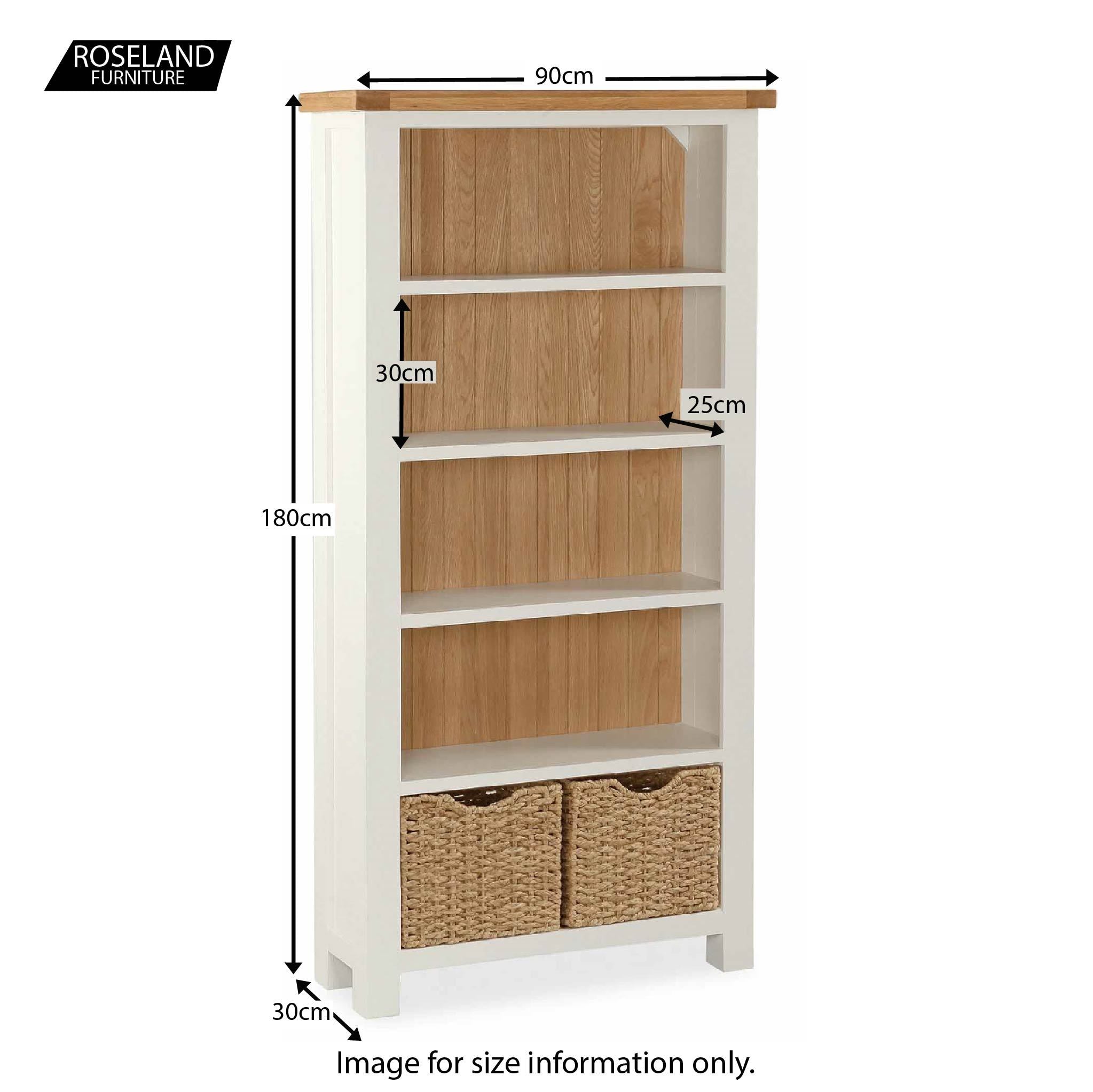 The Daymer cream Large Bookcase is the largest of the bookcases in the Daymer cream range. Offering an abundance of shelf and basket storage space this bookcase will suit any room of the house. Finished in a buttermilk cream painted colour with a contrasting oak top this unit is suited to any room of the house.