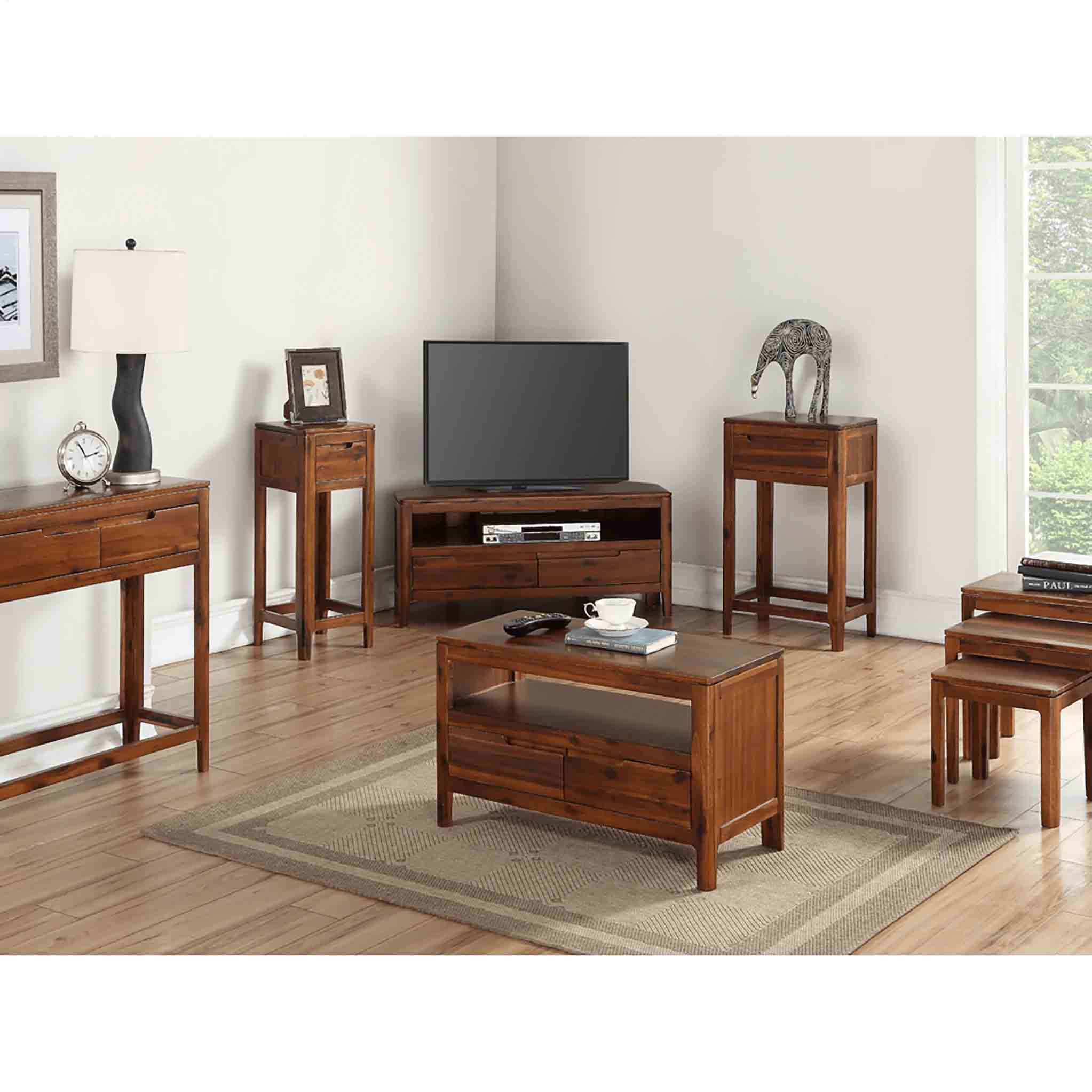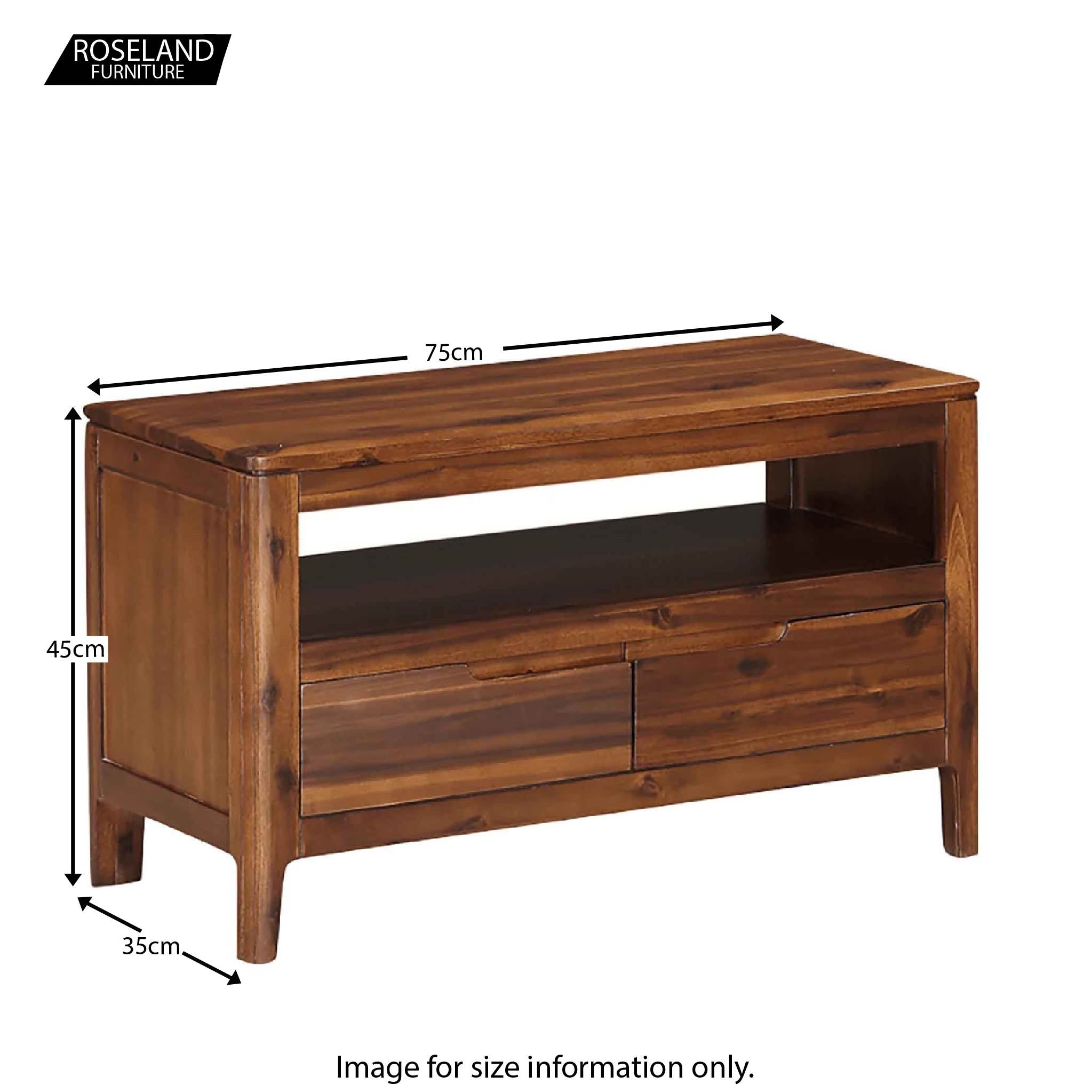 A beautiful warm Acacia Small TV stand , the Dunmore Acacia Small TV Unit has an open upper shelf, with open rear and a large spacious lower drawer. With modern cut out handles the drawer is the perfect place to store spare cables, extra remote's, important instruction manuals etc. Delivered fully assembled, just un-box and you're ready to go!