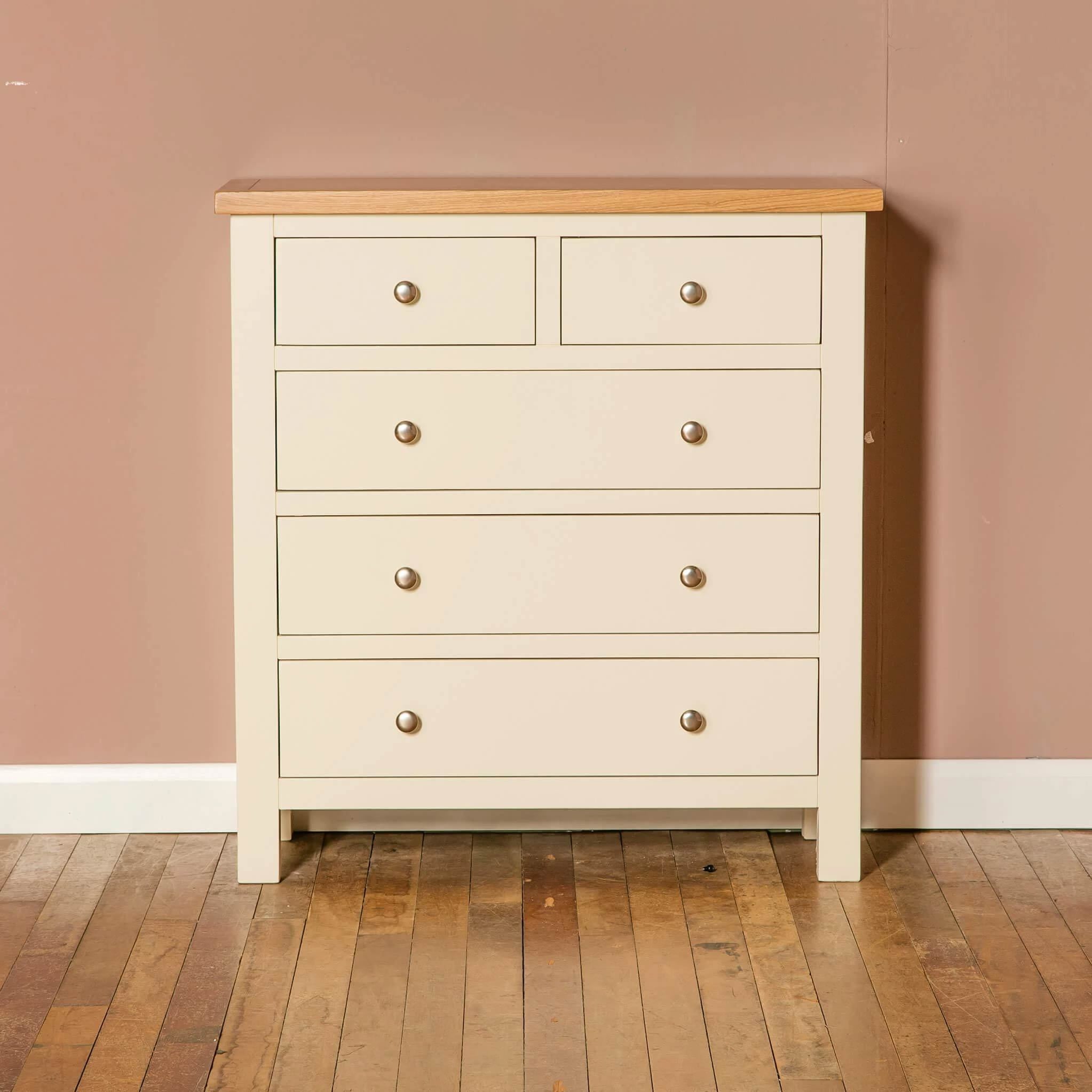 This Farrow Cream 2 Over 3 Chest drawers is part of our best selling Farrow furniture range. Designed with five useful spacious drawers fitted with round metal knobs.