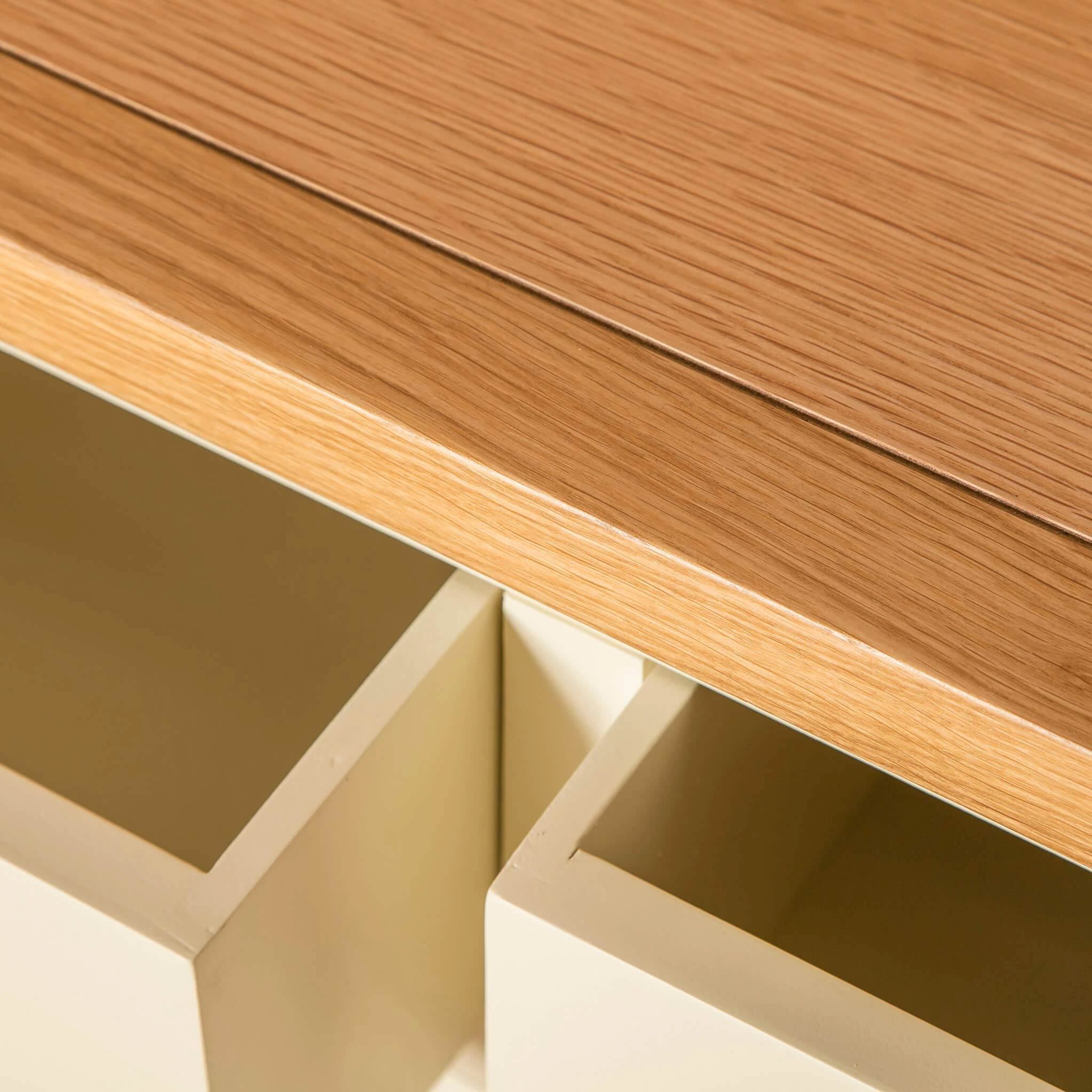 - Constructed from cream painted solid wood, which contrasts the beautiful lacquered real oak top.
