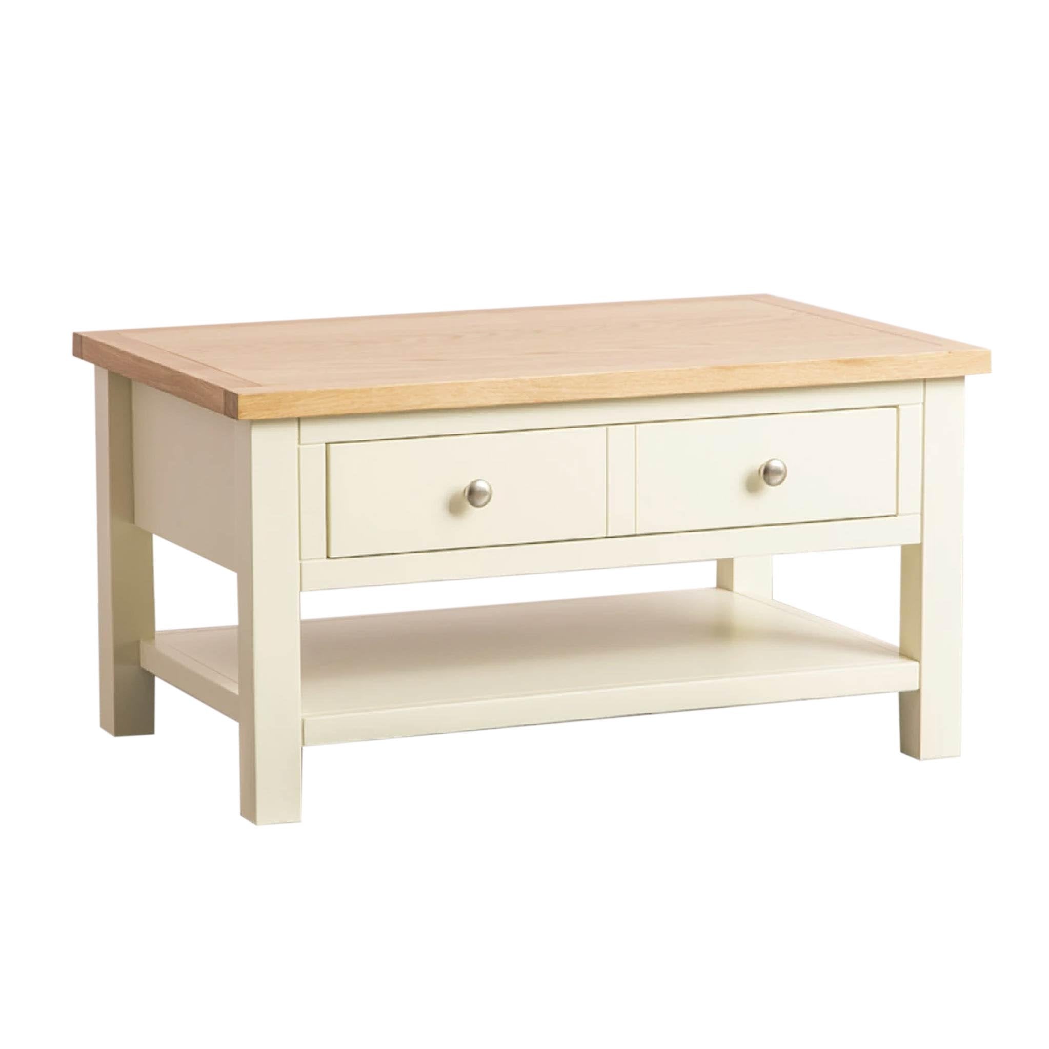 This Farrow painted coffee table is part of our best selling Farrow furniture range. Designed with a useful spacious drawer above a large shelf. The drawer is fitted with round metal knobs.