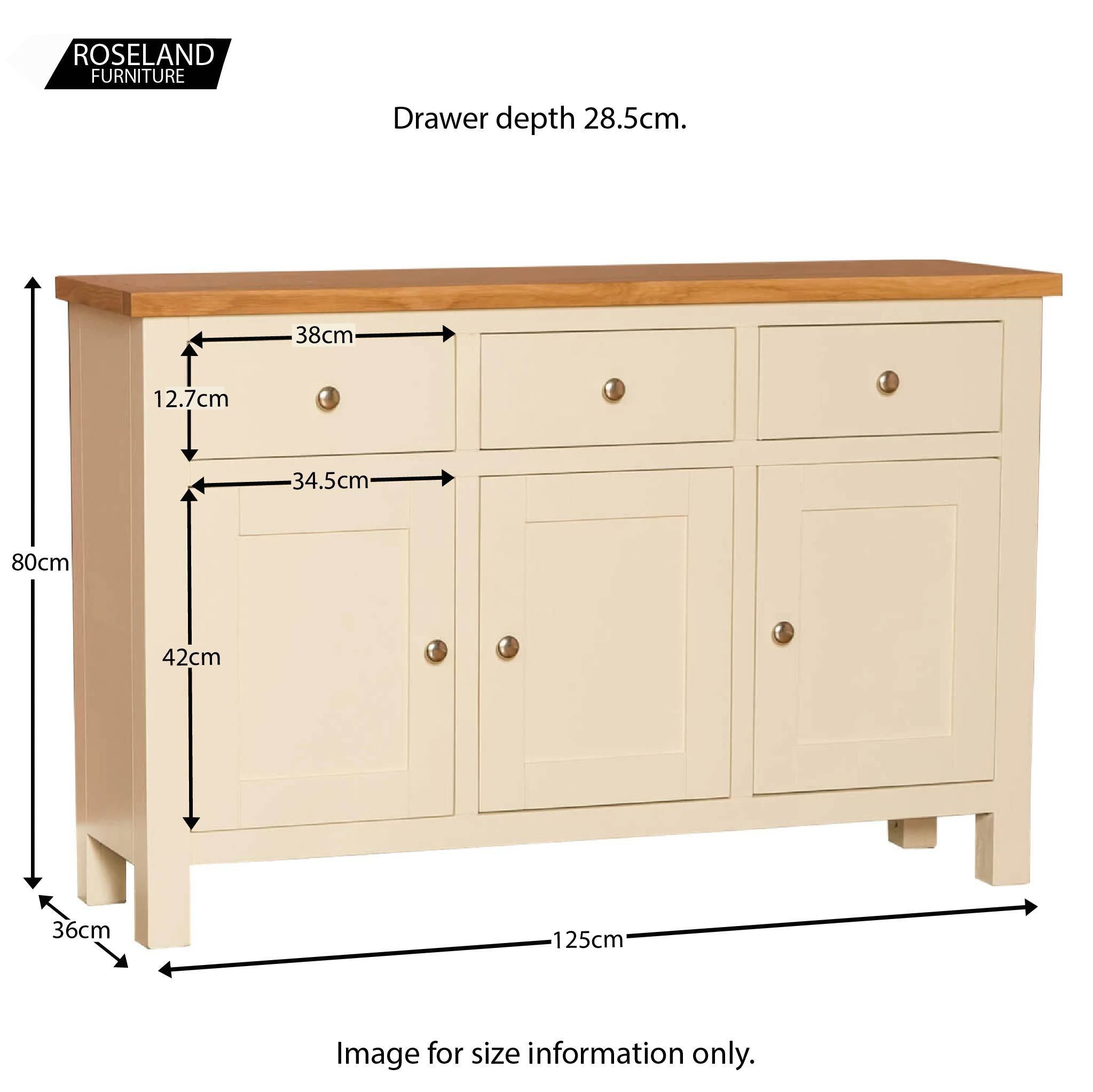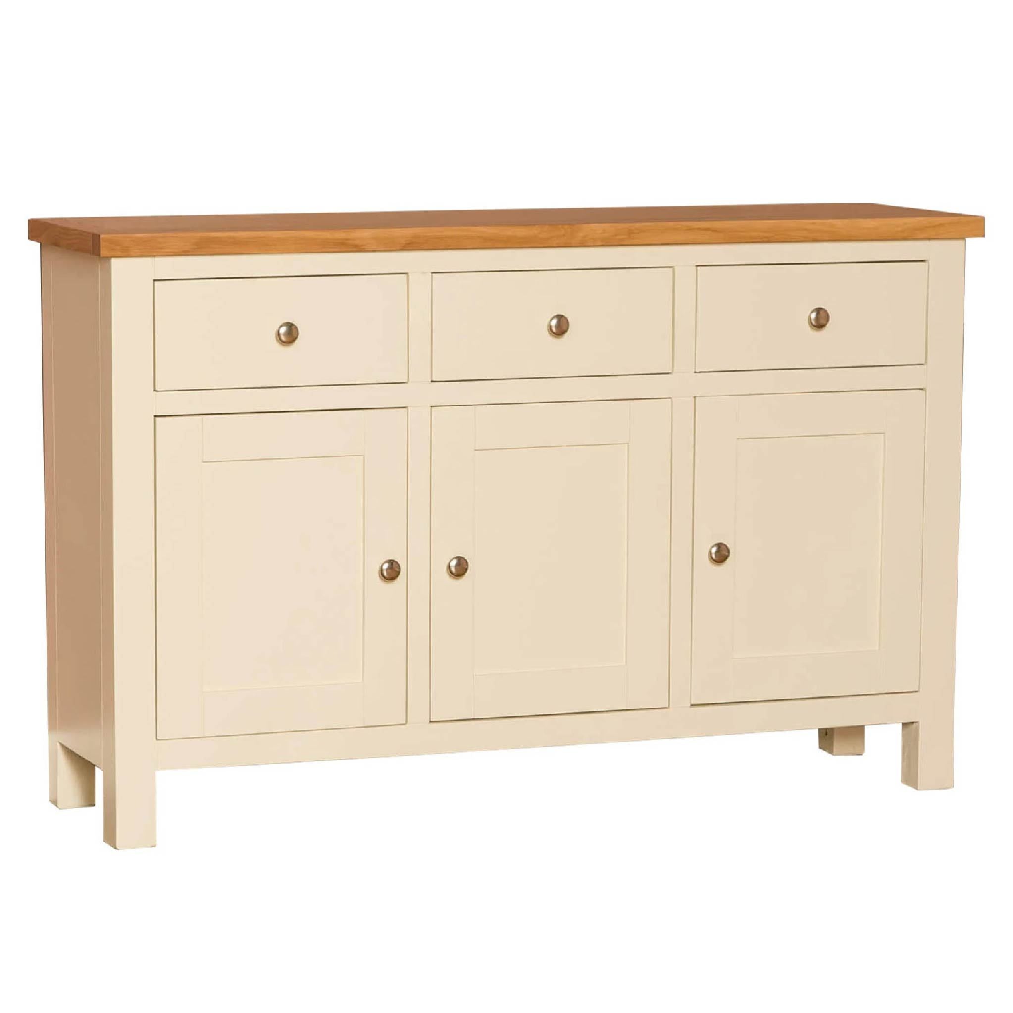 - This sturdily constructed, solid wood sideboard is finished in a matt cream paint and has a lacquered real oak top.