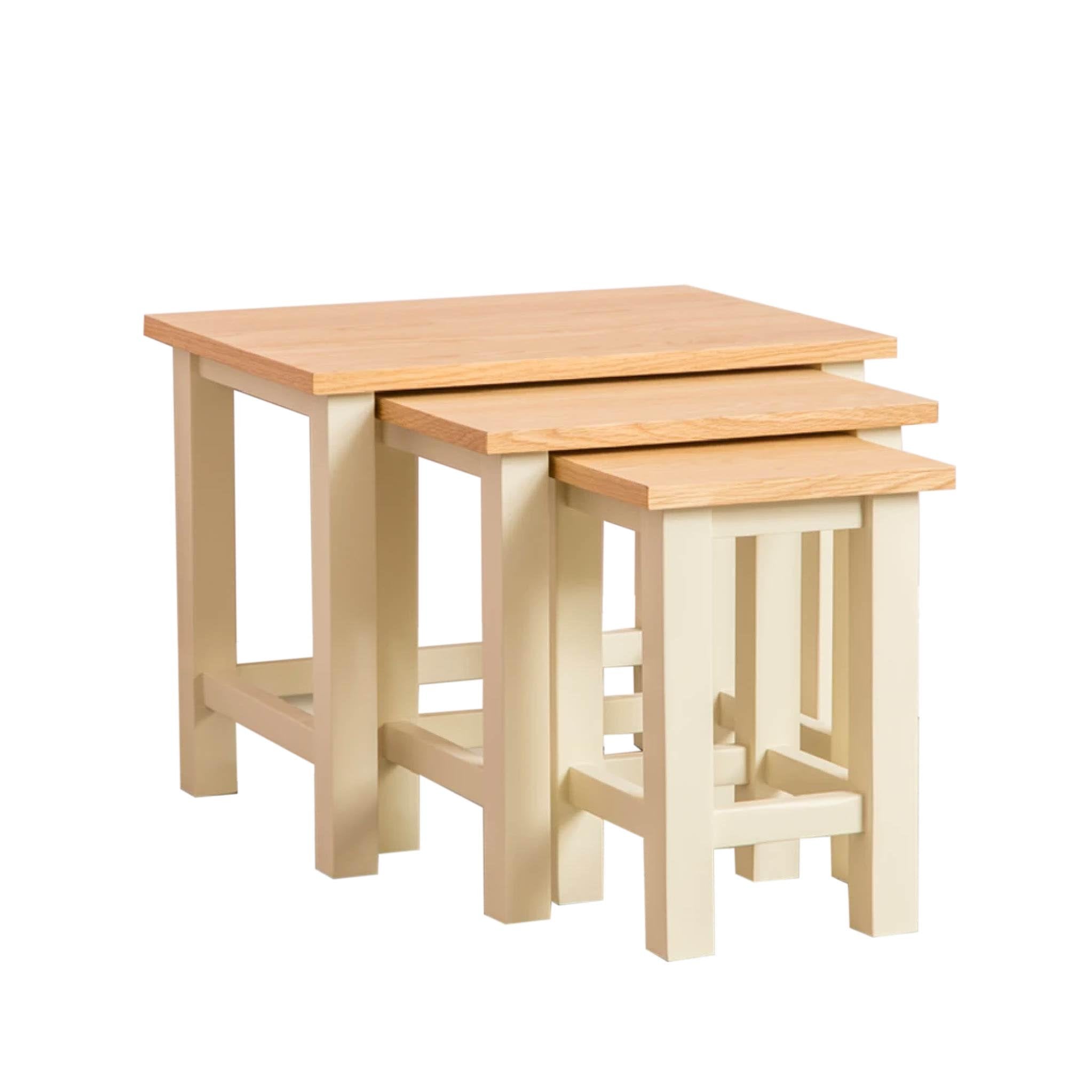 This matt cream painted nest of tables is part of our stunning Farrow furniture range. These three tables can be easily tucked away to save space if needs be and the best part is the is no assembly required.
