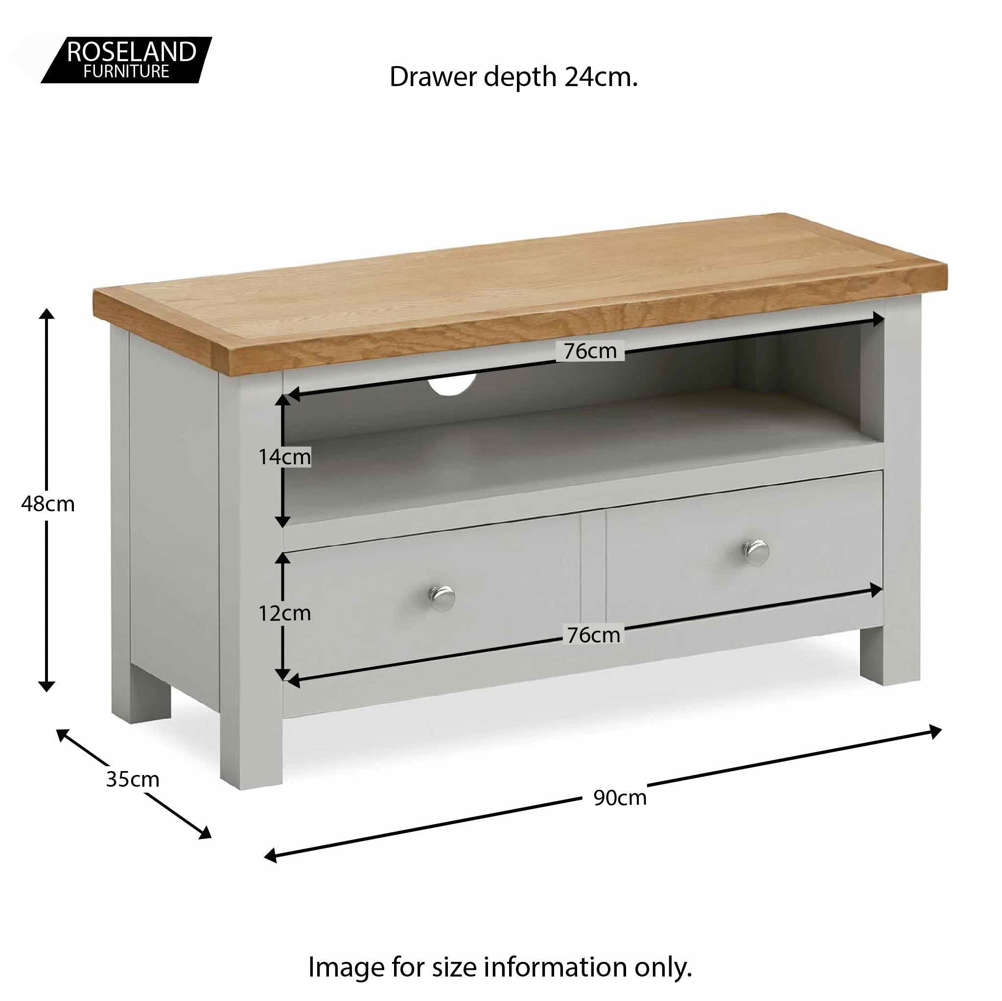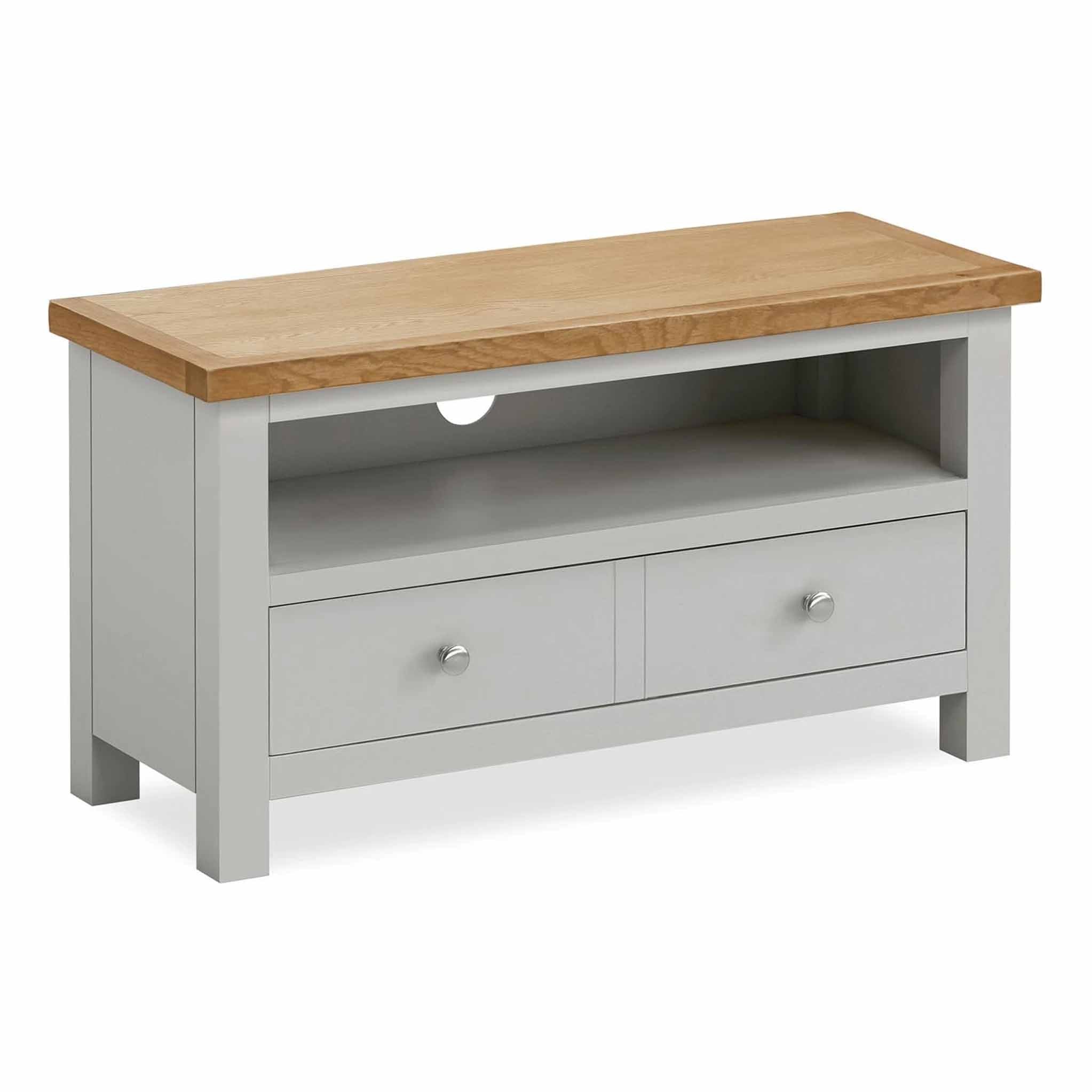 The Farrow Grey painted 90cm TV stand is part of our best selling Farrow furniture range. Designed with a useful spacious drawer below a large shelf. The drawer is fitted with round metal knobs & there is a cable access hole in the back of the unit behind the shelf to keep cables neat and tidy.