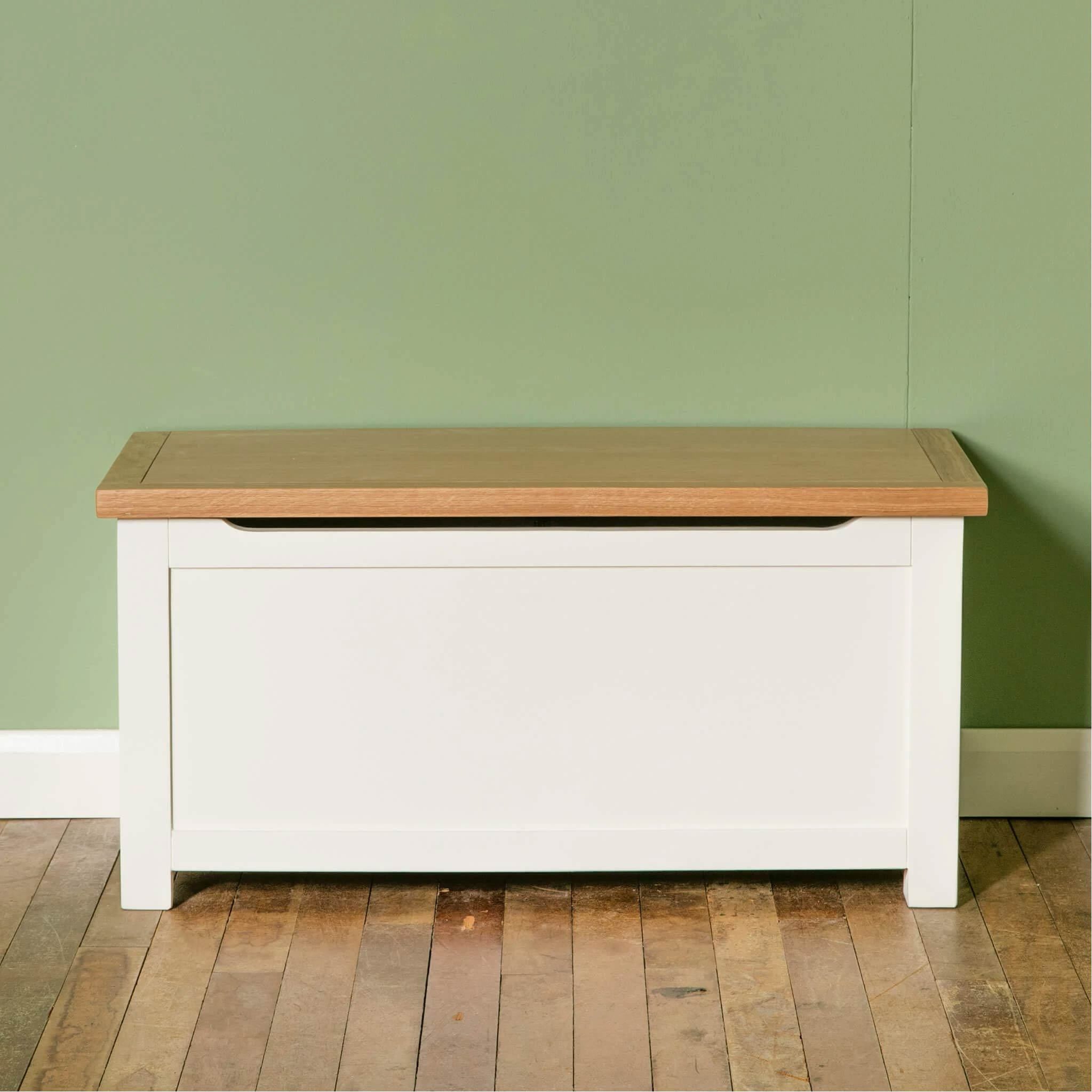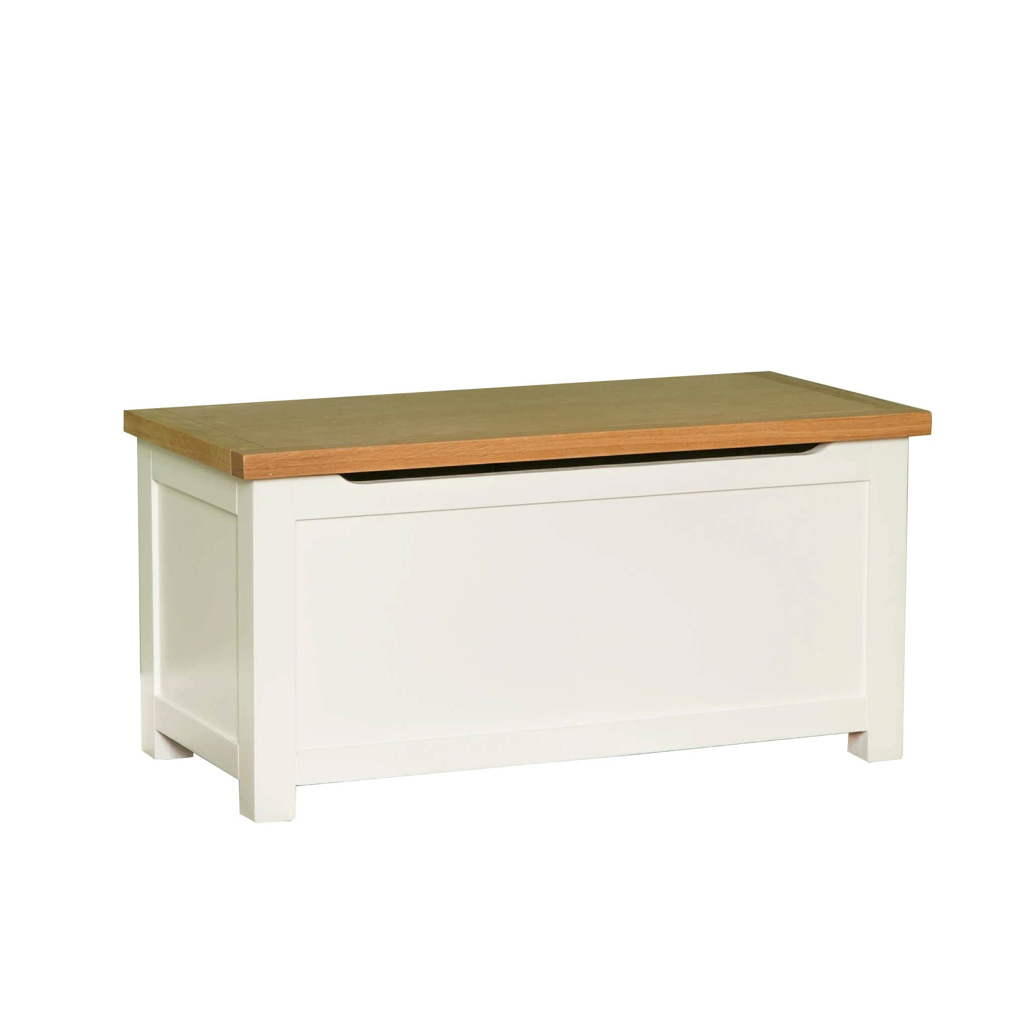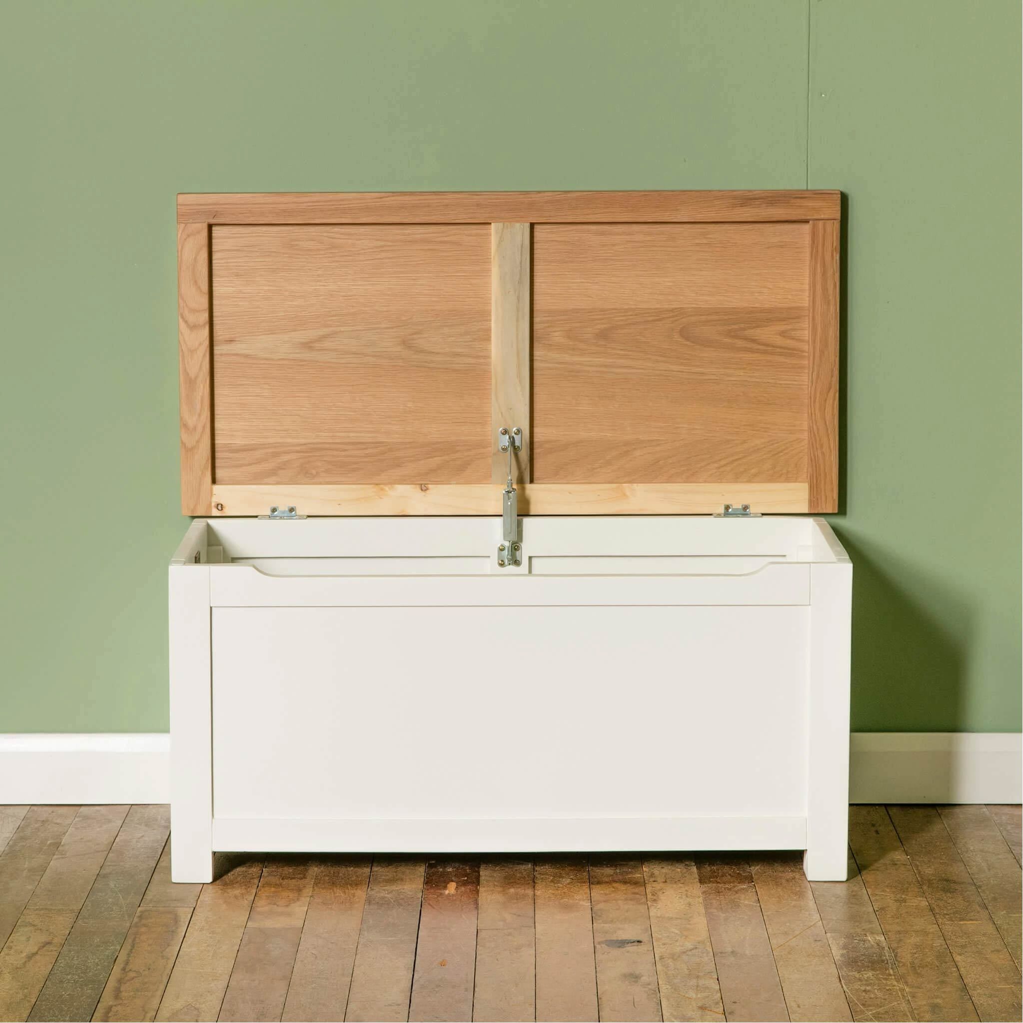 The Farrow White Blanket Box box is part of our best selling Farrow furniture range. The chest is designed with a sprung hinge to support the lid and beautiful matt cotton white painted finish.