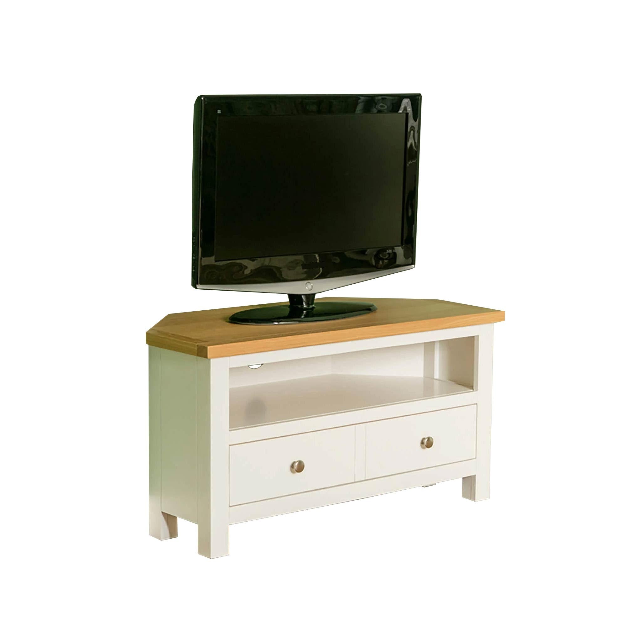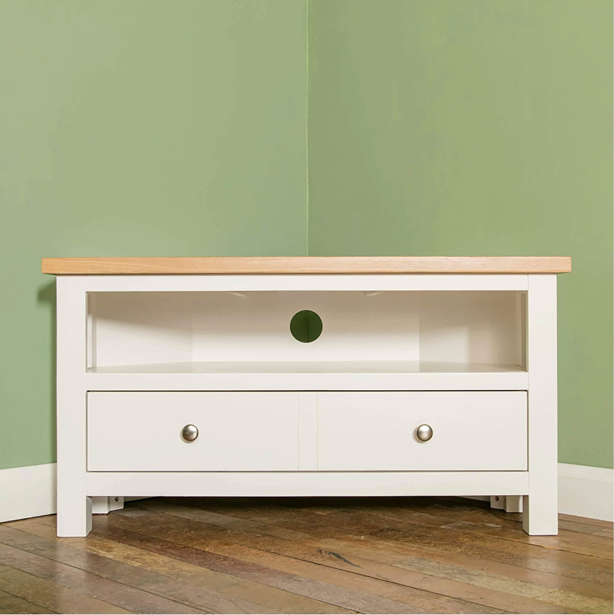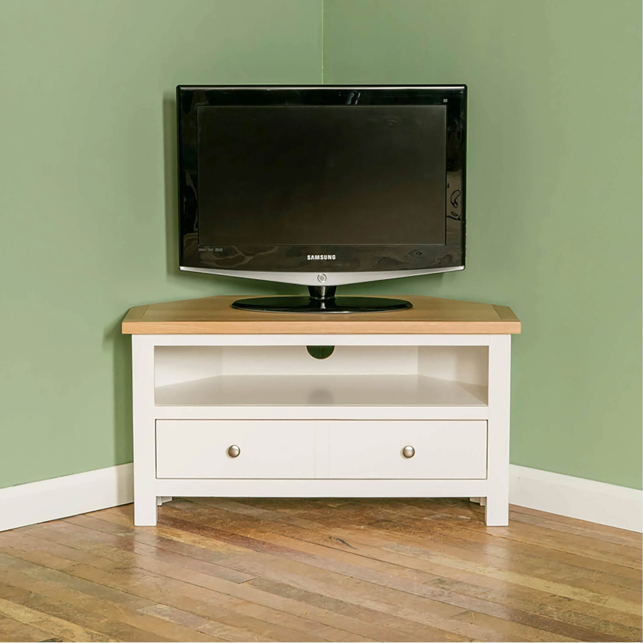This Farrow painted corner TV stand is part of our best selling Farrow Furniture range. Designed with a useful spacious drawer below a large shelf. The drawer is fitted with round metal knobs & there is a hole in the back of the unit behind the shelf to allow cables to pass through.