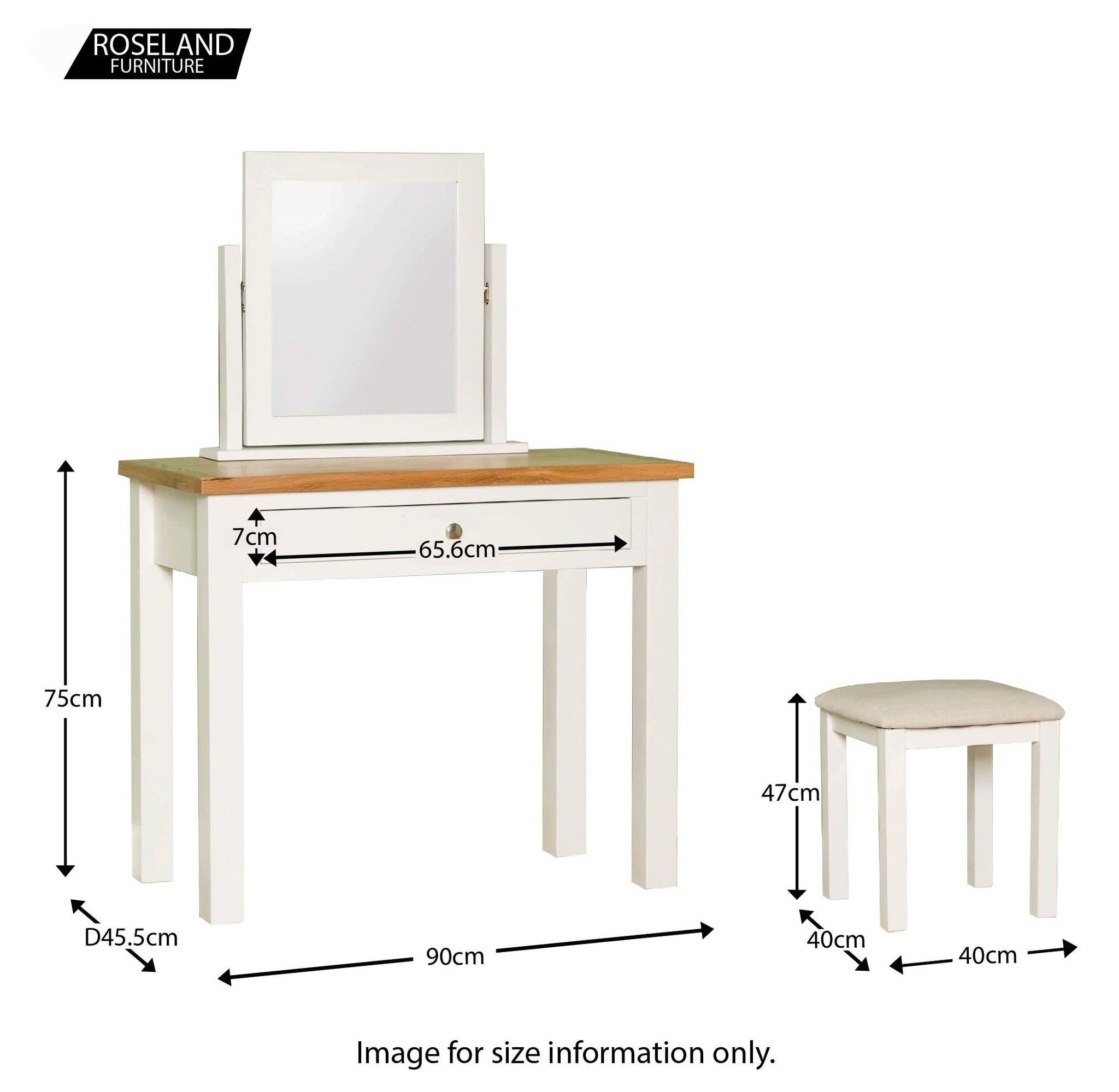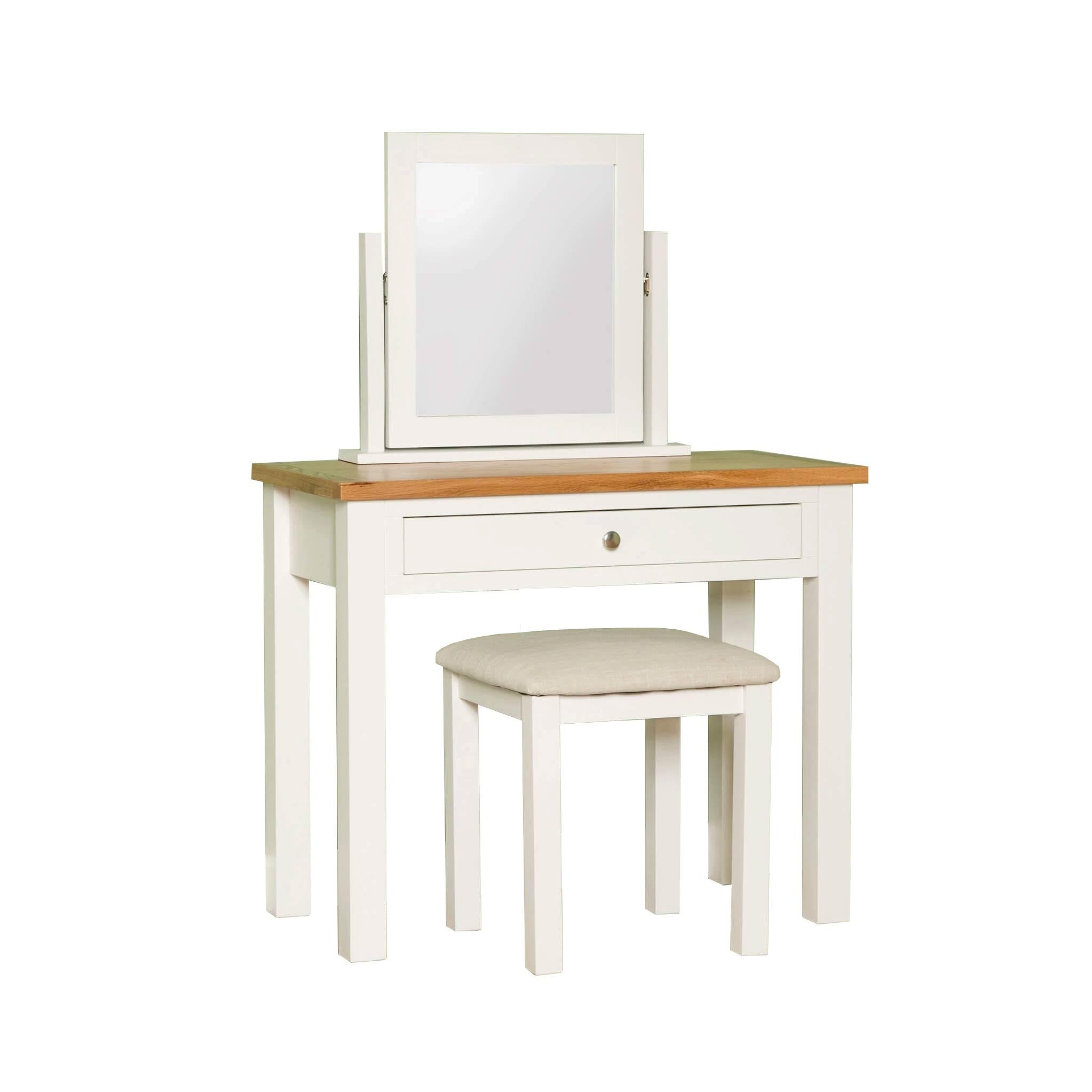 The Farrow White Dressing Table Set is part of our best selling Farrow furniture range. Designed to bring contemporary elegance to your bedroom. The drawer is fitted with a round metal knob and the stool features a beautiful oatmeal beige seat cushion. Both the table and the stool require the legs attaching which is a simple job with the bolts and tool provided.