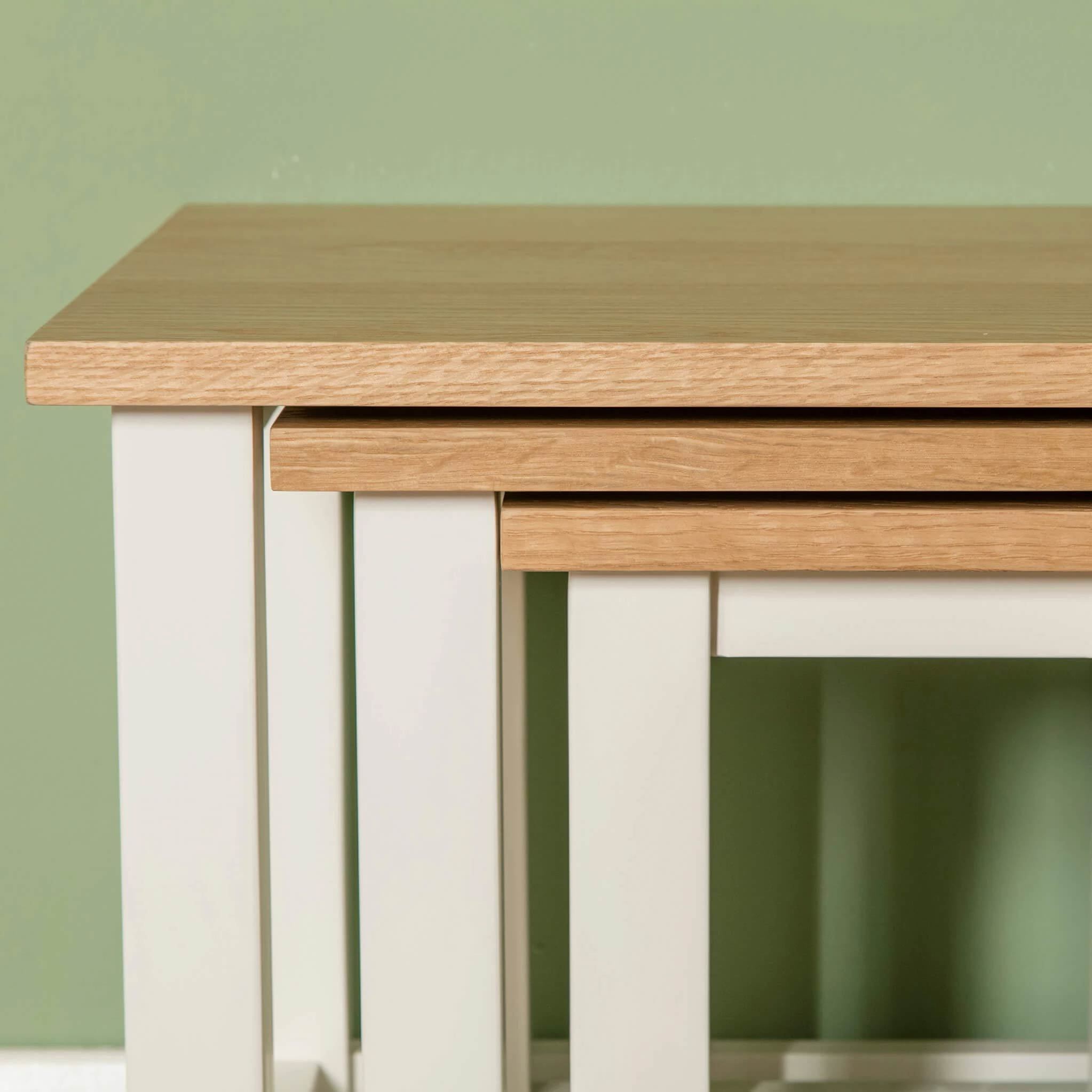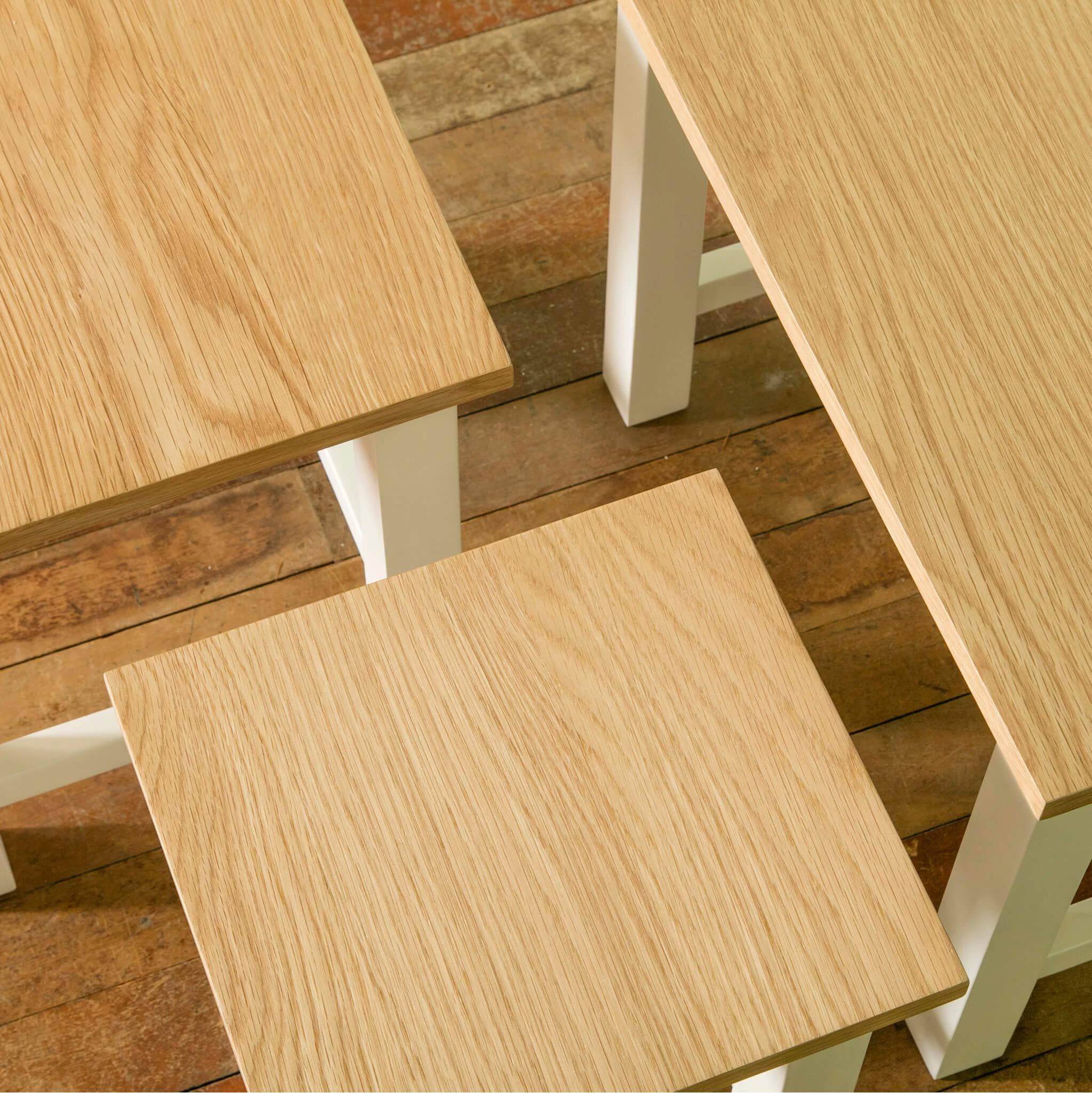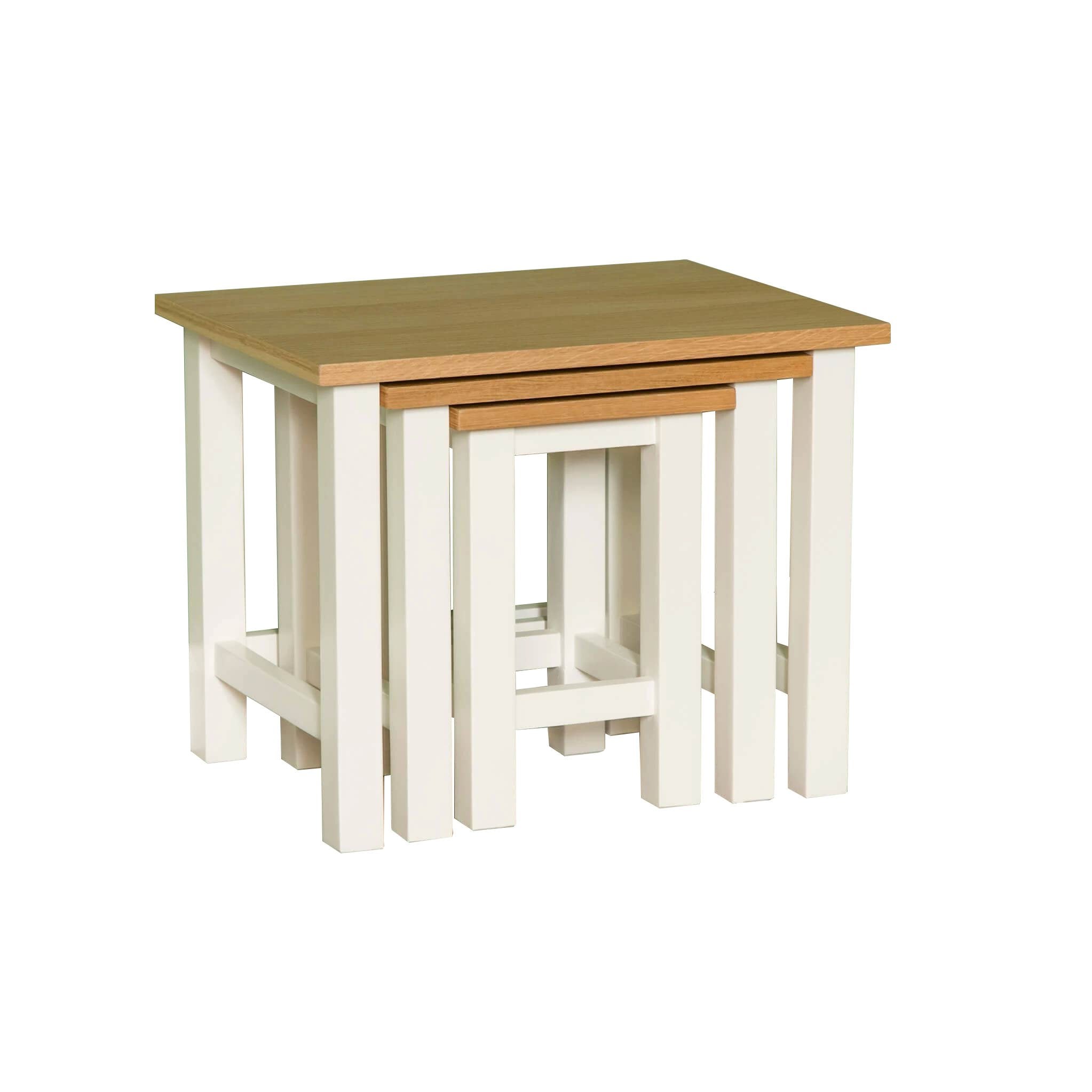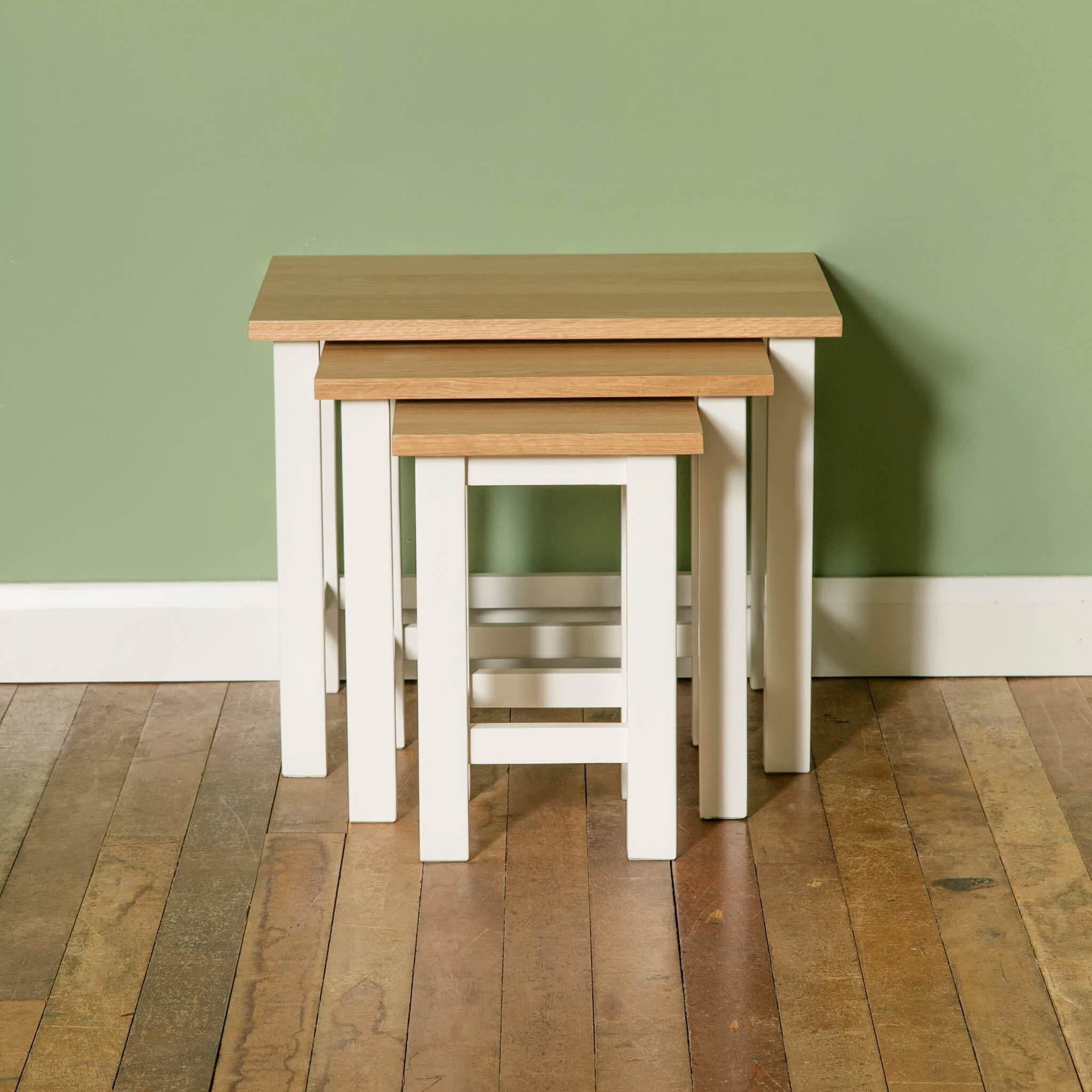 The Farrow painted nest of tables is part of our best selling Farrow furniture range. These three tables can be easily tucked away to save space if needs be and the best part is the is no assembly required.