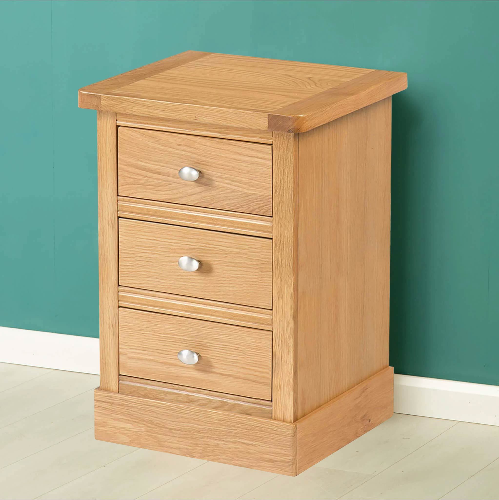 A beautiful oak bedside table, that would make the perfect addition to any bedroom. With three drawers for storage, featuring satin silver cup handles, this piece adds a touch of classic modernity to the home.