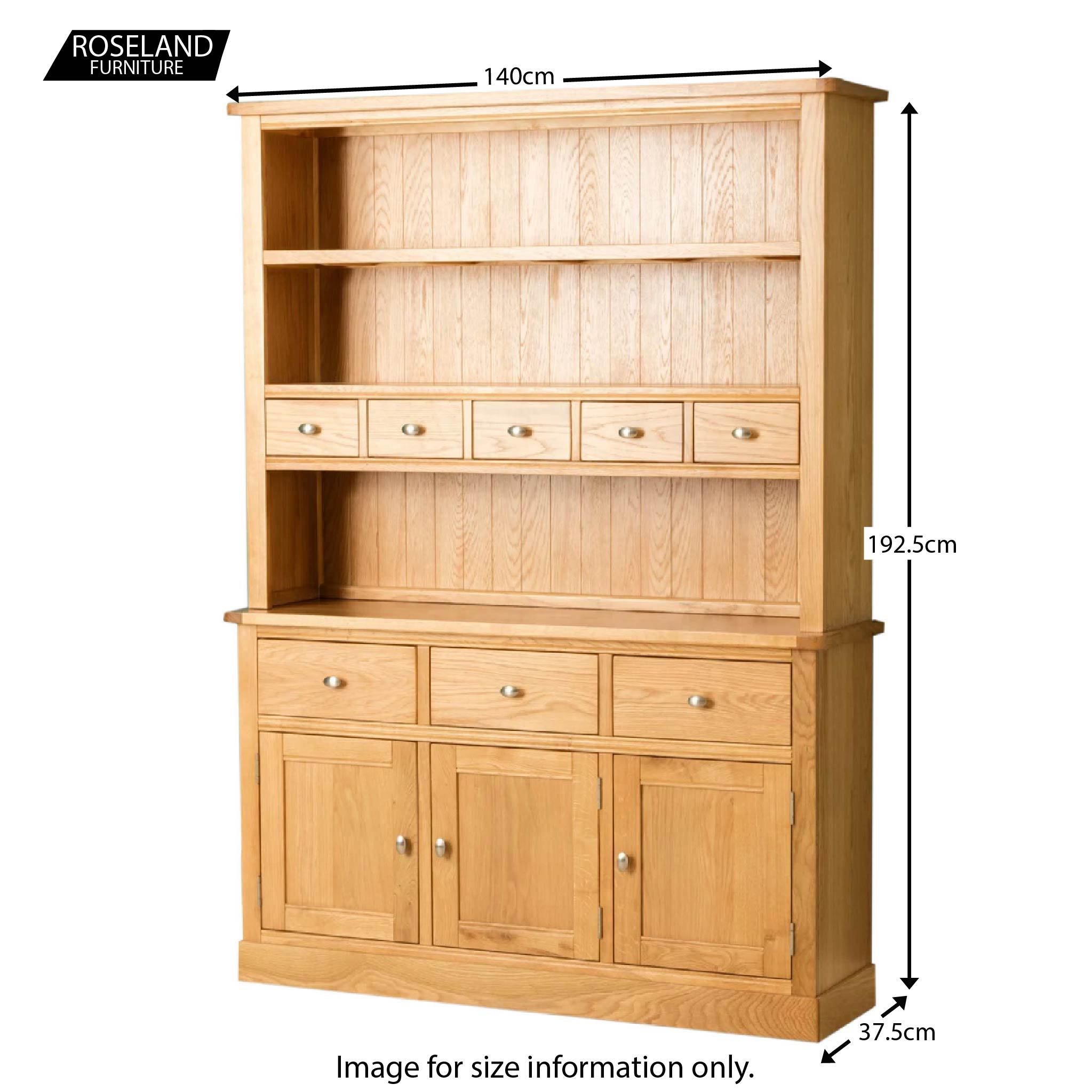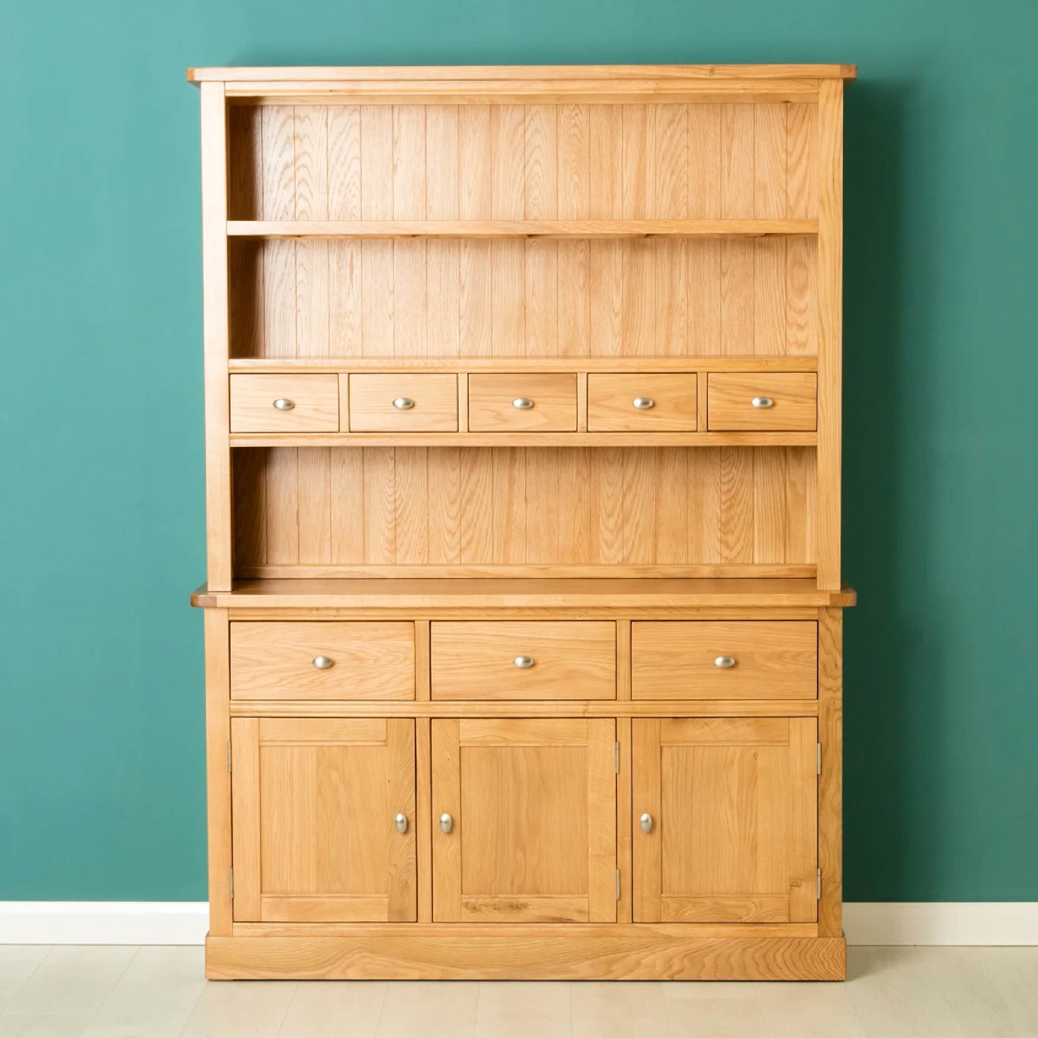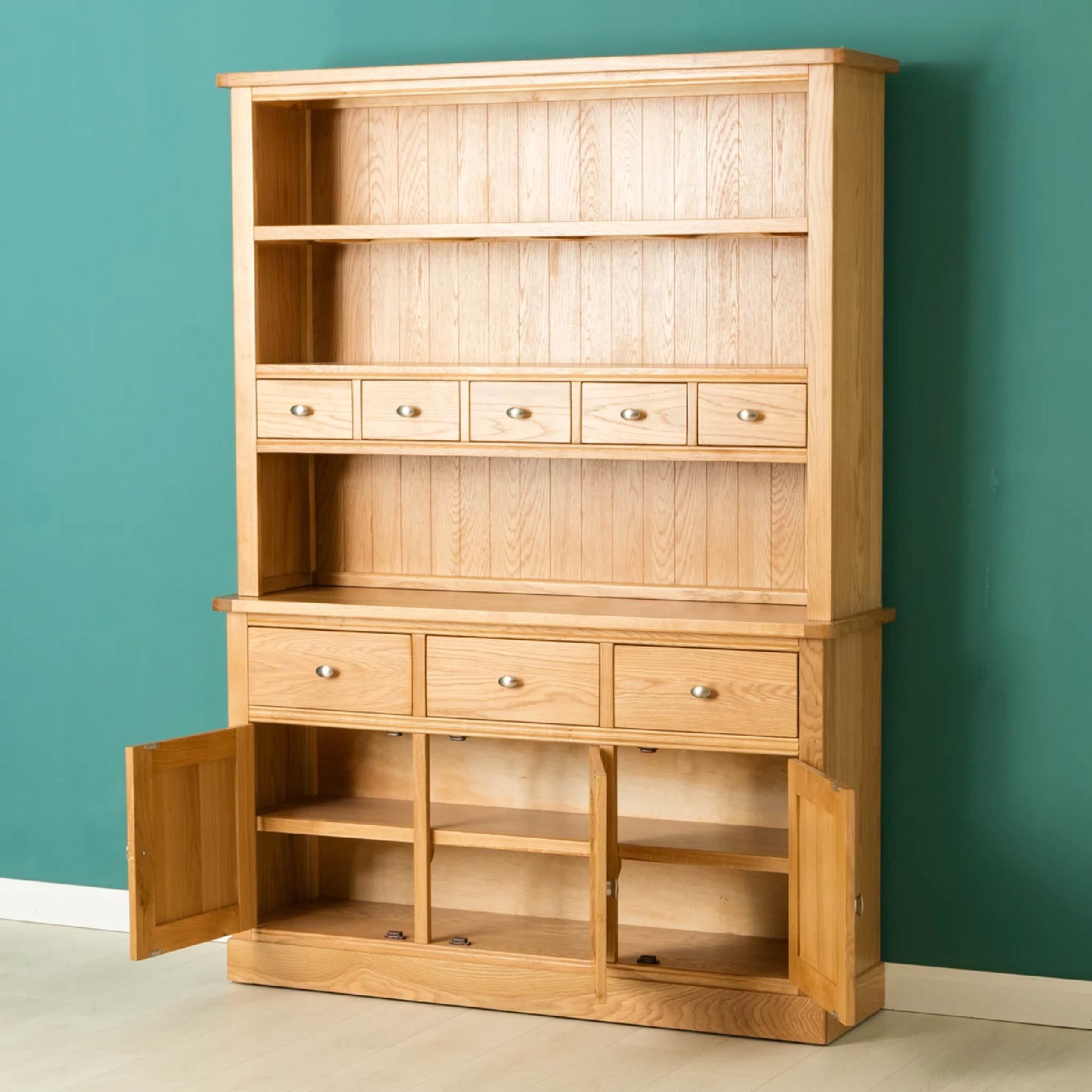 This Dresser has a traditional design style and features 5 drawers providing ample storage. As well as the drawers on the top of the unit the base feature 3 large drawers and 3 large cupboards. This is perfect for a kitchen or dining room. The shelves have been designed to create a large display space. The light oak colour of the Hampshire range is becoming increasingly popular and is suited for any home.