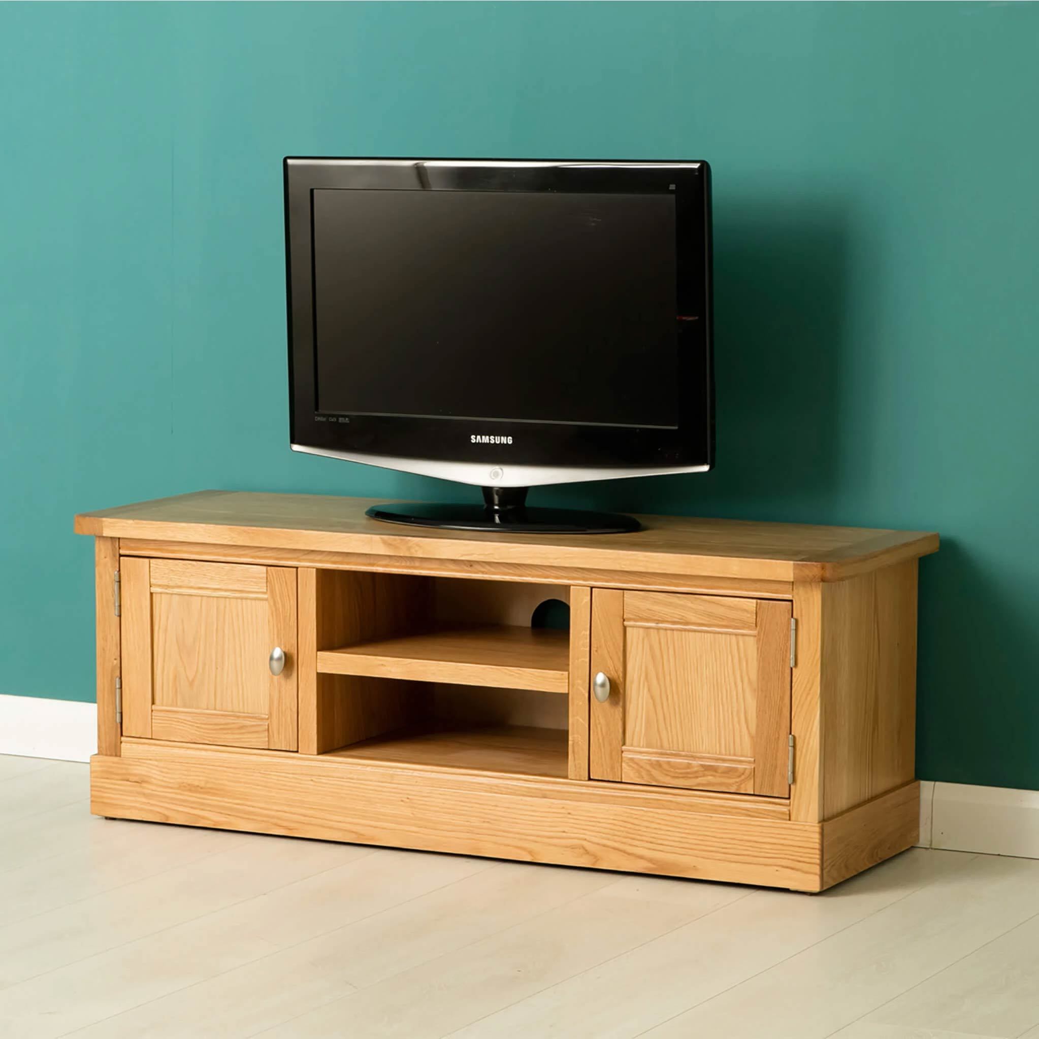 This large TV stand features two large cupboards providing ample space to store DVDs / CD's and other accessories. Built from oak and carefully selected oak veneer with pine for its internal sections this TV stand allows for a large wide-screen TV. There is a cable hole in the back to ensure you wires are neatly tucked away. Its light oak colour carries a contemporary style which is becoming increasingly popular.