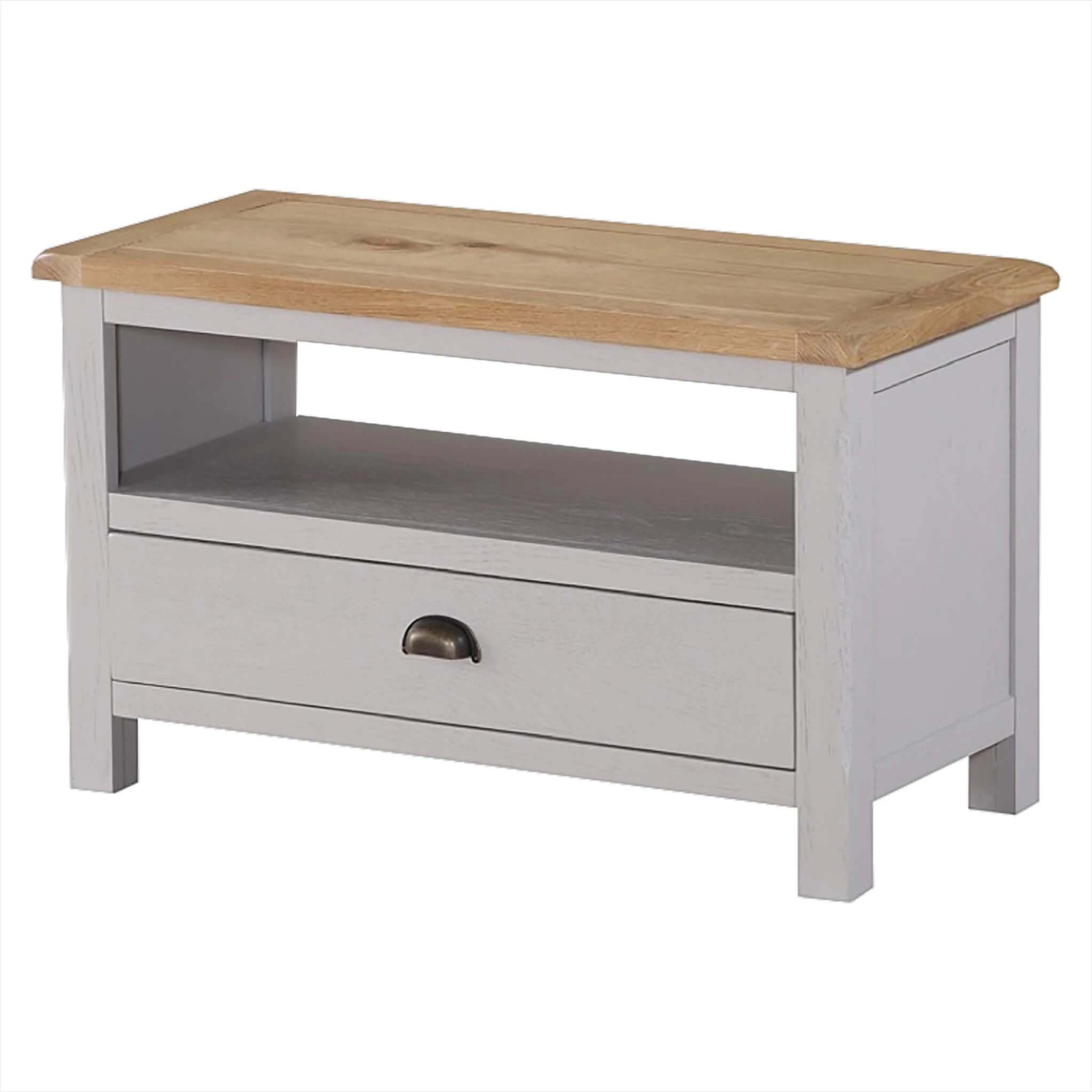 A beautiful Antique Grey painted Small TV stand, with contrasting oak top. The Kilmore Painted small TV stand has an open upper shelf, with open rear and a large spacious lower drawer. With modern cut out handles the drawer is the perfect place to store spare cables, extra remote's, important instruction manuals, etc. Delivered fully assembled, just un-box and you're ready to go!