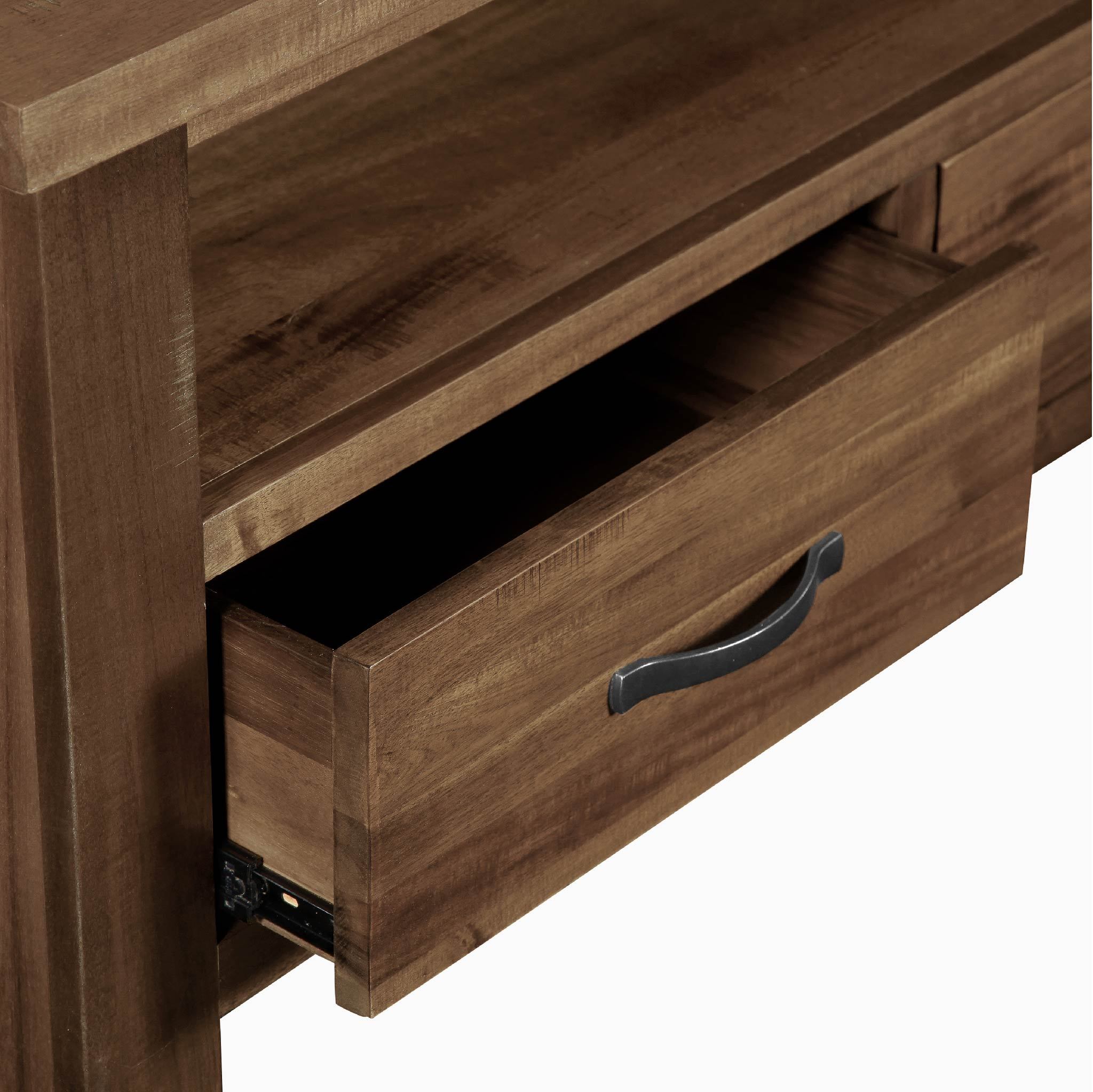 The collection is created from Acacia wood, which gives a lovely warm, rich and homely feel. The finish features authentic tool marks and abrasions, which adds personality to each piece of furniture making no two pieces identical! The brushed metal drawer and door handles give a slight industrial note to this beautifully rich contemporary range, which would suit a vast number of interiors and styles.