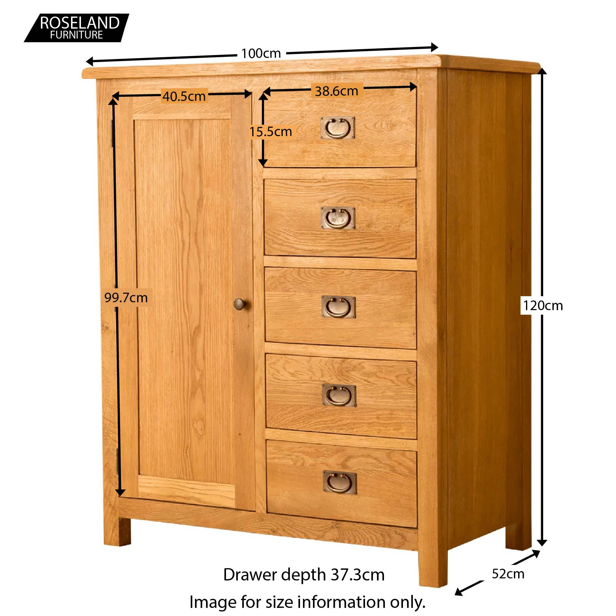 The compact Lanner Combination Wardrobe is incredibly practical and perfect for modern living. Combining hanging wardrobe space, with five drawers it's the perfect combination of wardrobe & chest. The drawers are built with dovetail joints, and the item is delivered fully assembled. Ideal for a spare room, studio, or if space is at a premium.