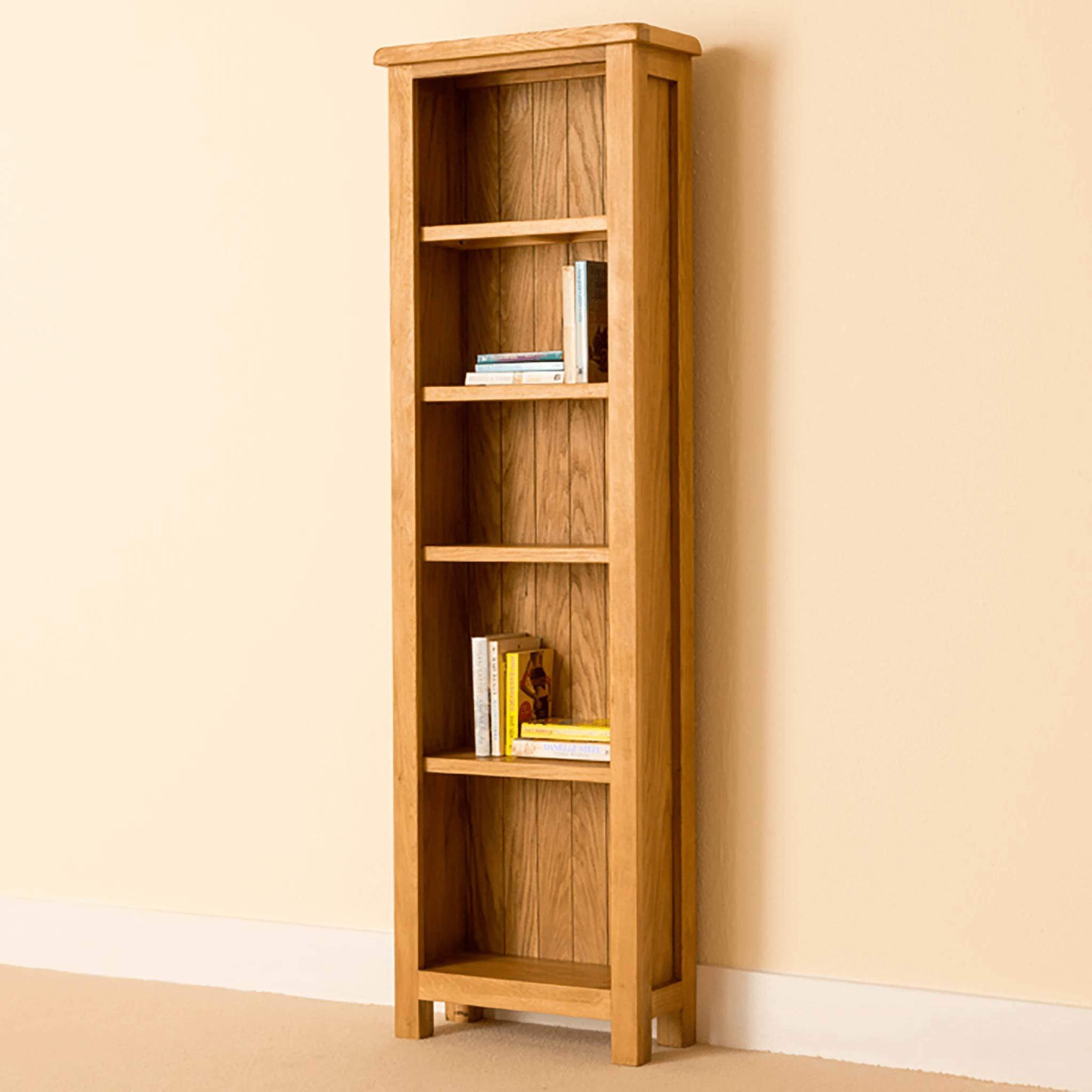 Our Lanner Oak tall, slim bookcase is crafted from high-quality oak and designed to fit into any room where space is of the essence. It features five fixed shelves, the rounded edges of each piece gives a stunning rustic look that adds charm to your room.
