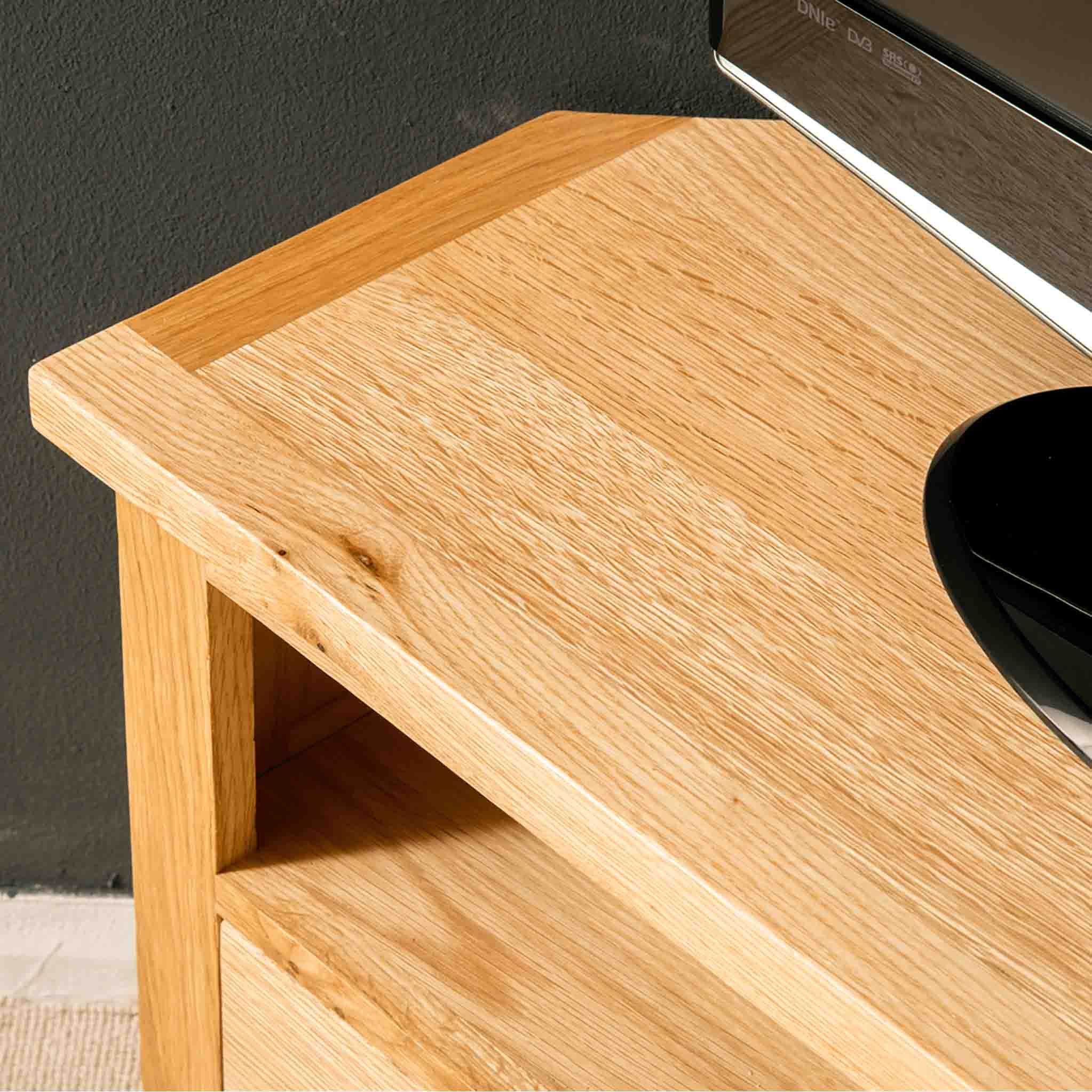 This corner TV stand is part of our exclusive London Oak range. Featuring a large drawer below a spacious shelf, there is a hole cut into the back of the unit behind the shelf to allow easy cable management. Crafted from solid oak with solid wood internals the unit provides a modern, contemporary style with its polished metal handles and light lacquered finish.