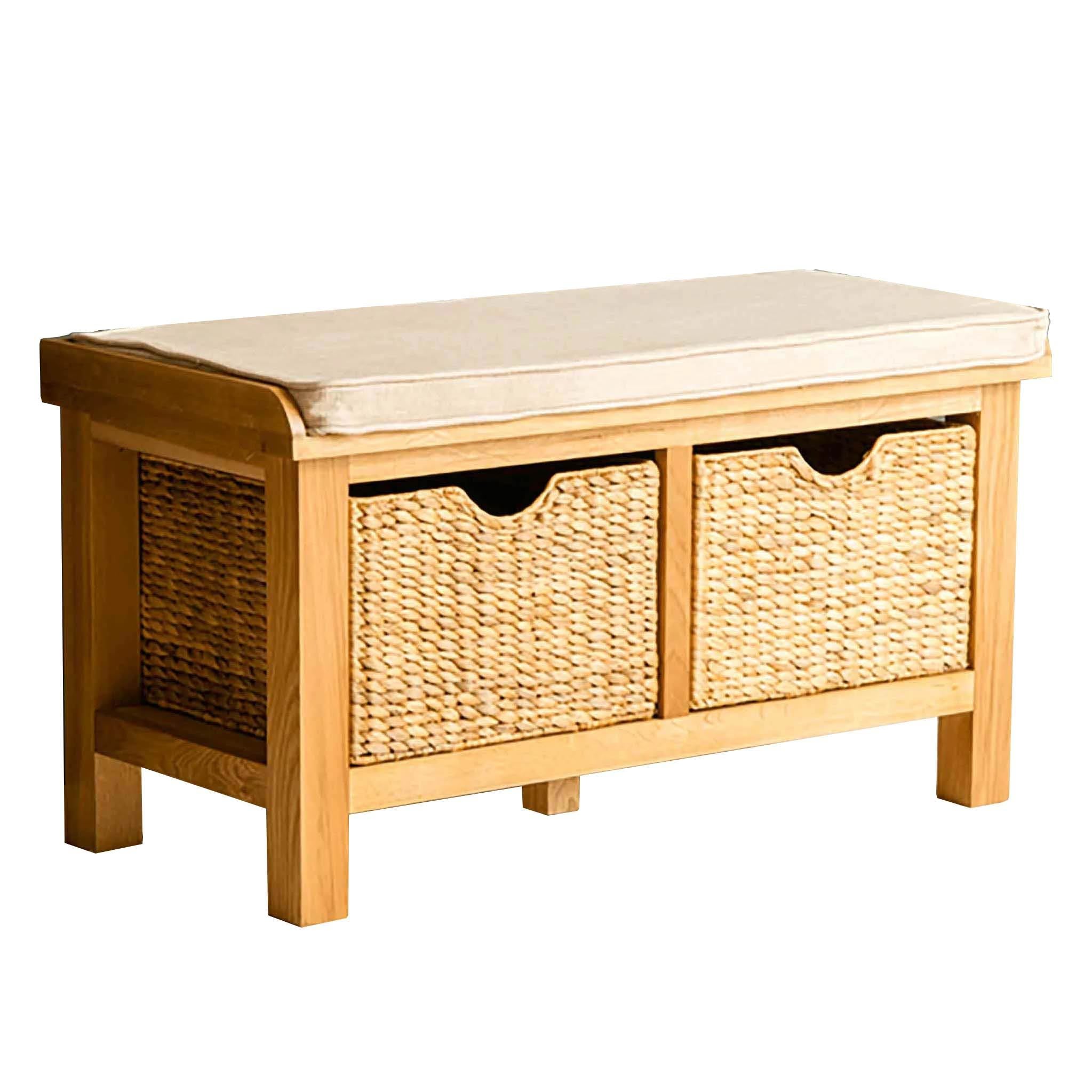 This stunning light oak hallway storage bench featuring 2 large country-style hand-woven baskets perfect for storing shoes, toys, or blankets and carries a modern design. With a comfortable cushion, it would look great with or without in any hallway or bedroom.