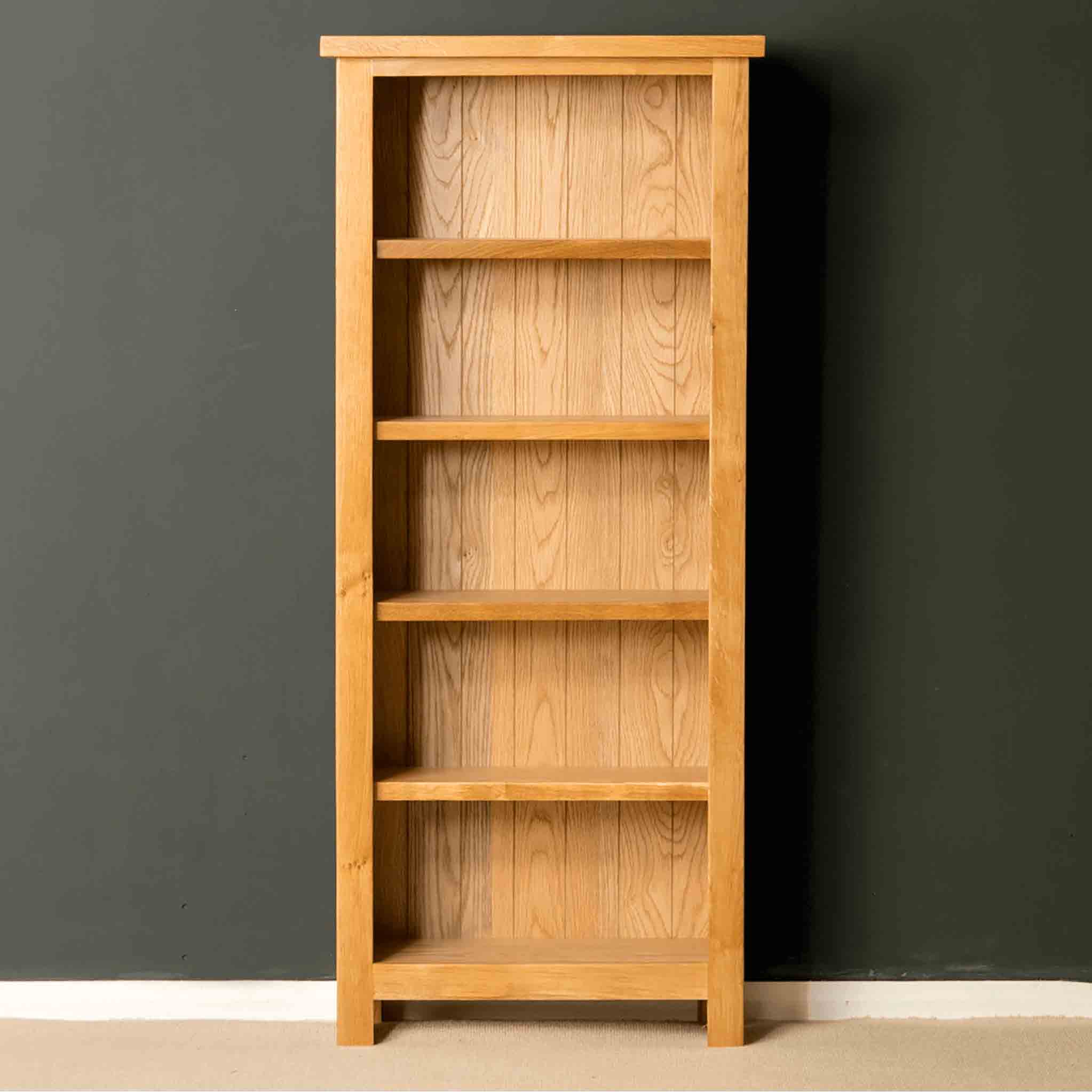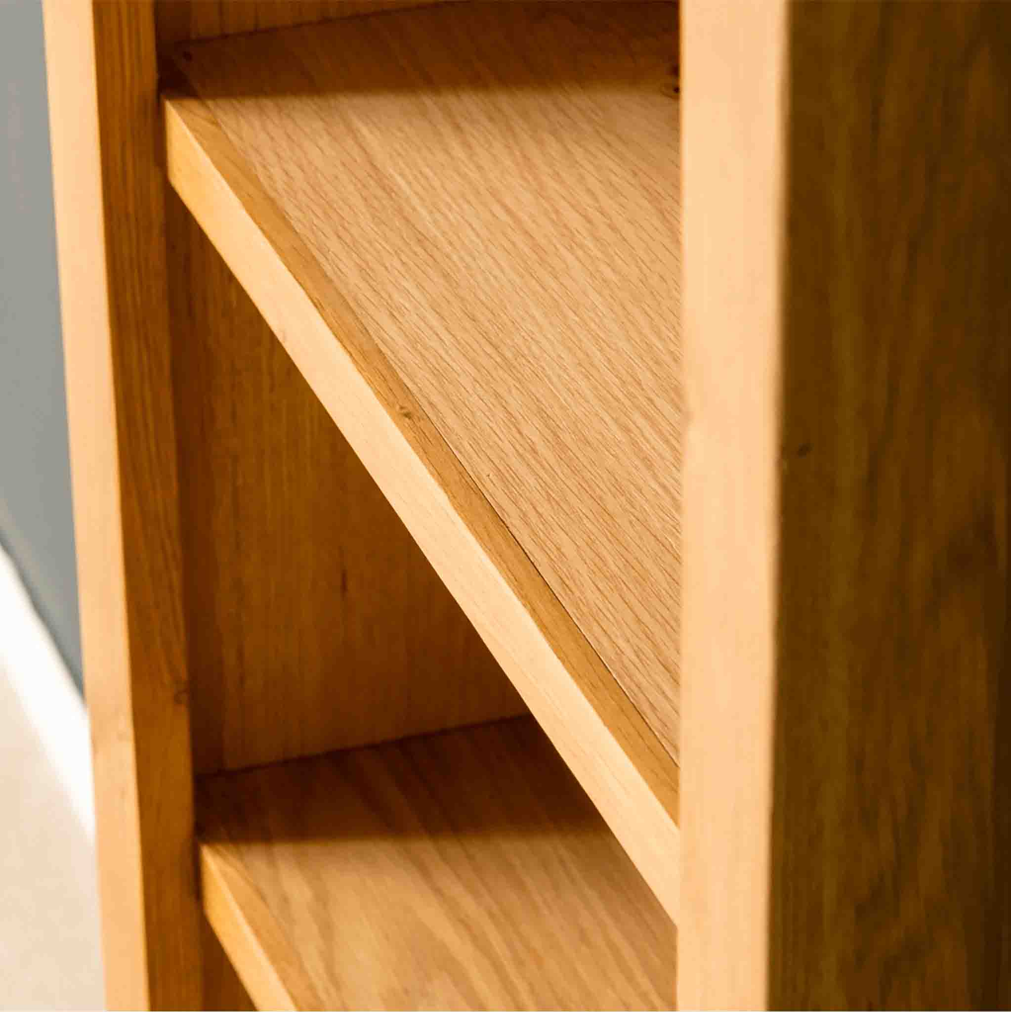 The London oak slim bookcase is the narrowest of the three bookcases within the London Oak furniture range ideal for tighter spaces. Beautifully crafted from oak with pine supports the unit is carries a modern contemporary style whilst offering excellent storage space with its five shelves. The shelves are fixed and nonadjustable.