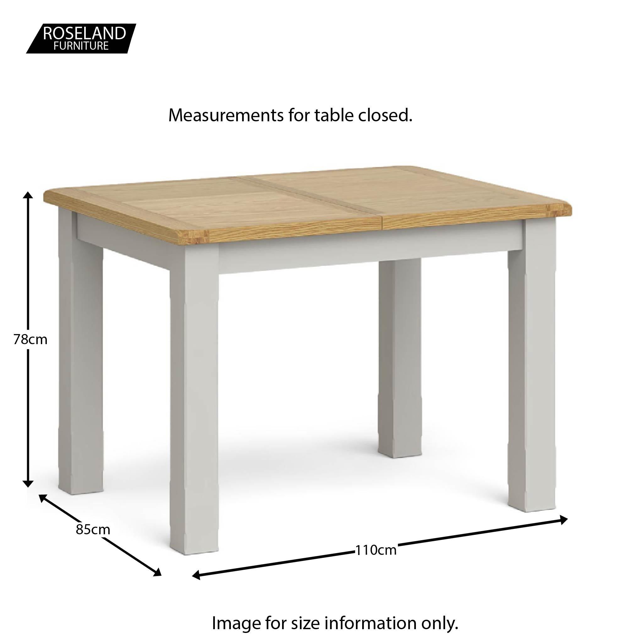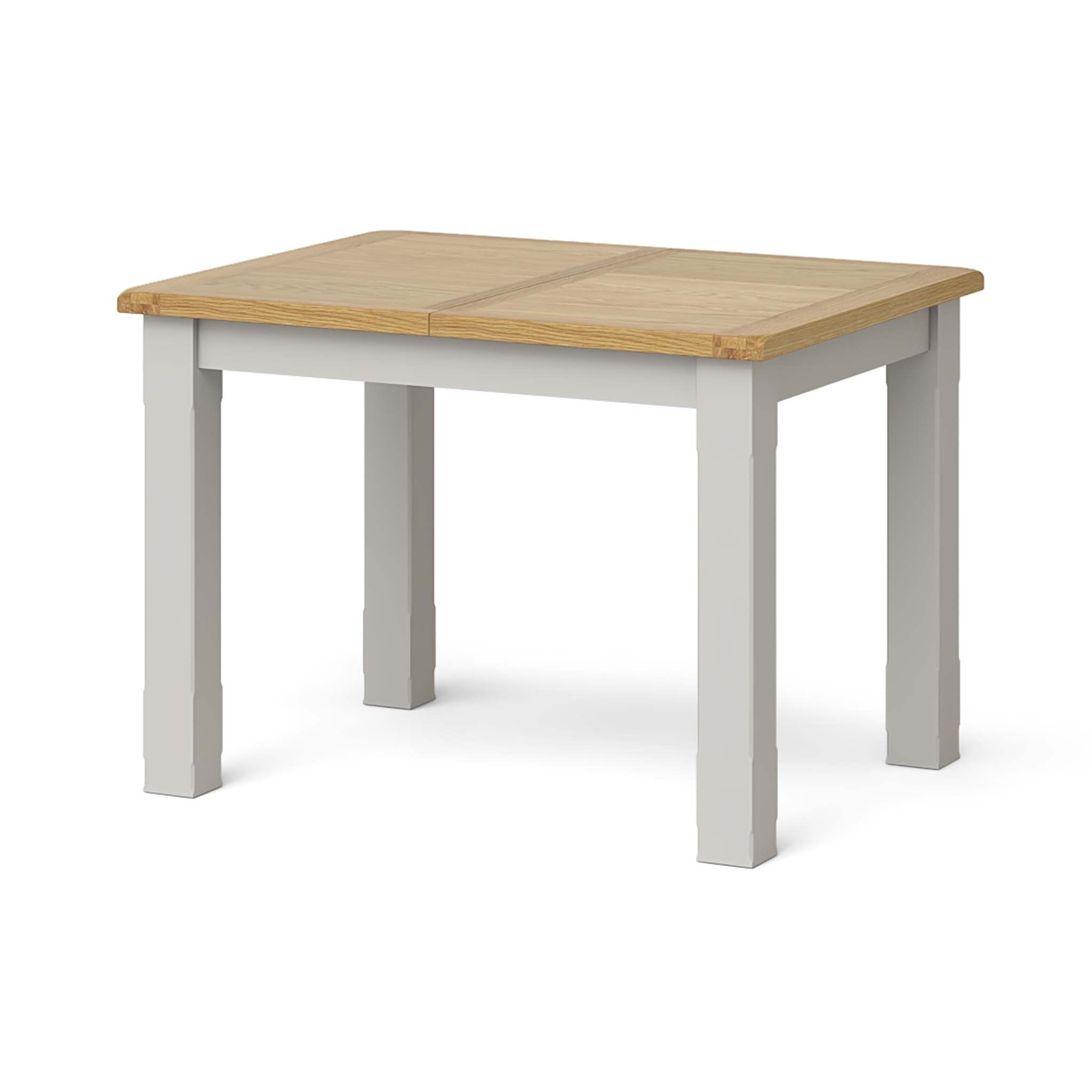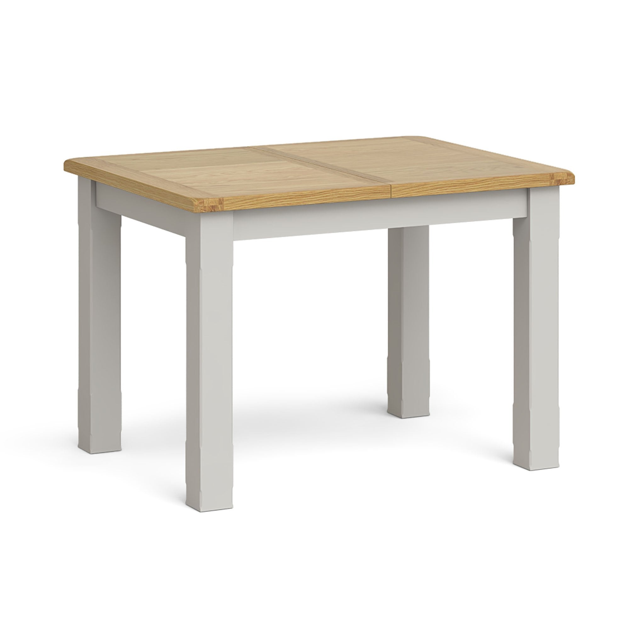A great compact extending dining table, this Lundy Grey extending table is ideal for those smaller dining areas, this table extends from 110cm to 150cm. The frame is made from solid wood and finished in the Lundy Grey paint with a beautiful oak top which has been finished to enhance the natural grain of the wood, giving a great look to your dining area. Add our Lundy Grey dining chairs or benches to really give this table the perfect finish.