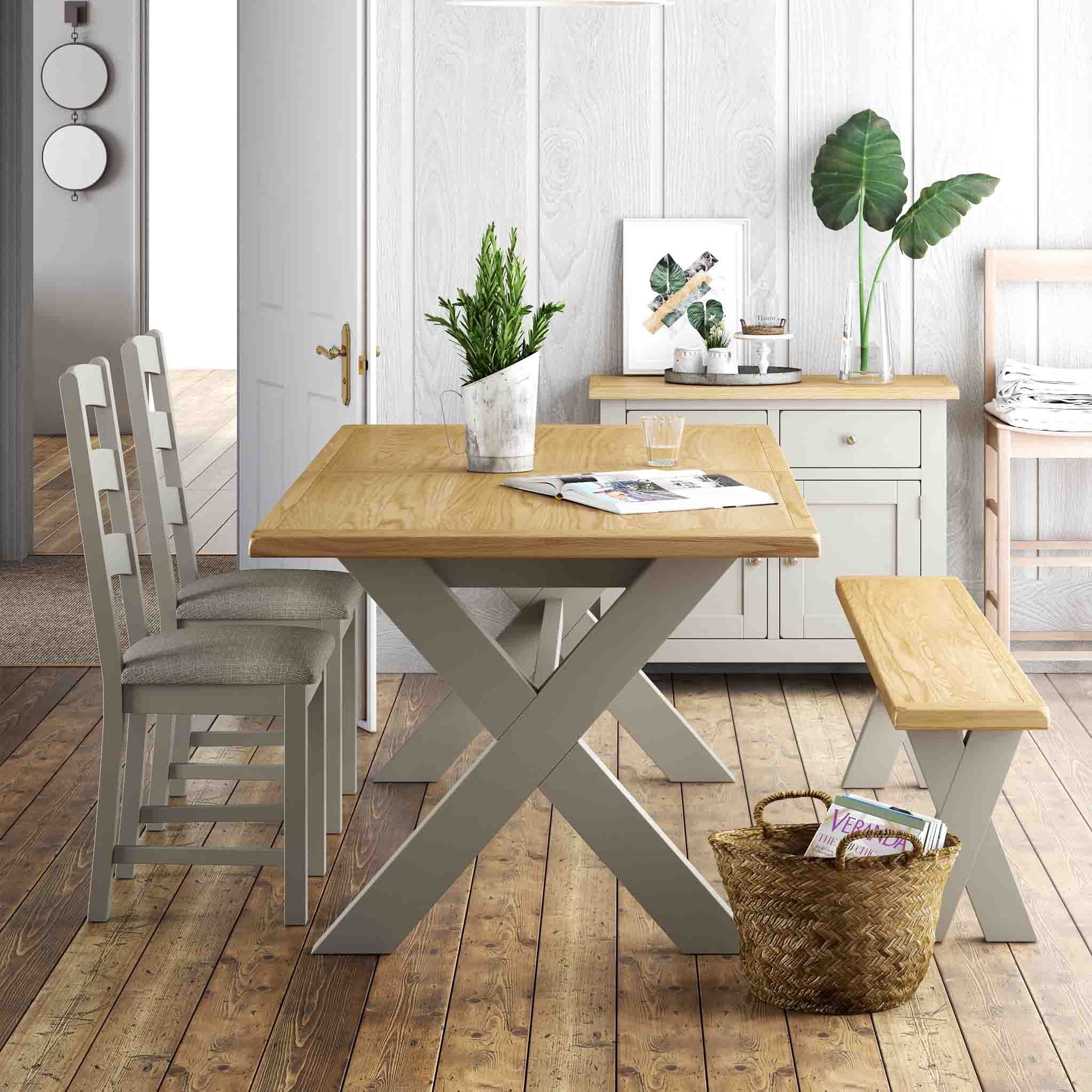 A great sized extending dining table, this Lundy Grey cross-sectioned, oak topped dining table is just perfect for those social occasions... this table extends from 190cm to an ample 250cm. The crossed sectioned frame is made from solid wood and finished in the Lundy Grey paint with a beautiful oak top which has been finished to enhance the natural grain of the wood, giving a great look to your dining area. Add our Lundy Grey dining chairs or benches to really give this table the perfect finish.
