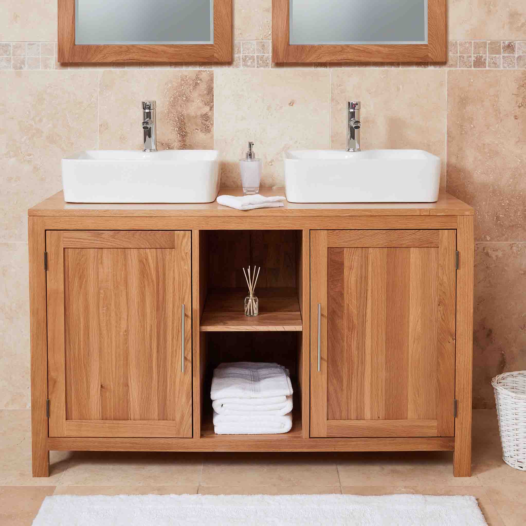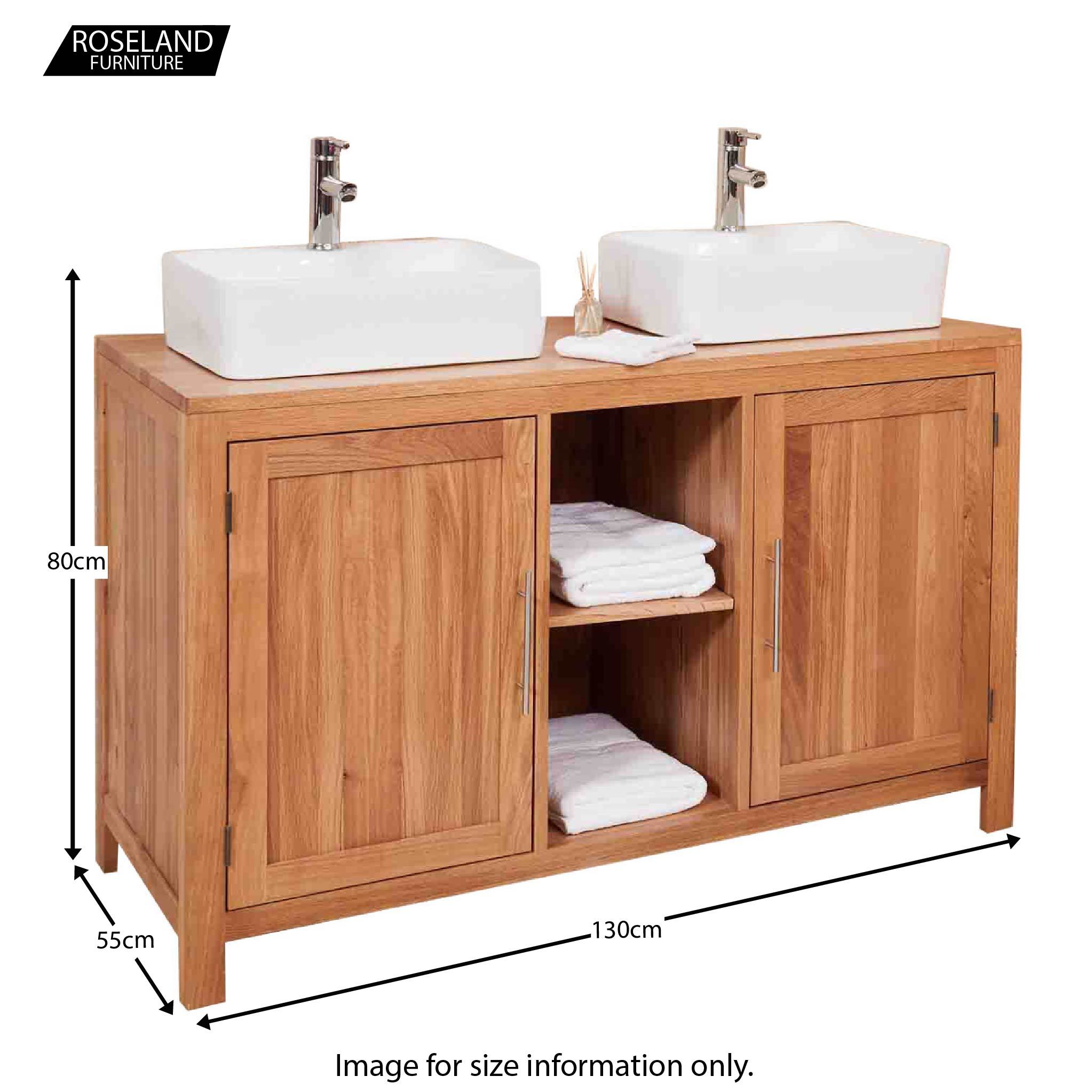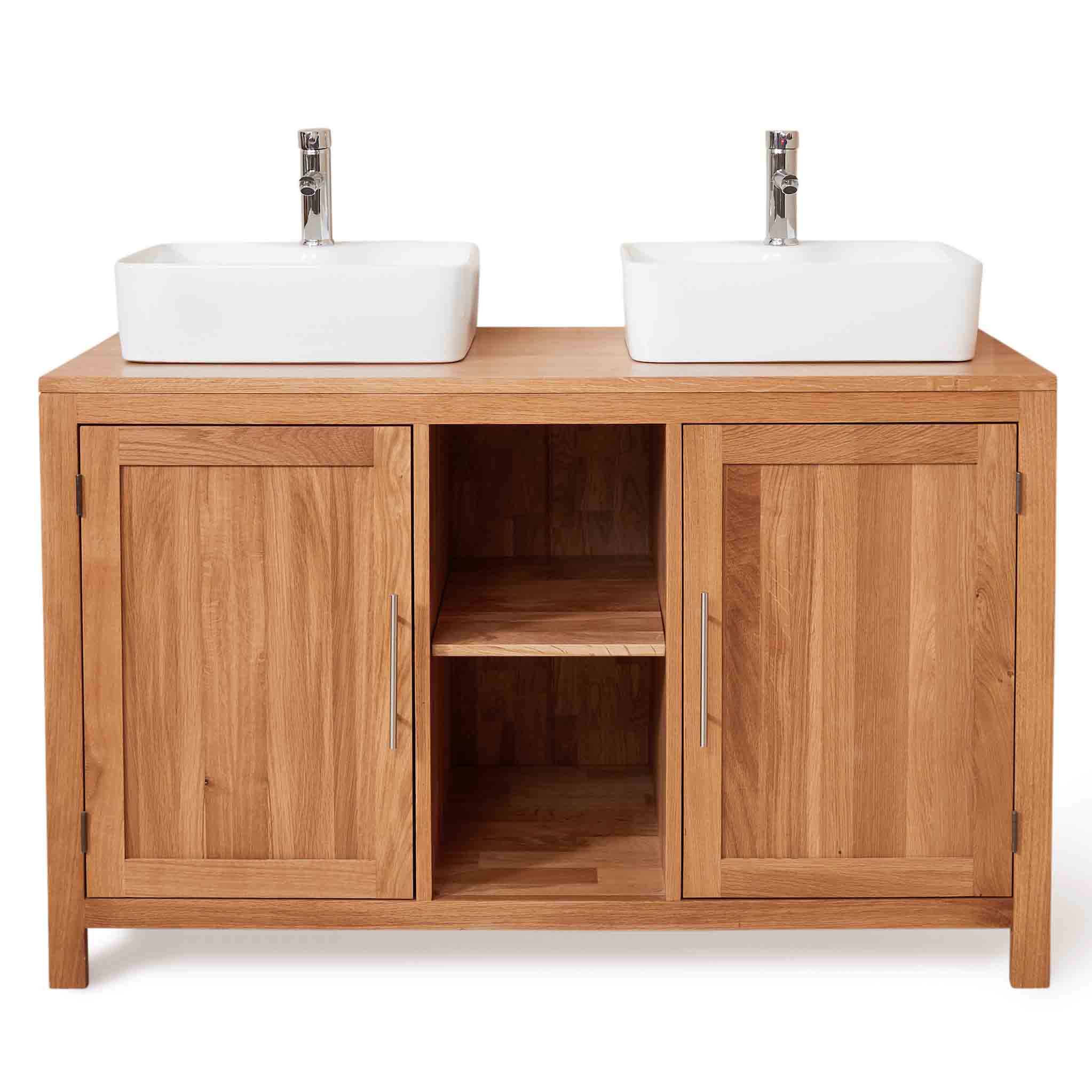 This generous and stylish, twin oak bathroom sink unit is ideal for large bathrooms and master bedroom en-suites. Crafted from the highest grade wood, this beautiful unit has been designed to combine quality and convenience, containing 2 large storage cupboards, ideal for each partner (and also hides the sink waste pipes) with internal shelves and a central open shelf area that is perfect for storing everyday bathroom items such as towels.