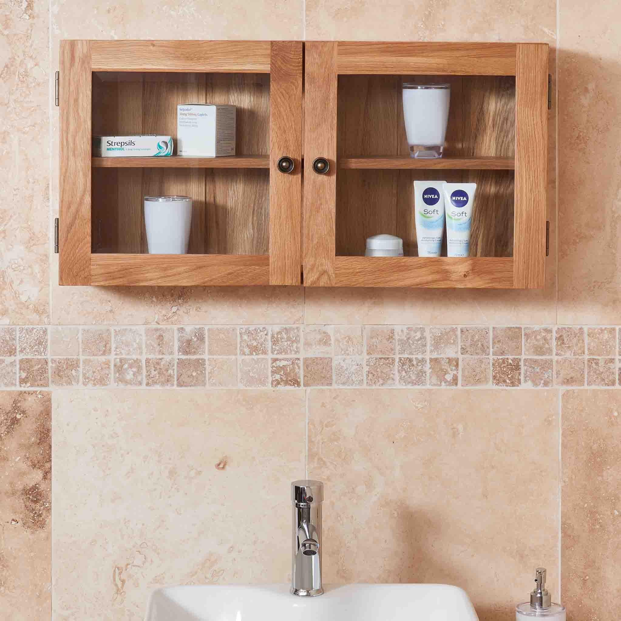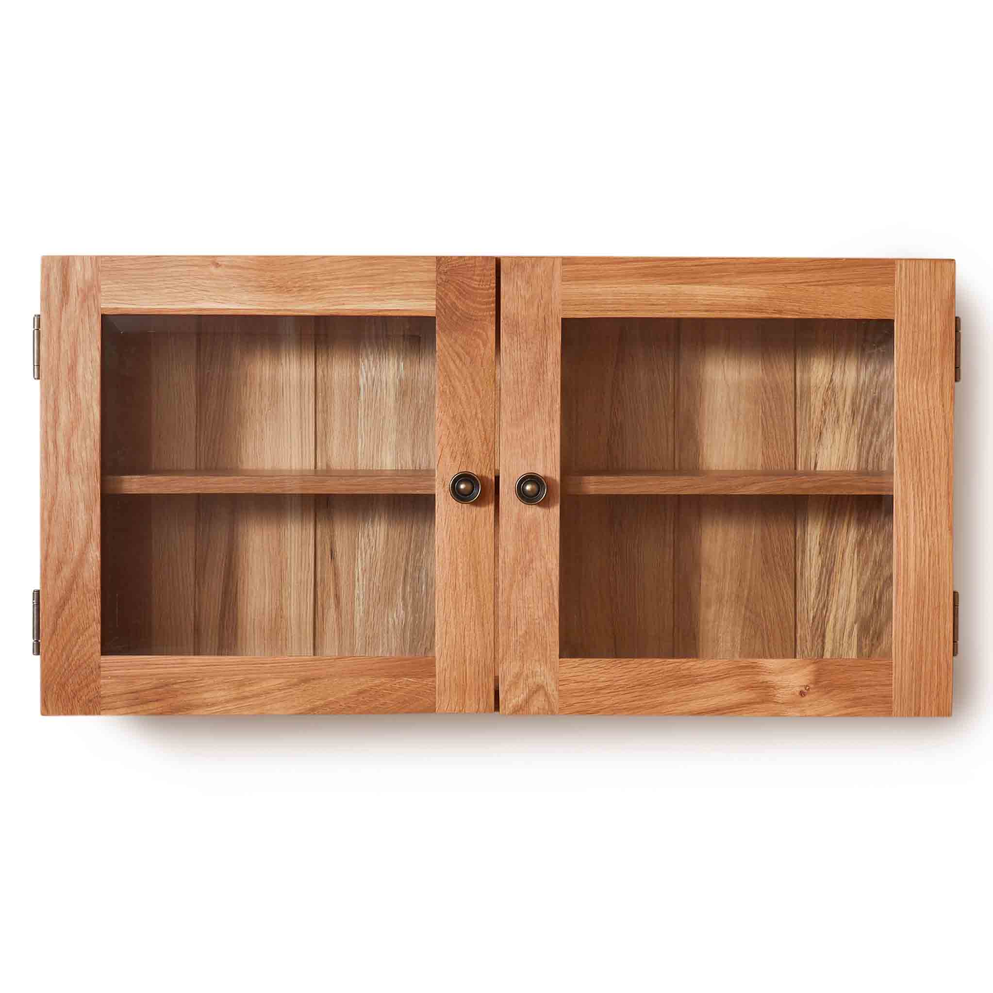 This contemporary oak glass wall cabinet is designed to fit all bathrooms. Crafted from the highest grade wood, this beautiful double glass door storage unit has been designed to combine quality and convenience, featuring 2 glazed glass doors with an internal shelf the cabinet is wall mounted by two hooklets in the top corners, and perfect for everyday bathroom products.