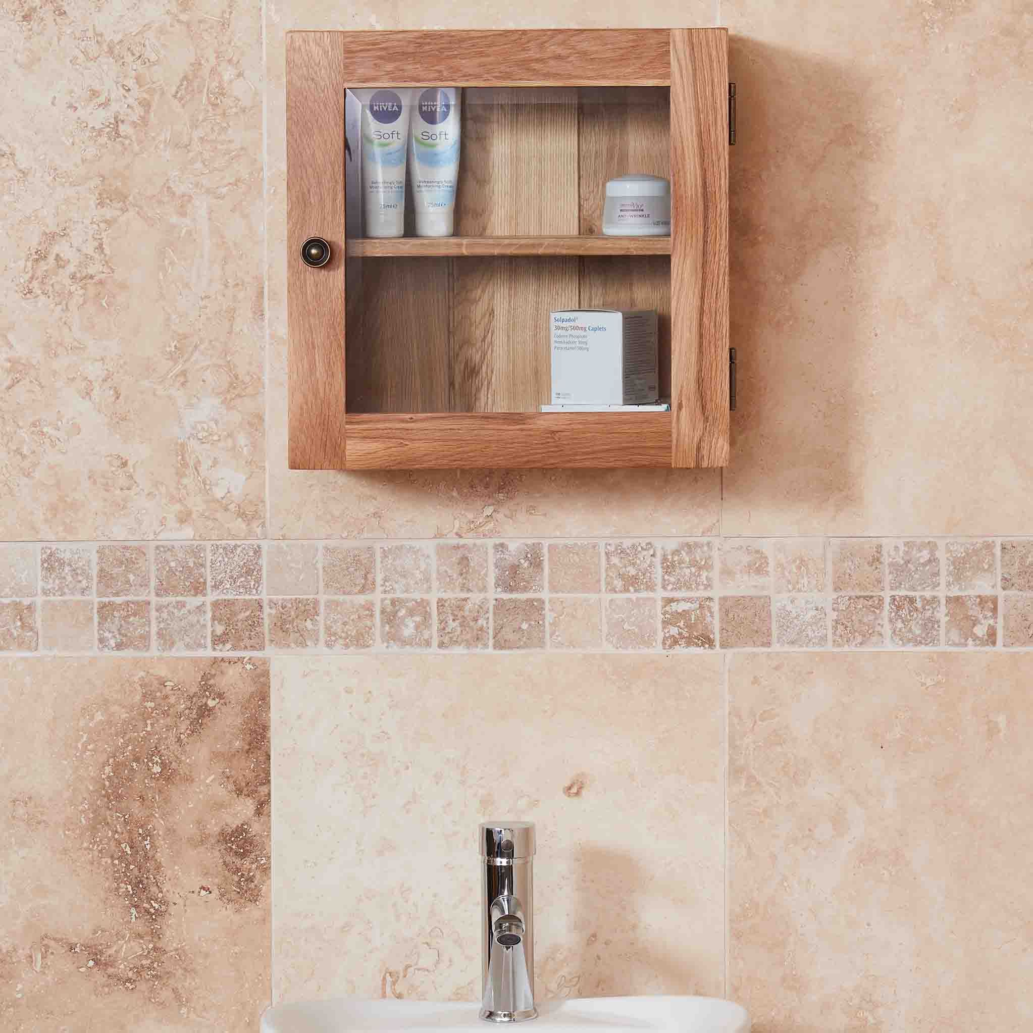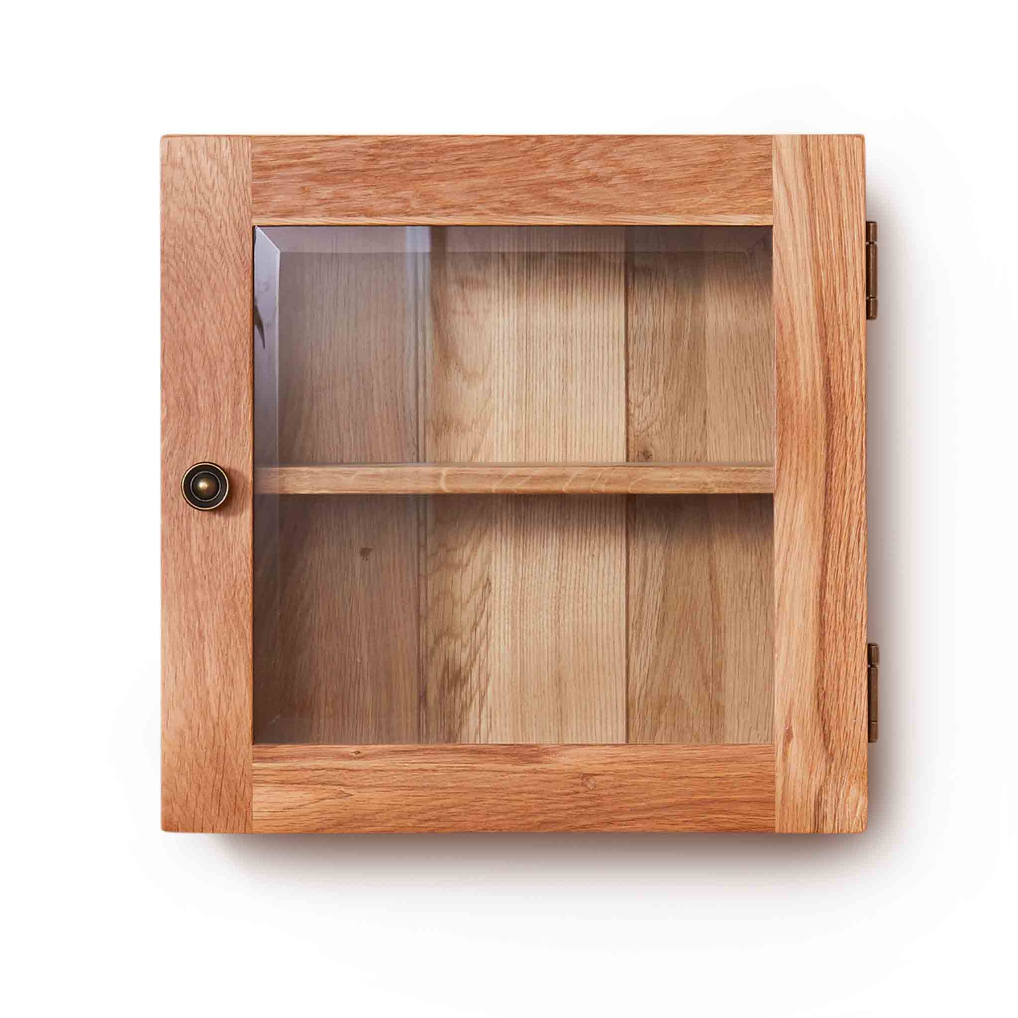 This contemporary oak glass wall cabinet is designed to fit all bathrooms. Crafted from the highest grade wood, this beautiful single glass door storage unit has been designed to combine quality and convenience, featuring a single glazed glass door with an internal shelf this square bathroom cabinet is wall mounted by two hooklets in the top corners, and perfect for everyday bathroom products.