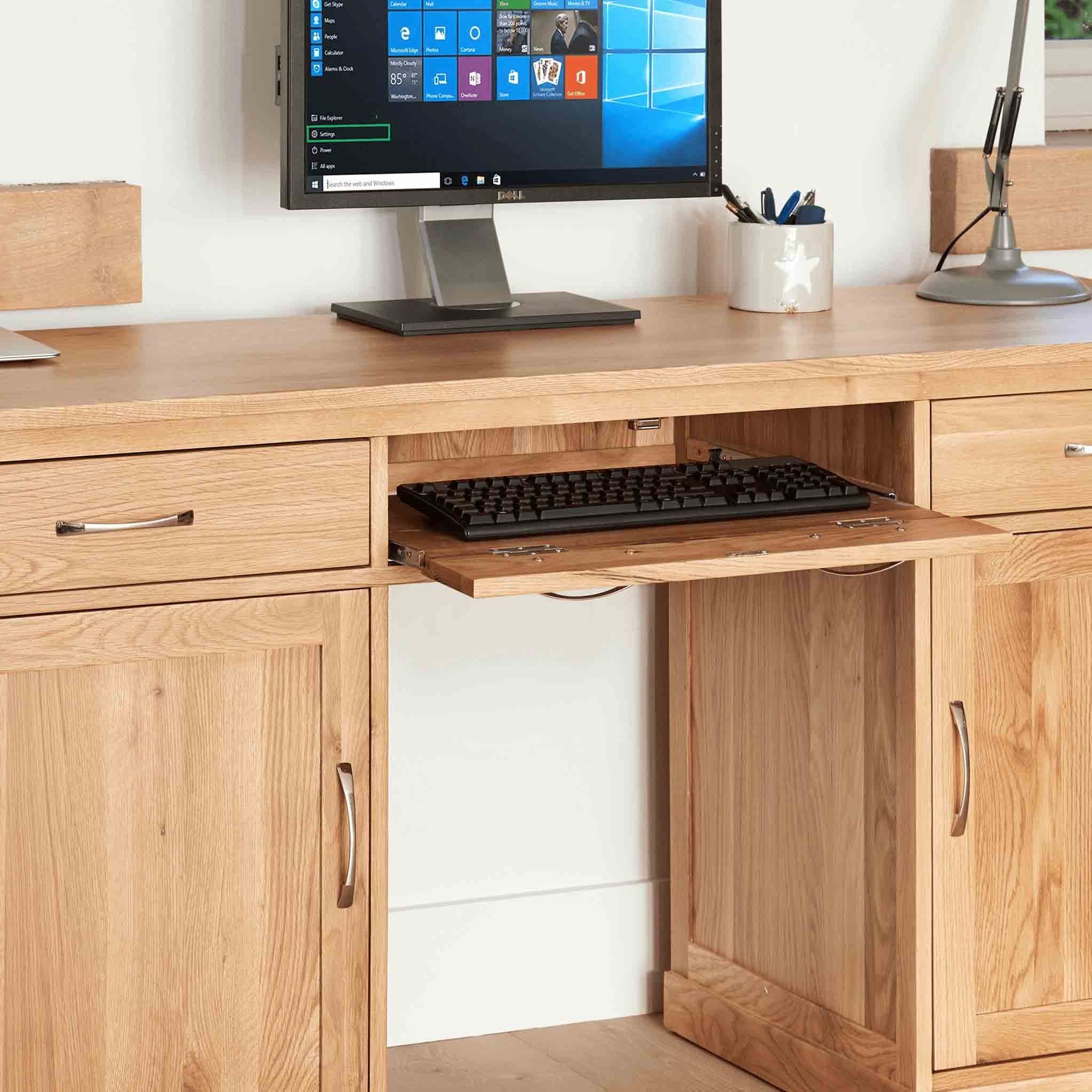 This solid oak large home office/computer desk is from our Mobel range. A contemporary design crafted from the highest grade solid oak, it offers fantastic storage for a complete home office setup. It features a pull out keyboard drawer, a generous deep worktop and two large stationary drawers.The right hand cupboard holds (clockwise from left) A4 paper, (note this shelf is removable), a tower unit, modem, CD/software drawer, wireless router.