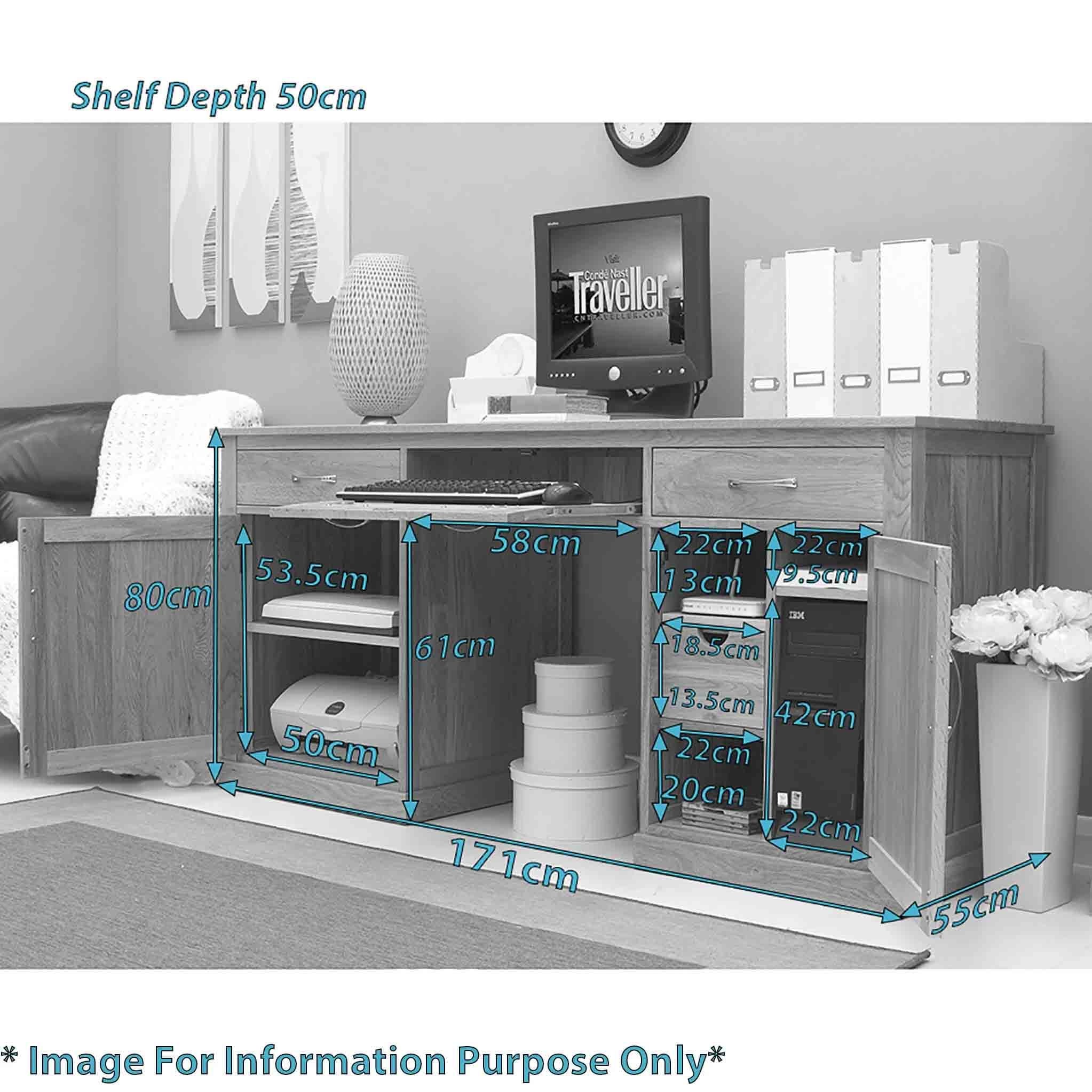 The cupboard on the left is designed to hold a printer and a scanner or any other computer equipment and has a removable shelf. Interior size of the left hand cupboard is H: 53.5cm W: 50cm.
